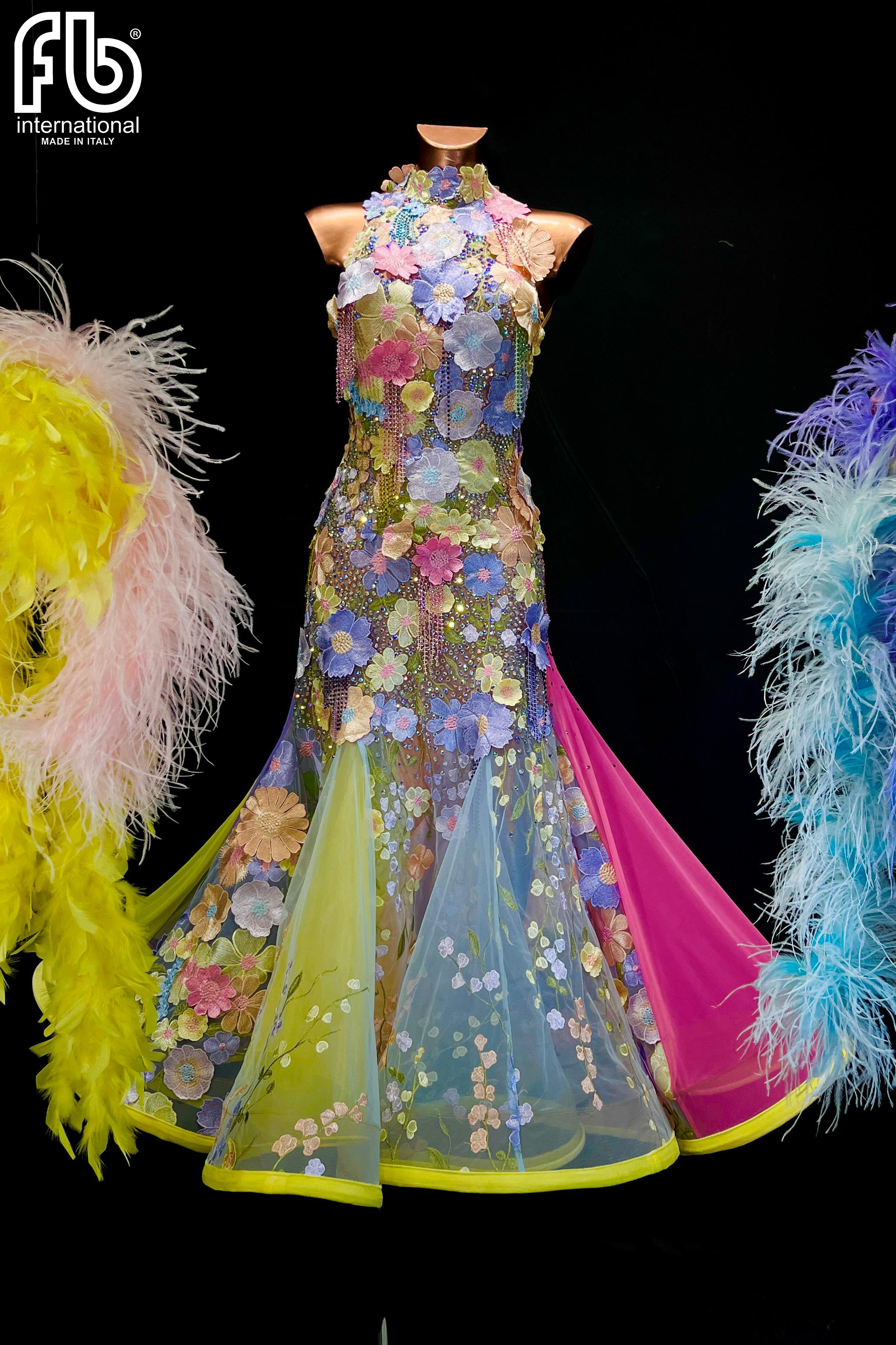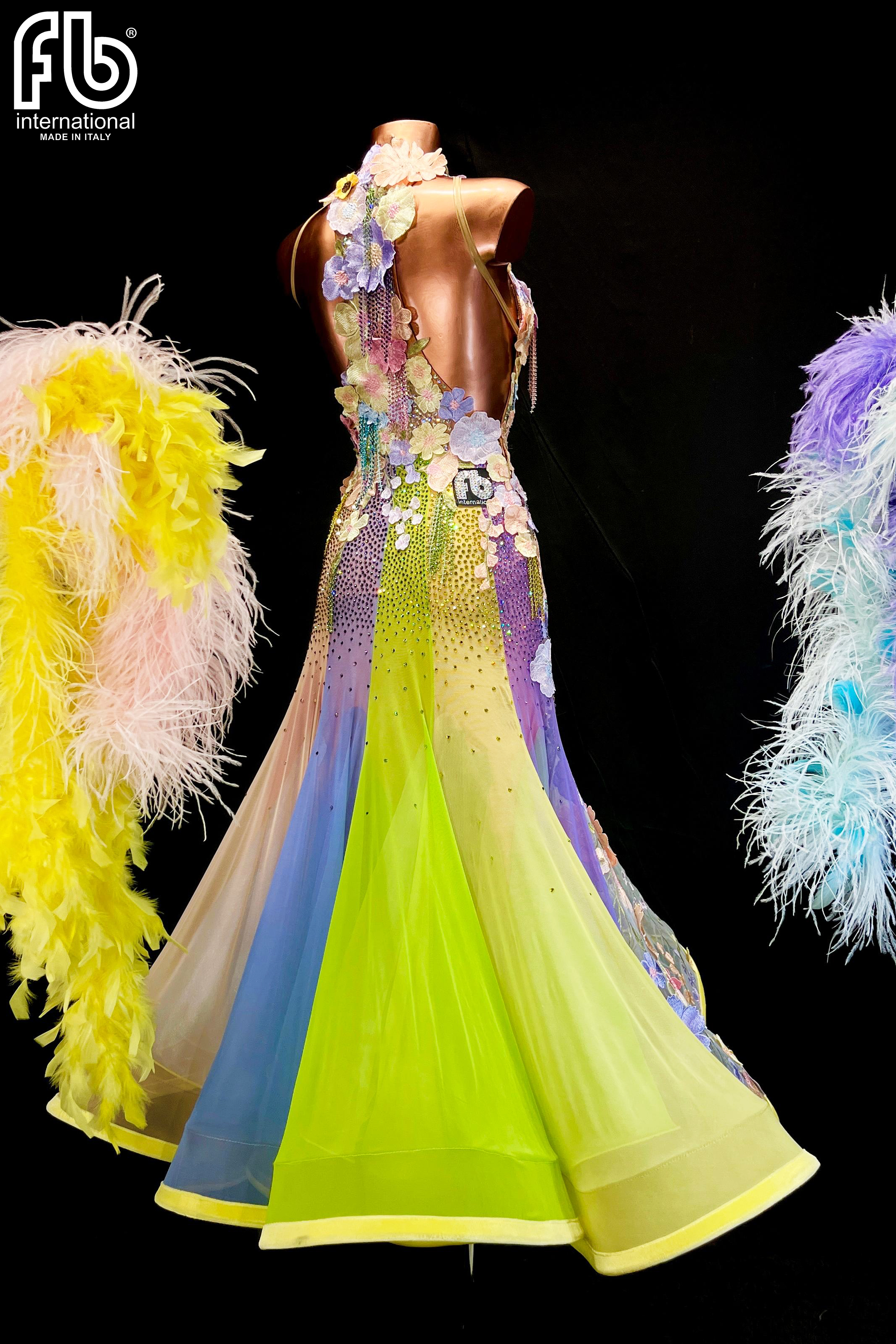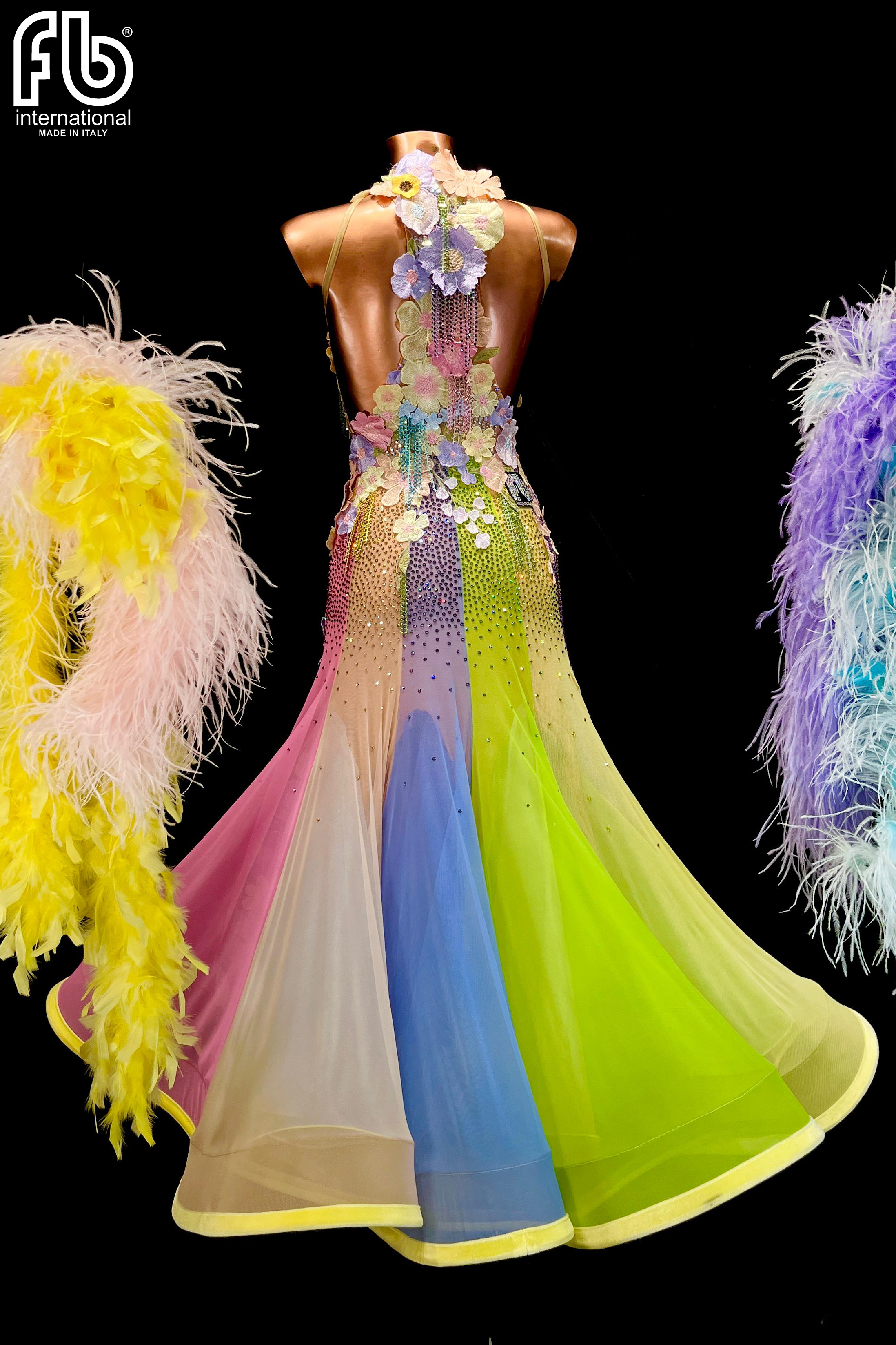 Women's dress for standard/smooth dances made of lace with pastel flowers, rhinestone net fringe and rich AB rhinestone decoration and color mix.