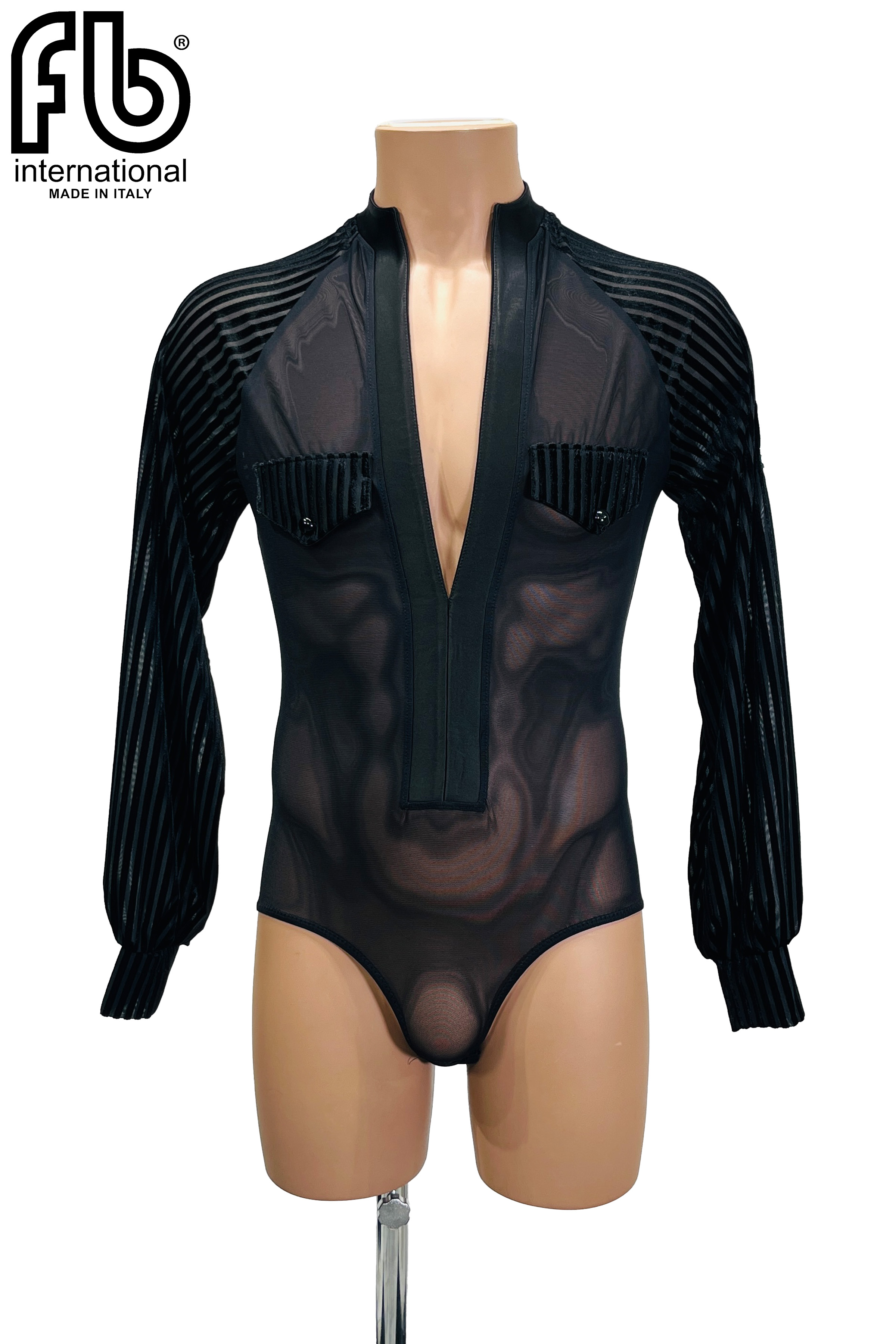 Men's Latin dance shirt made of black mesh and velvet with matching buttons, tight fit.