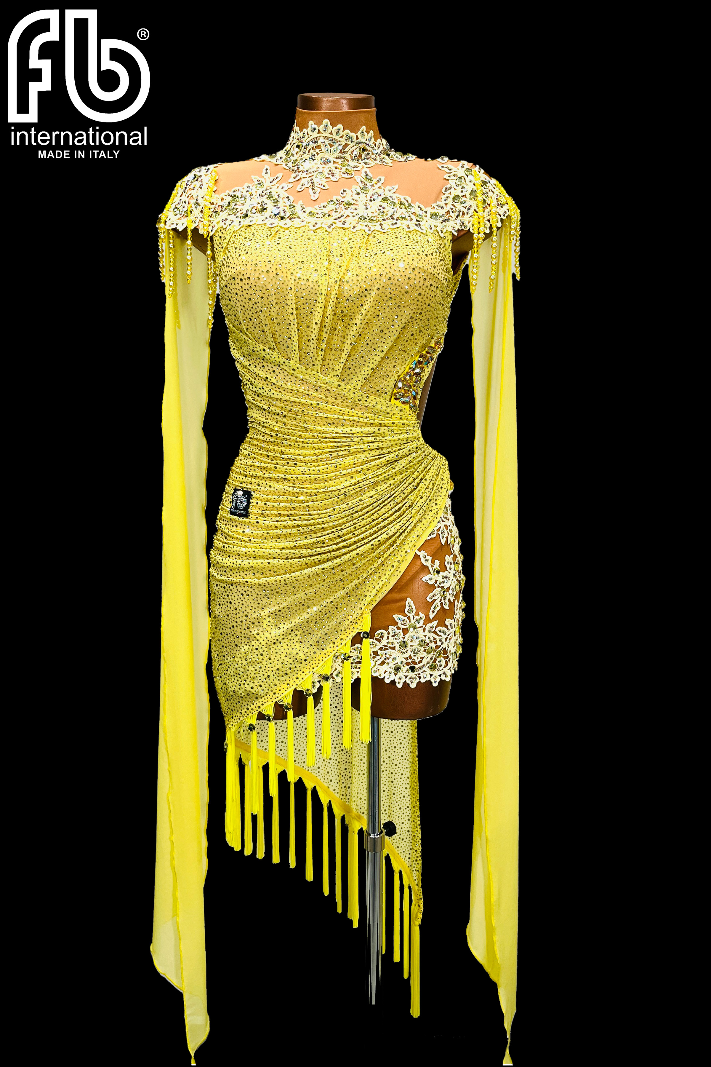 Yellow Latin dance dress with lace details.