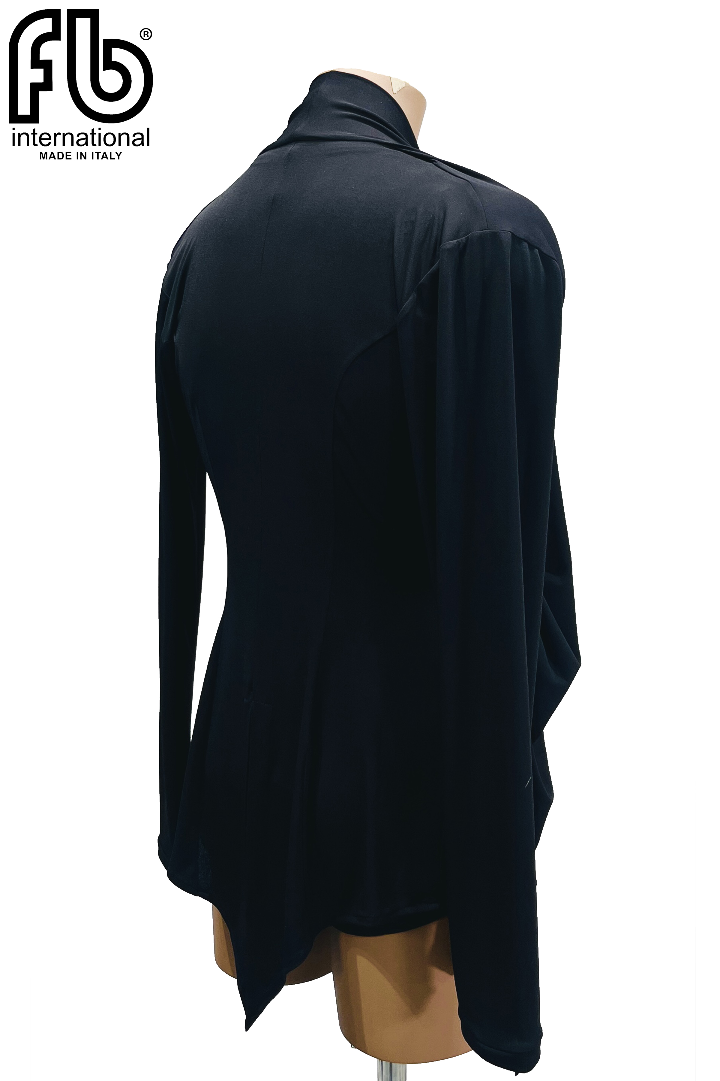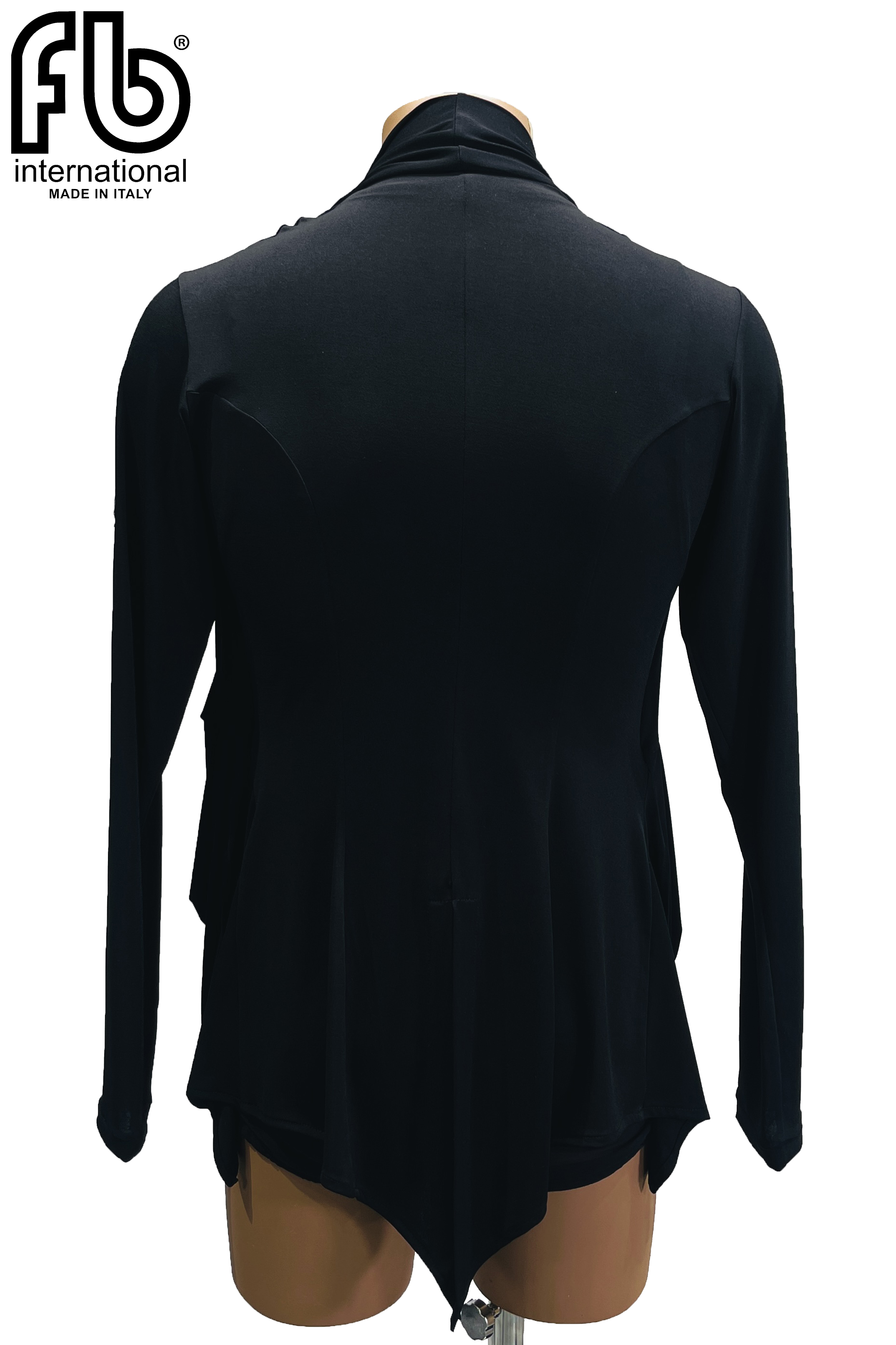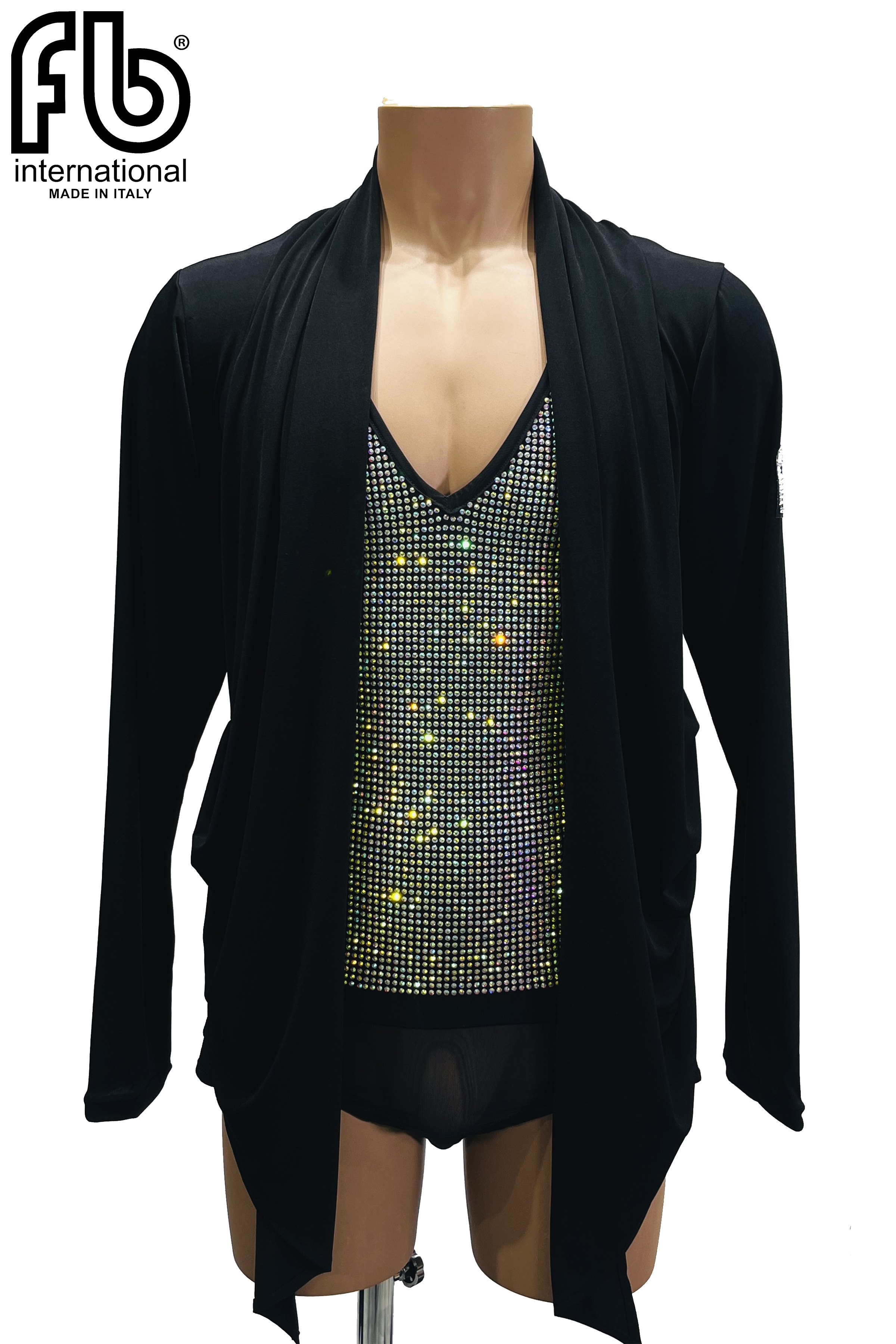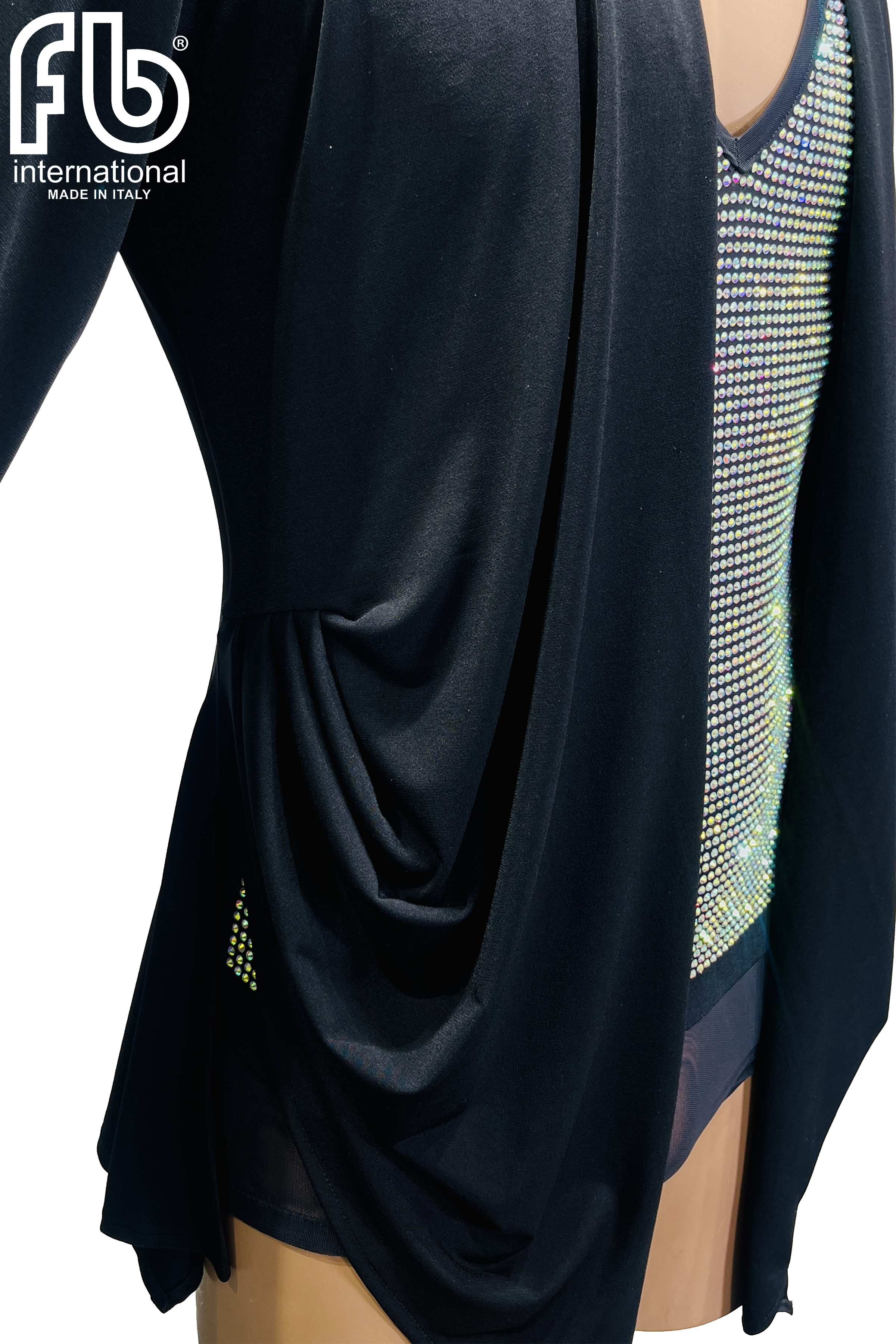 Latin dance kimono with tank top, made of black crepe and AB rhinestone mesh. The kimono features drape-like ruffles on the sides to add volume and movement.