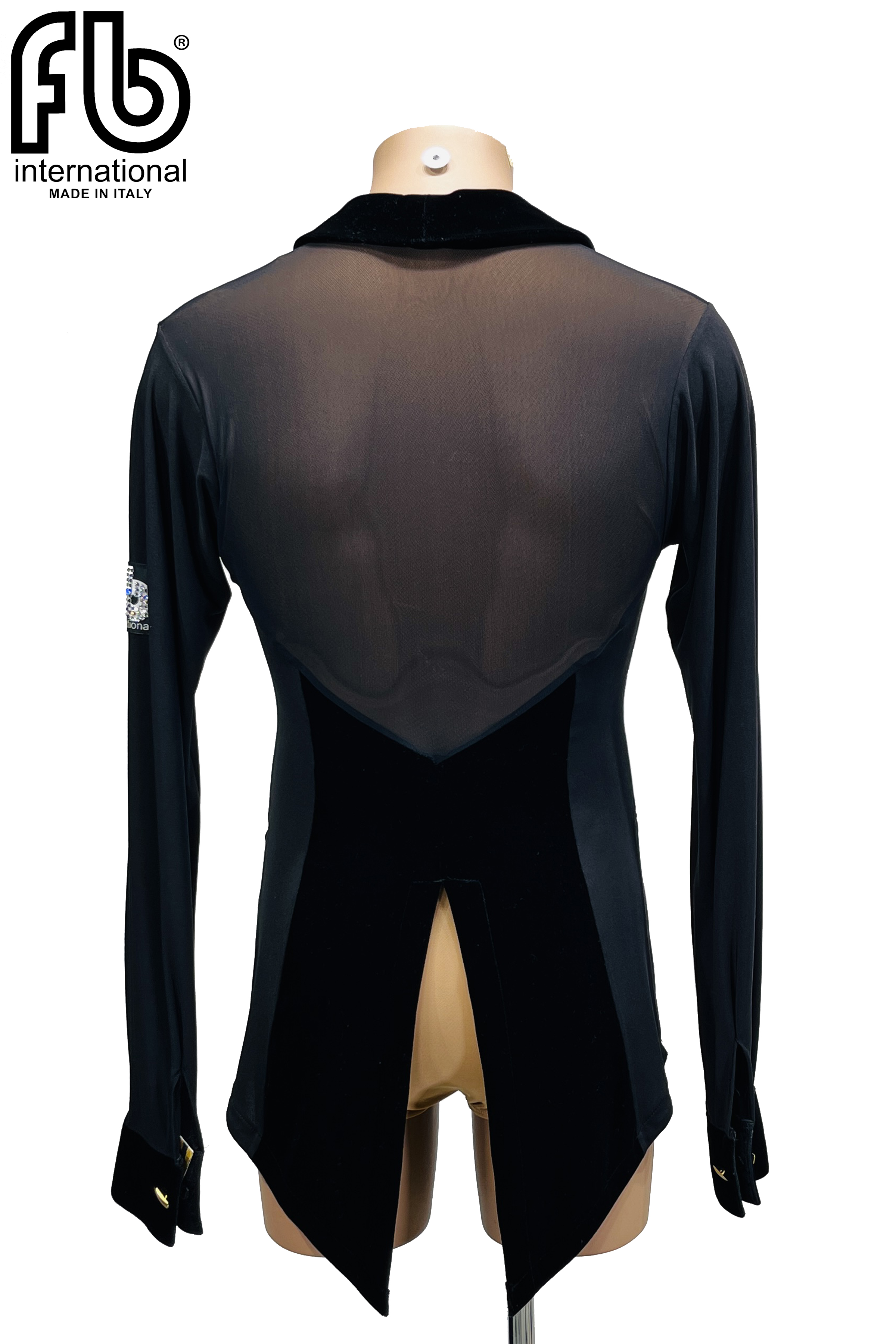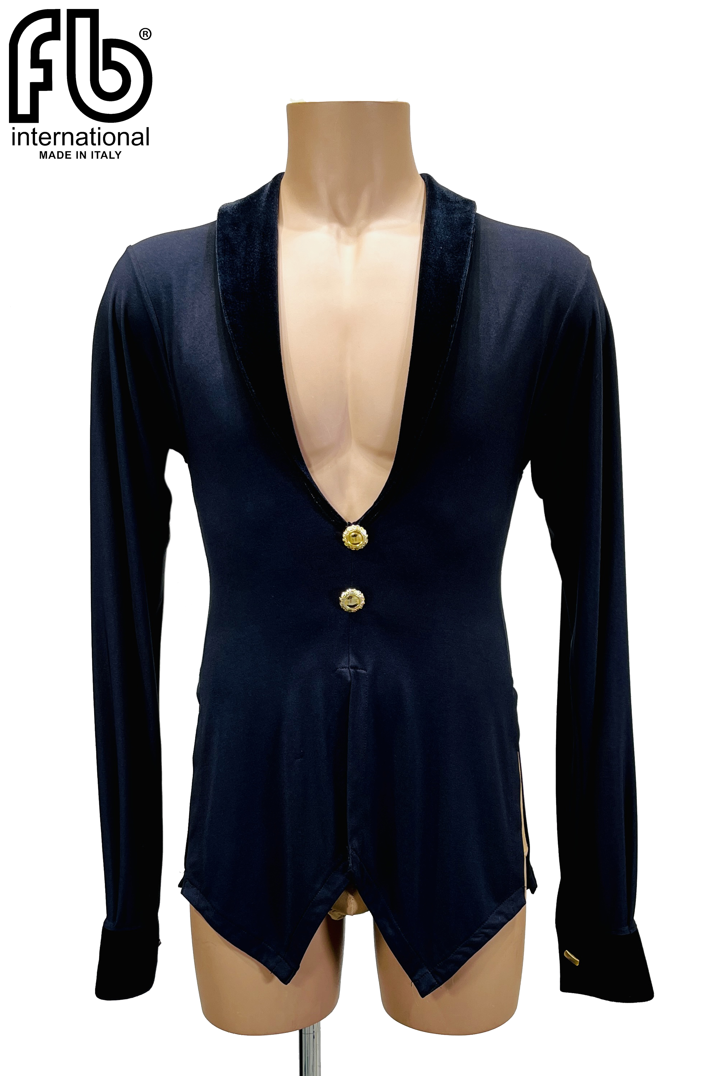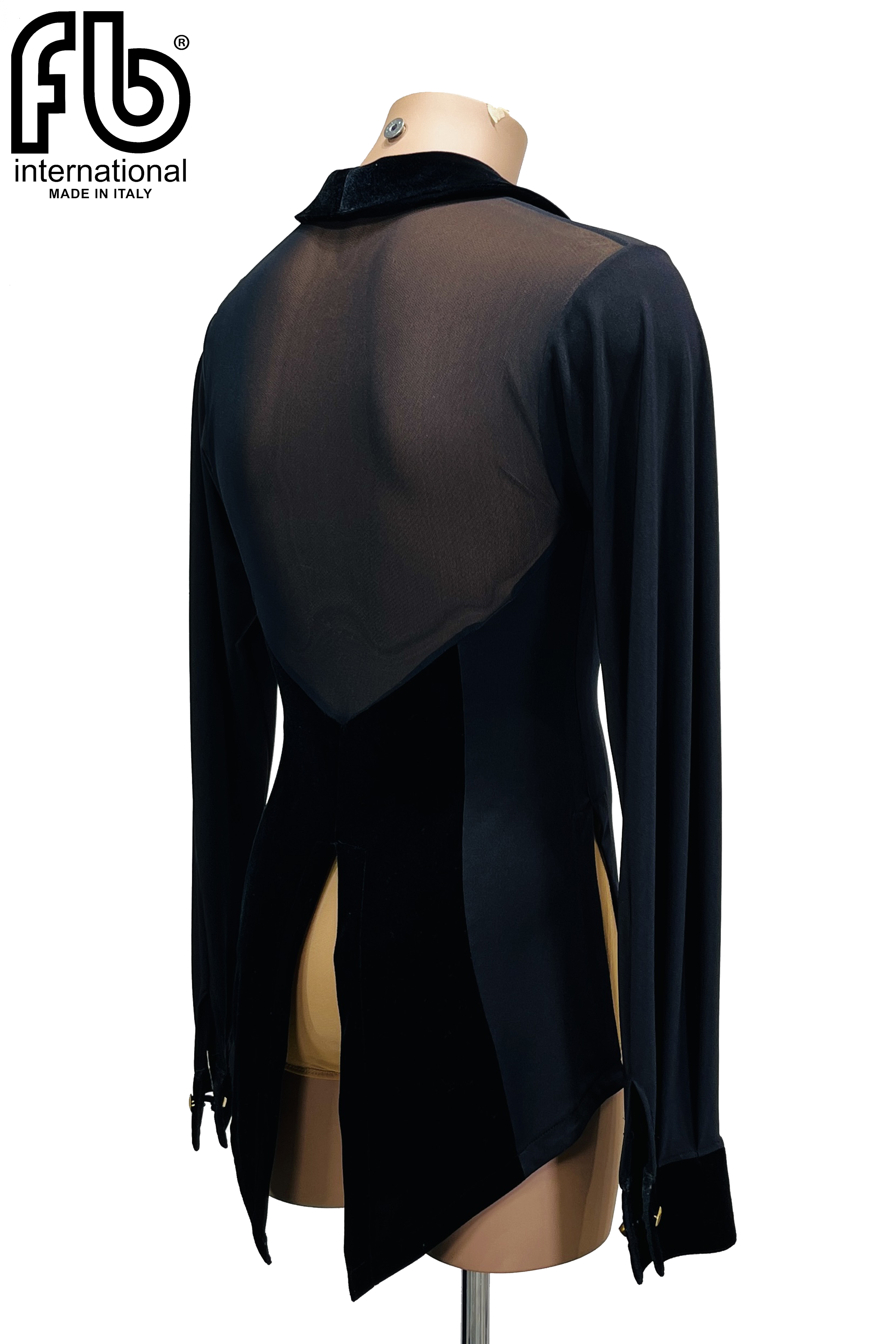 Latin dance top, FB INTERNATIONAL, jacket worn by our testimonial, has colour imperfections on the crepe. Made of crepe with velvet details, flesh-coloured bodysuit and gold buttons. SIZE: