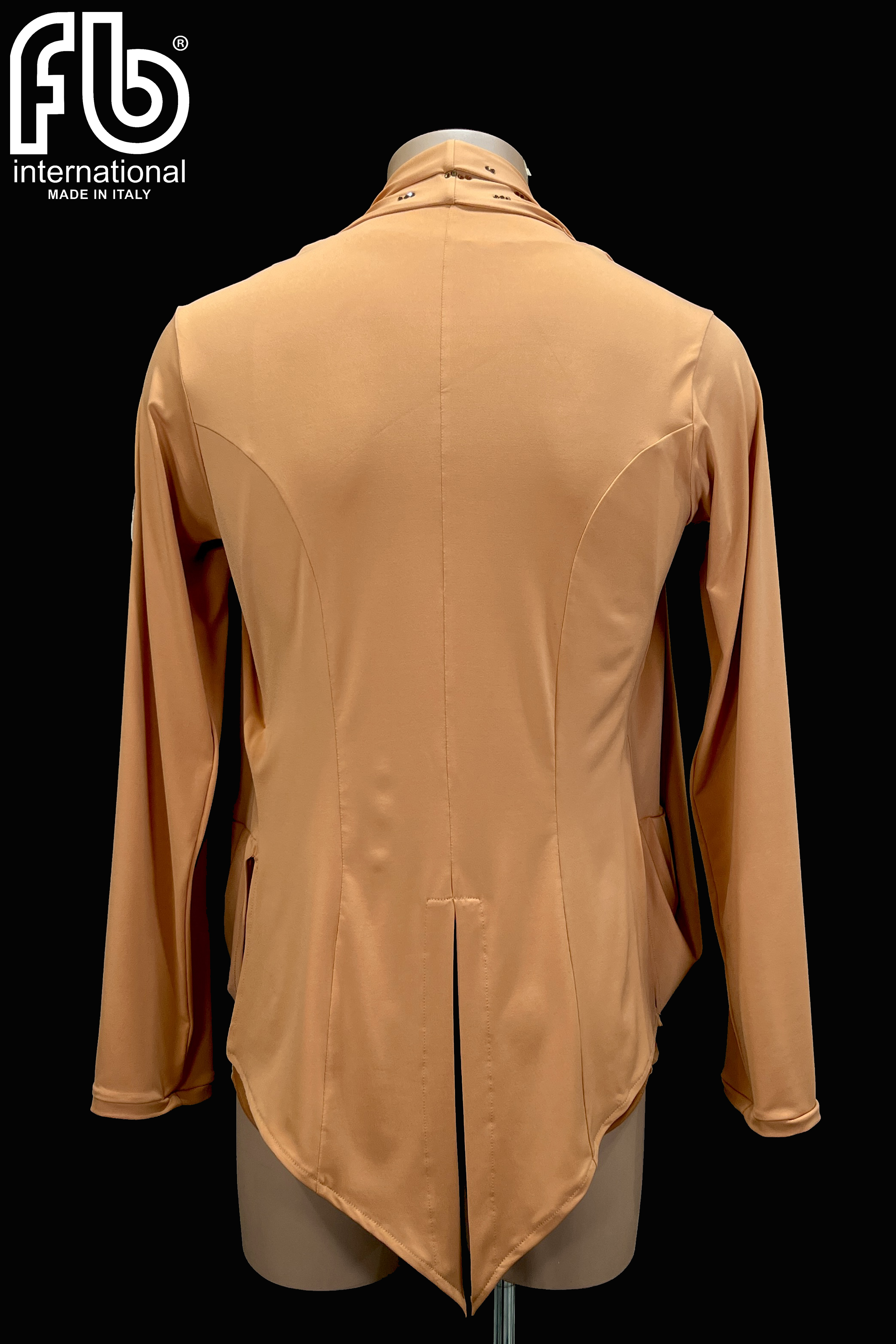 Men's Latin dance shirt with tank top made of AB rhinestone mesh with tan-coloured base. Tan-coloured crêpe kimono attached to the tank top with AB rhinestone detailing.