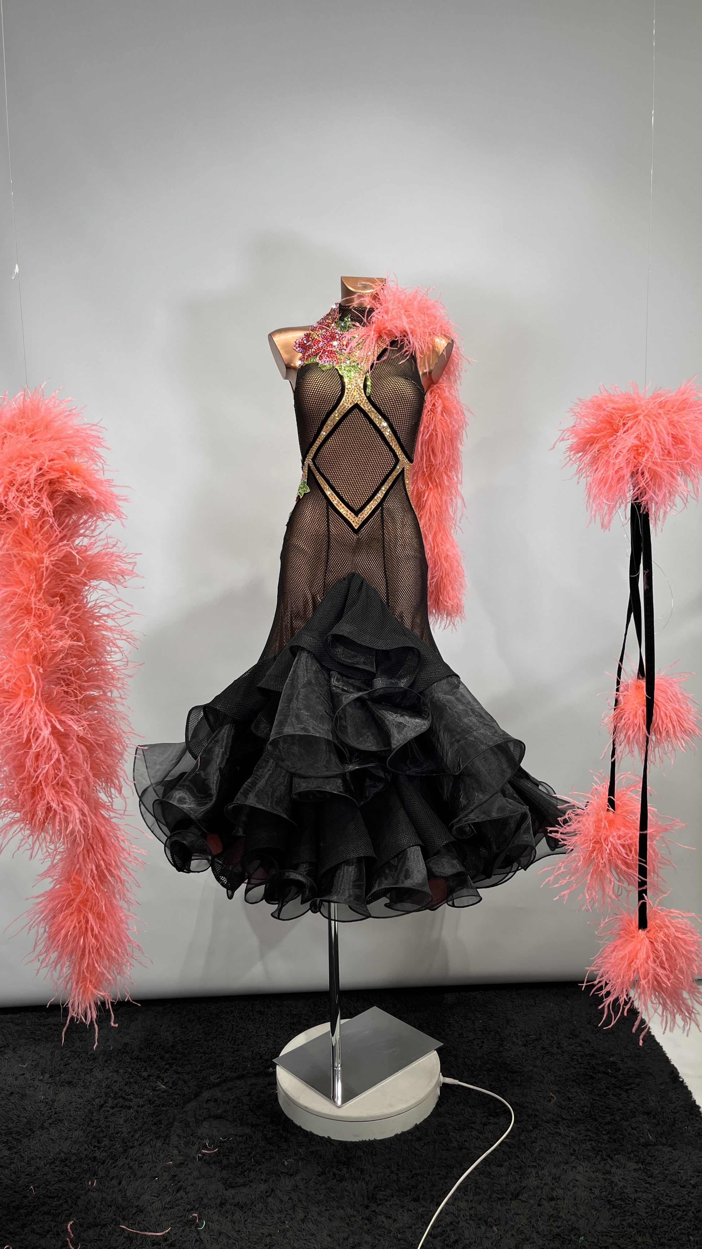 Black mesh standard dance dress with tan-coloured base, black organza flounce skirt and coral organza underskirt, coral ostrich feather cuffs.