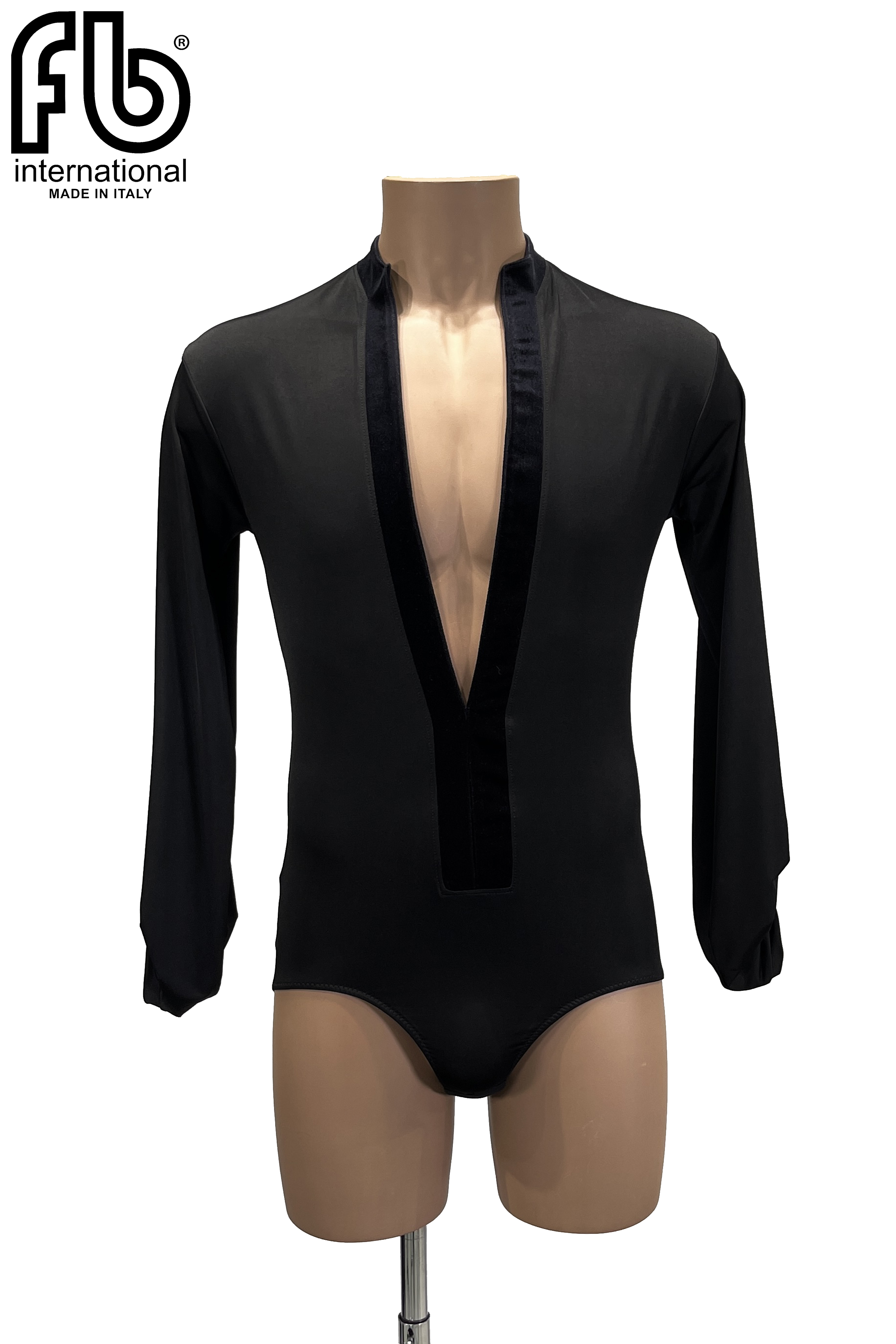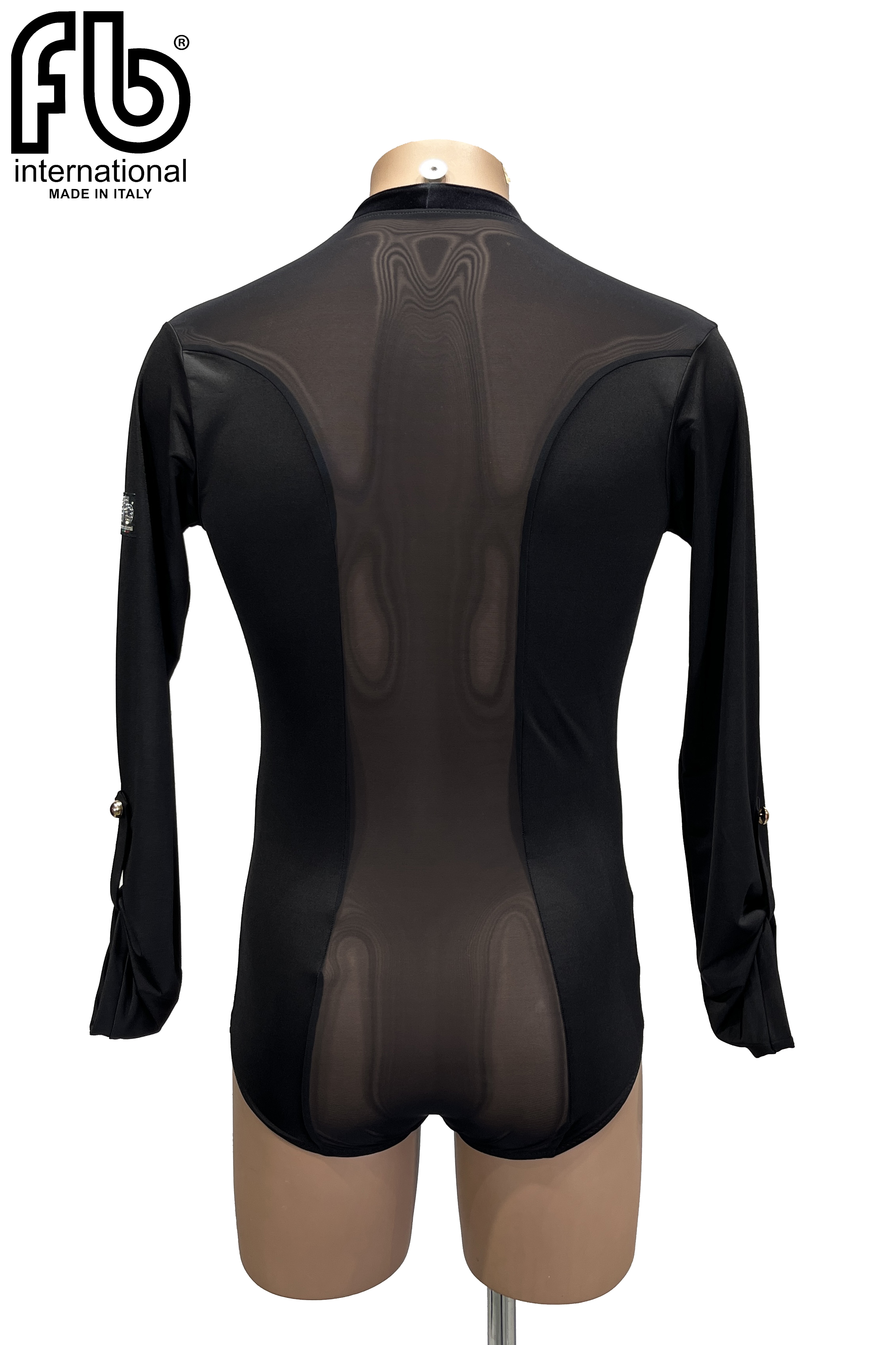 Men's Latin dance shirt made of black mesh and crepe, tight fit.