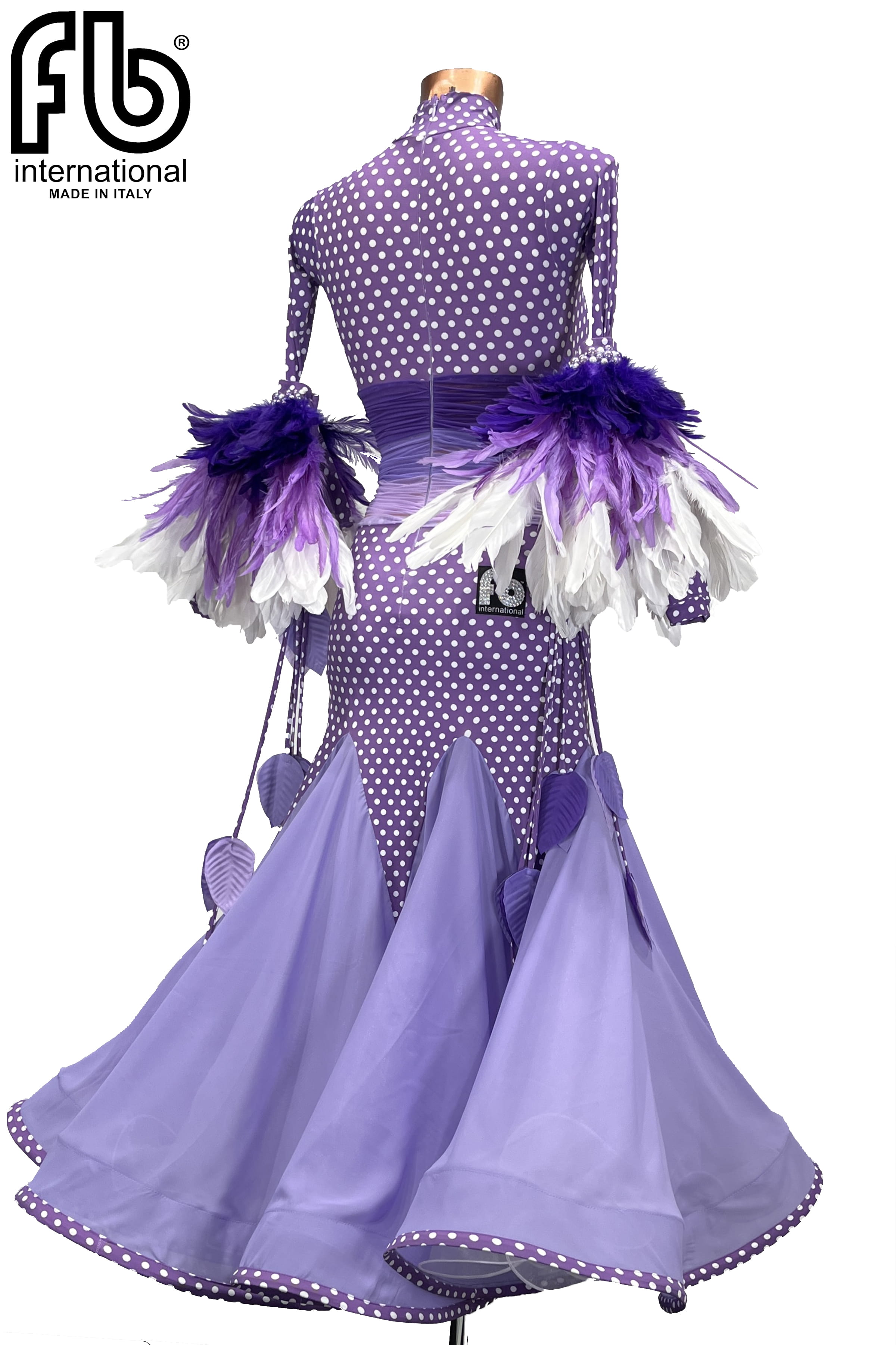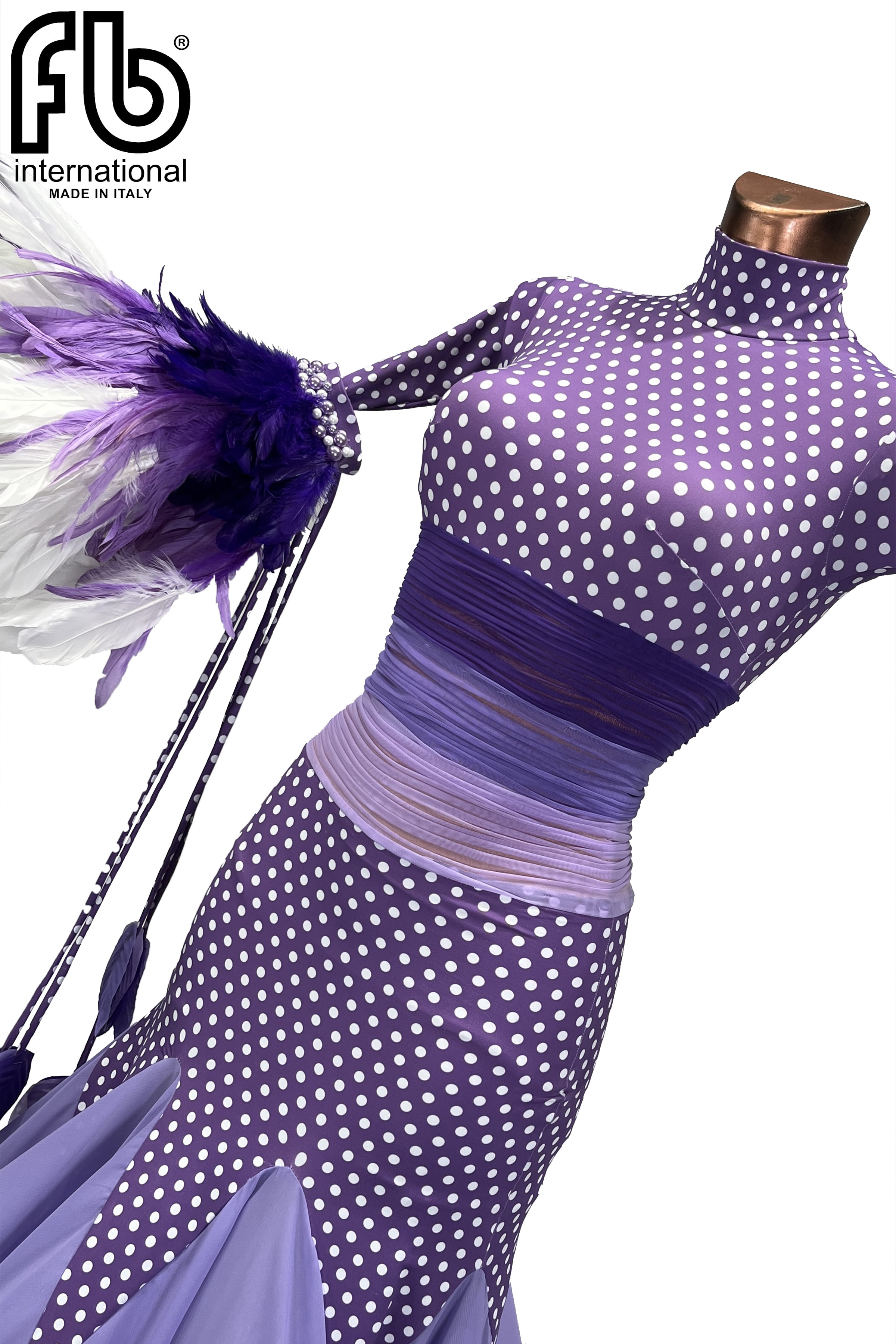 Women's dress for standard/smooth dances made of purple elastic fabric with polka dots, mesh drape applied at the waist. SIZE: This dress fits well an S size, but be sure to check by following the measurements below.