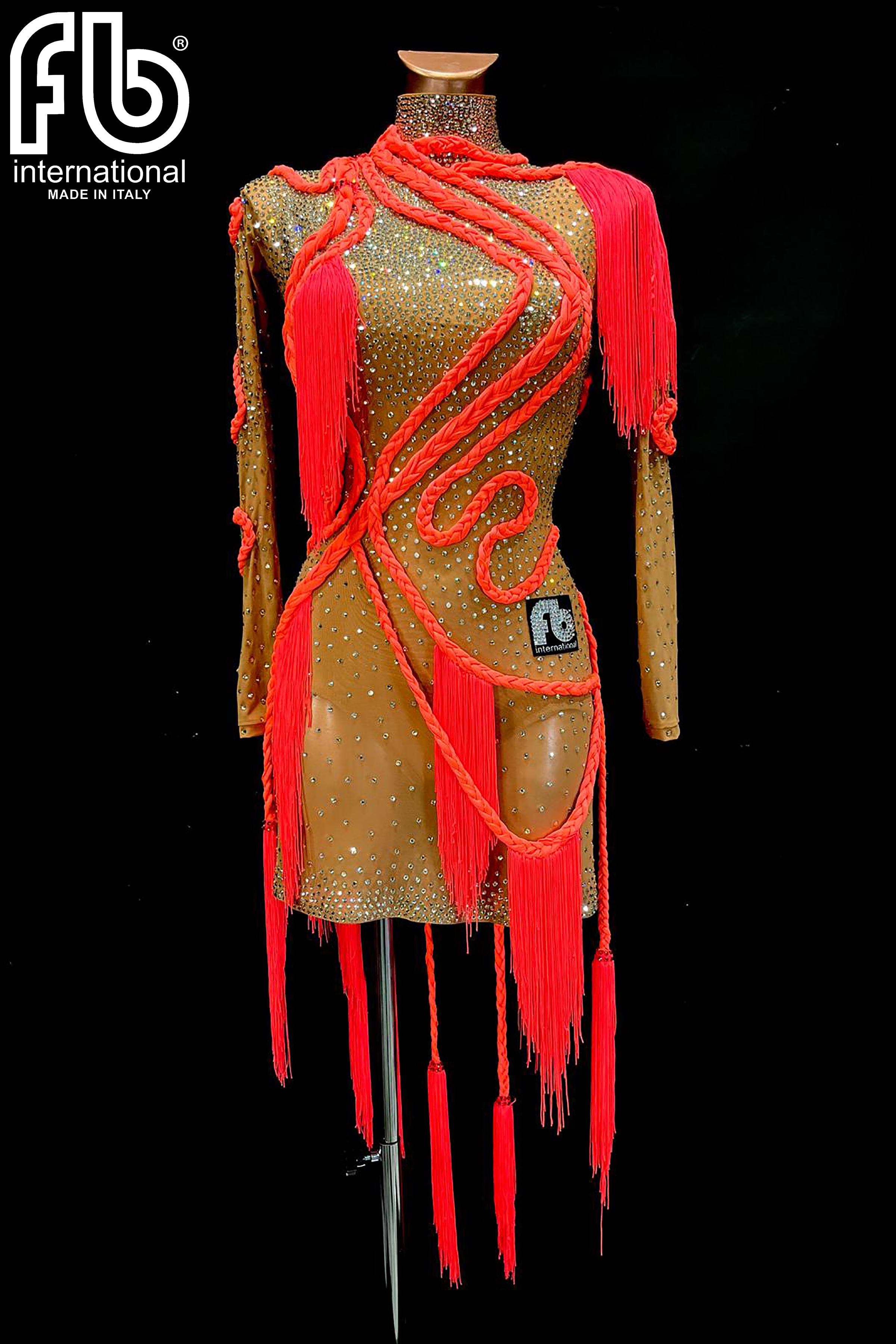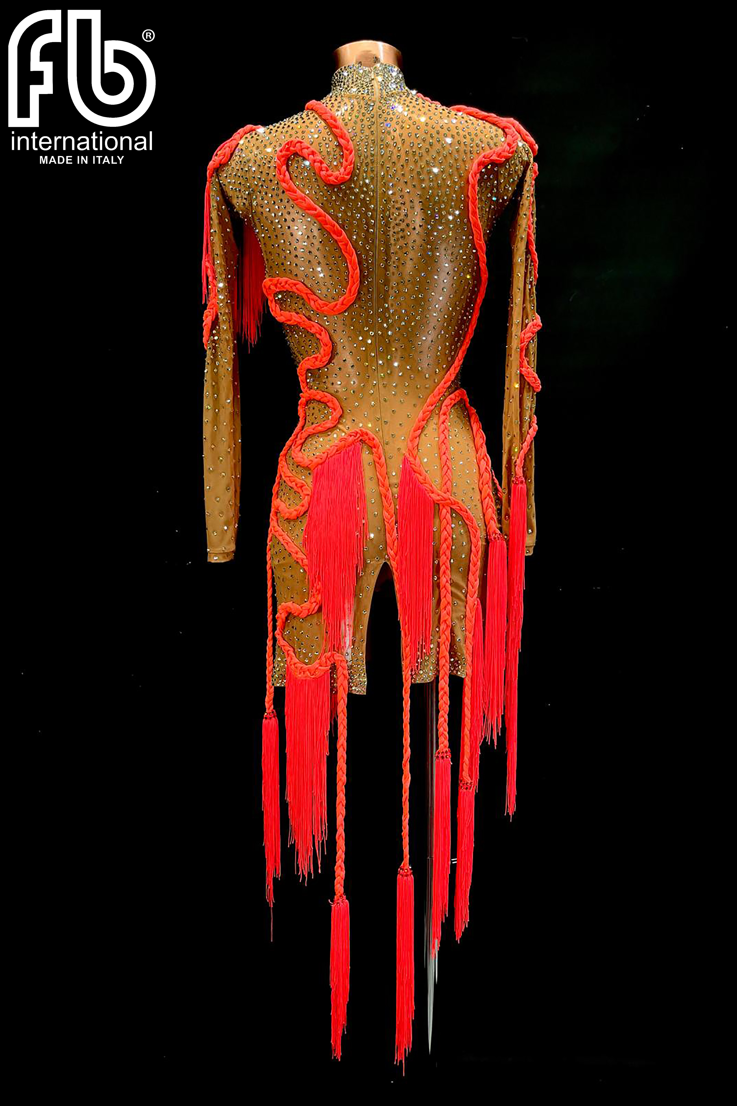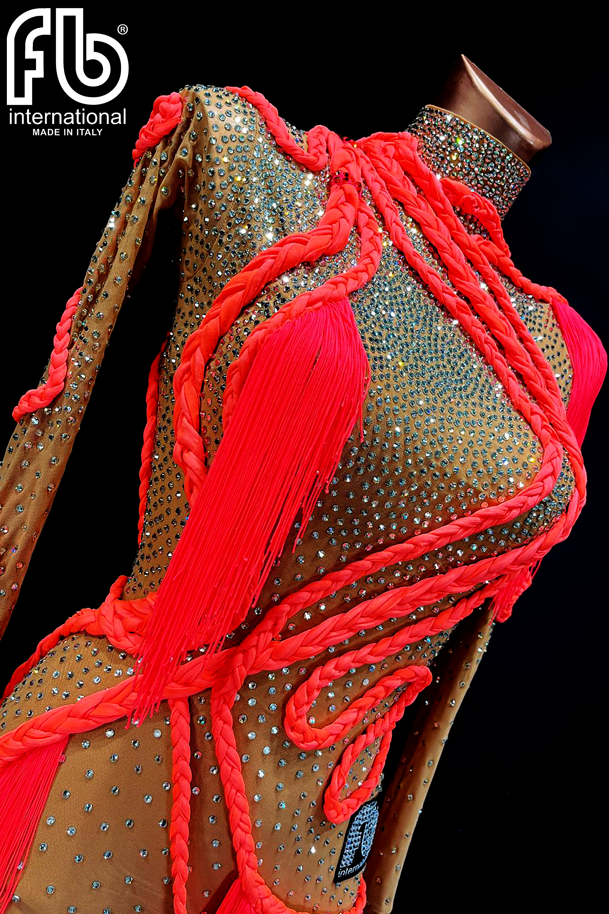 Abito latino realizzato in retina. Trecce arancio fluo realizzate a mano abbracciano l'abito evidenziando le curve. Le frange arancio fluo garantiscono movimento alla gonna a tubino. Il ricco ricamo di strass nell'originale colore Blond flare e l'arancio fluorescente delle trecce rendono l'abito luminoso e molto visibile in pista. Ogni treccia è cucita a mano sull'abito e rifinita meticolosamente con frangette di strass sul fondo.