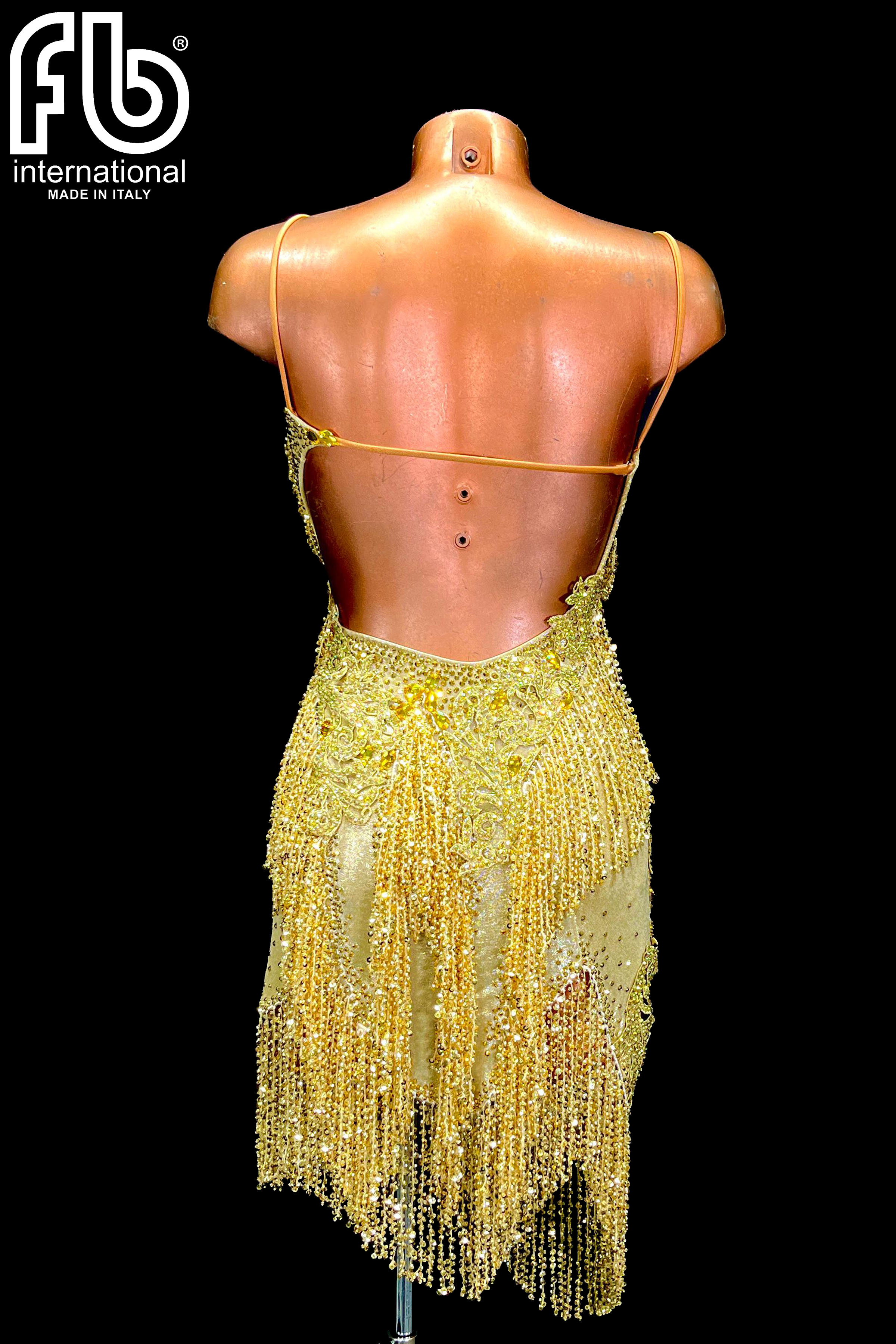 Abito da donna per danze latine realizzato in lycra oro con applicazioni in pizzo rifinite da strass, il tutto è adornato da crine di paillettes che rendono il vestito spumeggiante e divertente.
