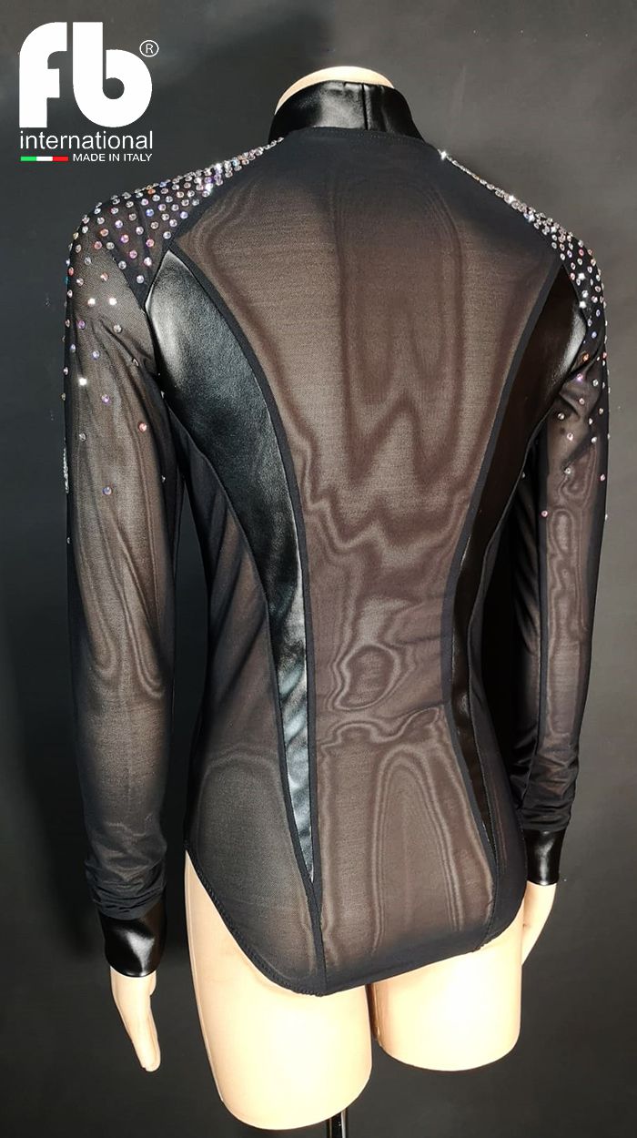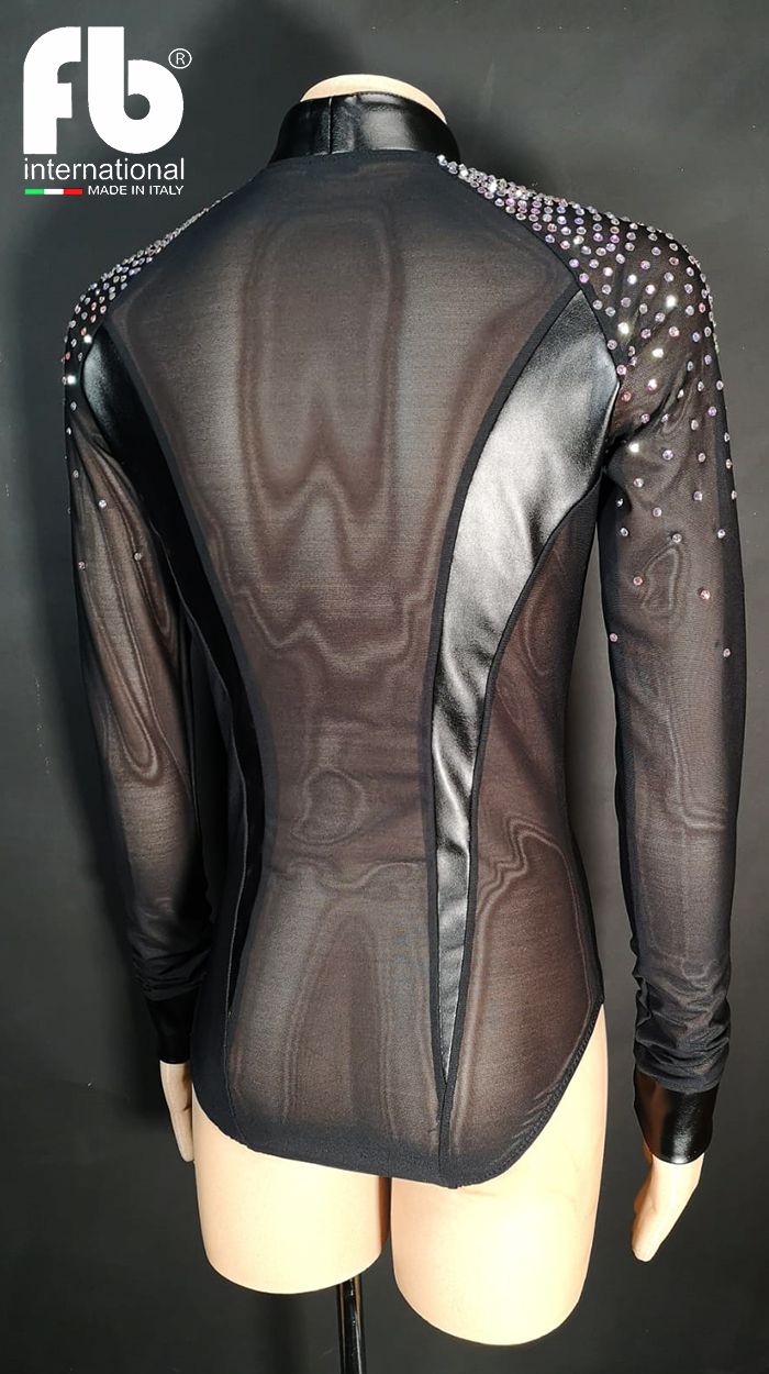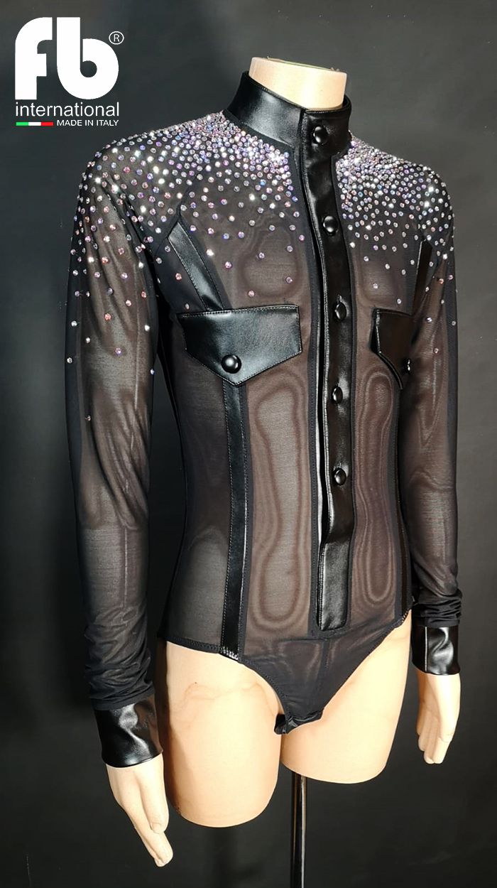 Men's shirt for latin dances made of mesh with mandarin collar, pockets, cuffs and buttons in leather. Vertical stripes on chest and back also in leather and crystal AB rhinestones applications on shoulders.