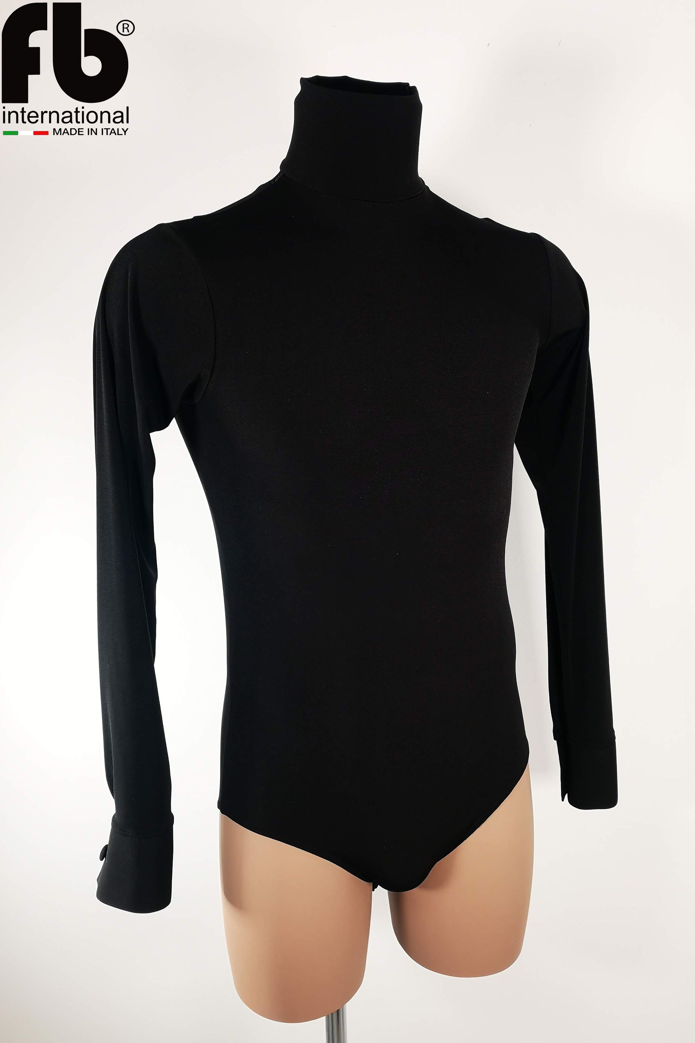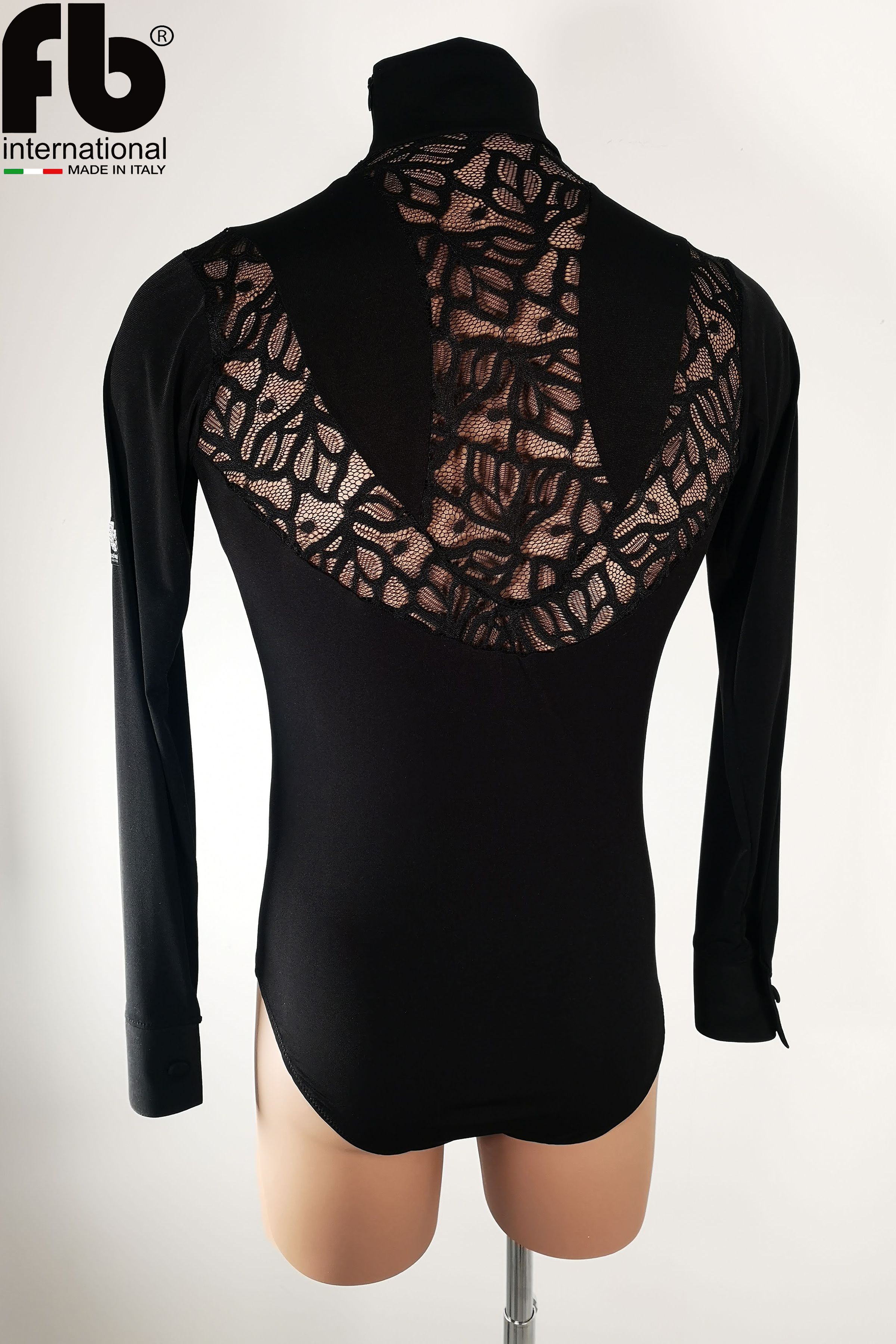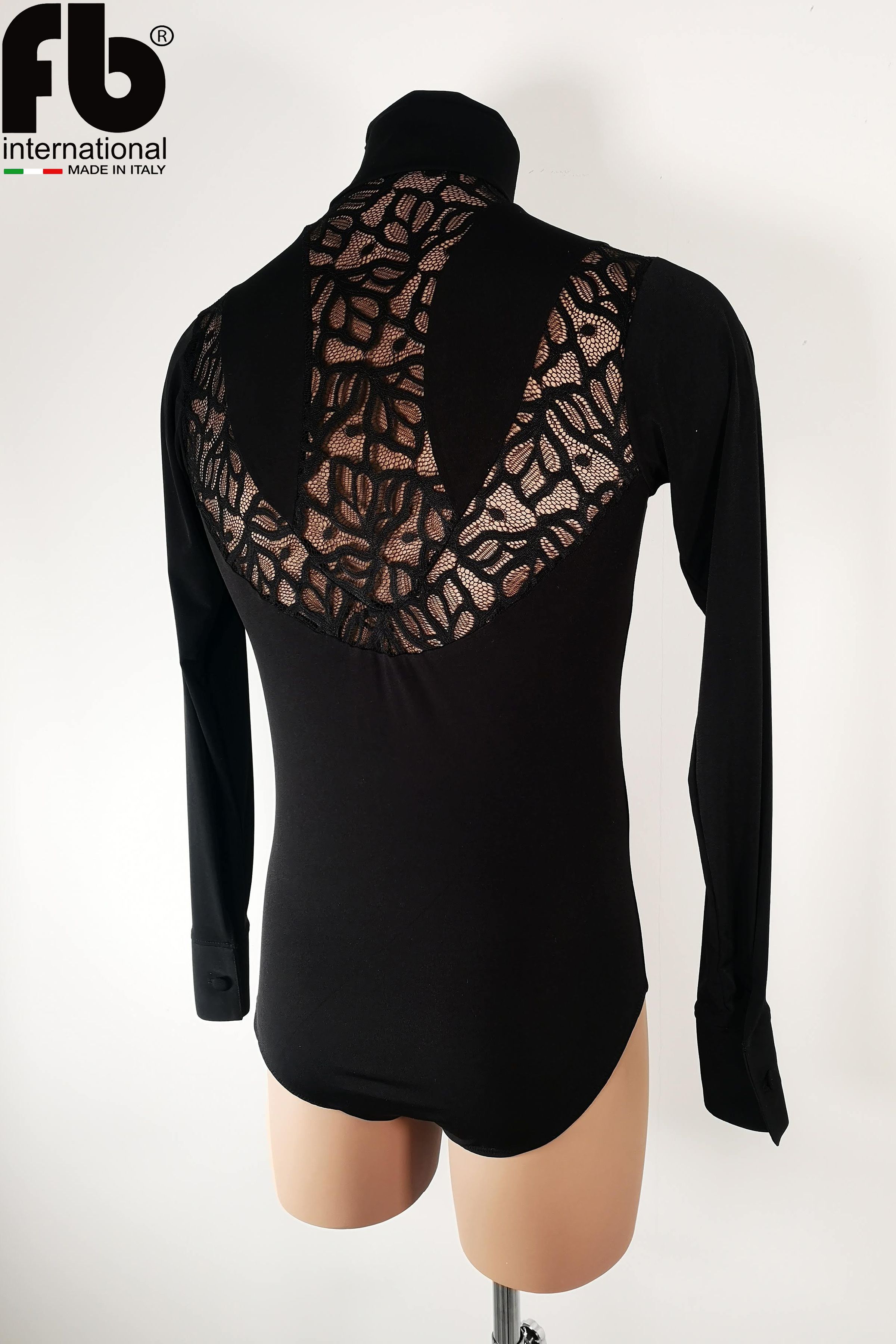 Men's turtleneck shirt for latin dances, made of black crepe with cuffs with buttons and lace embroidery on the back, without rhinestones.