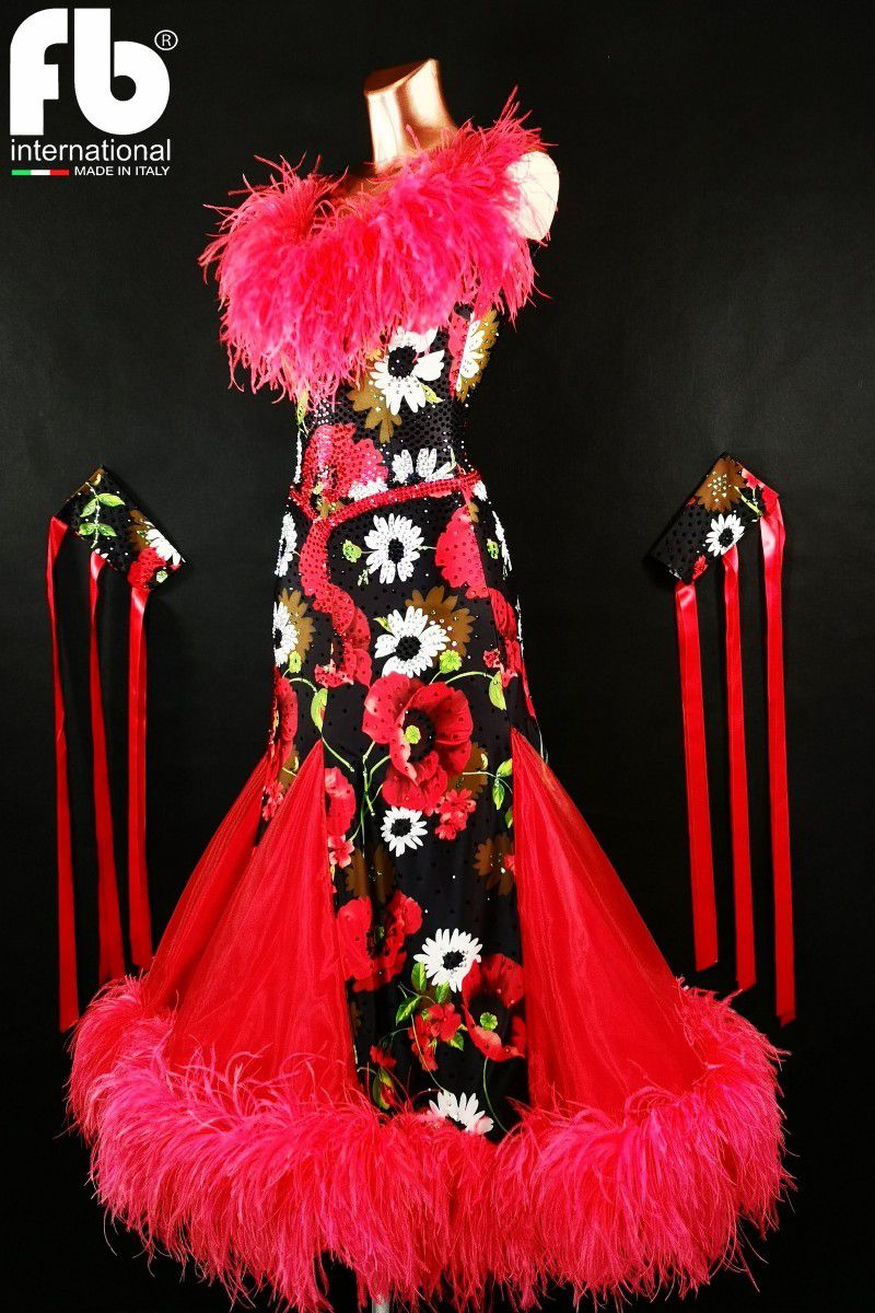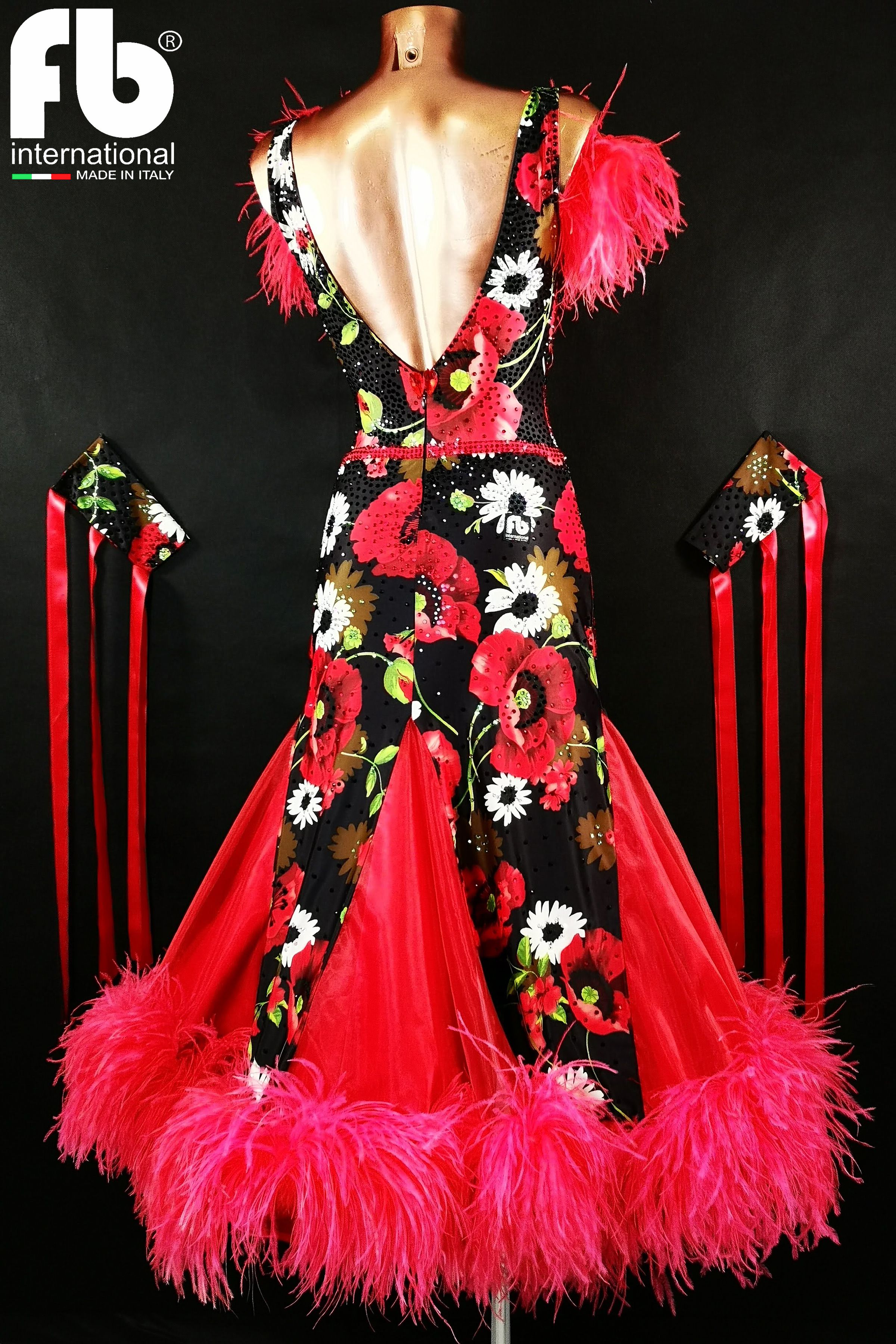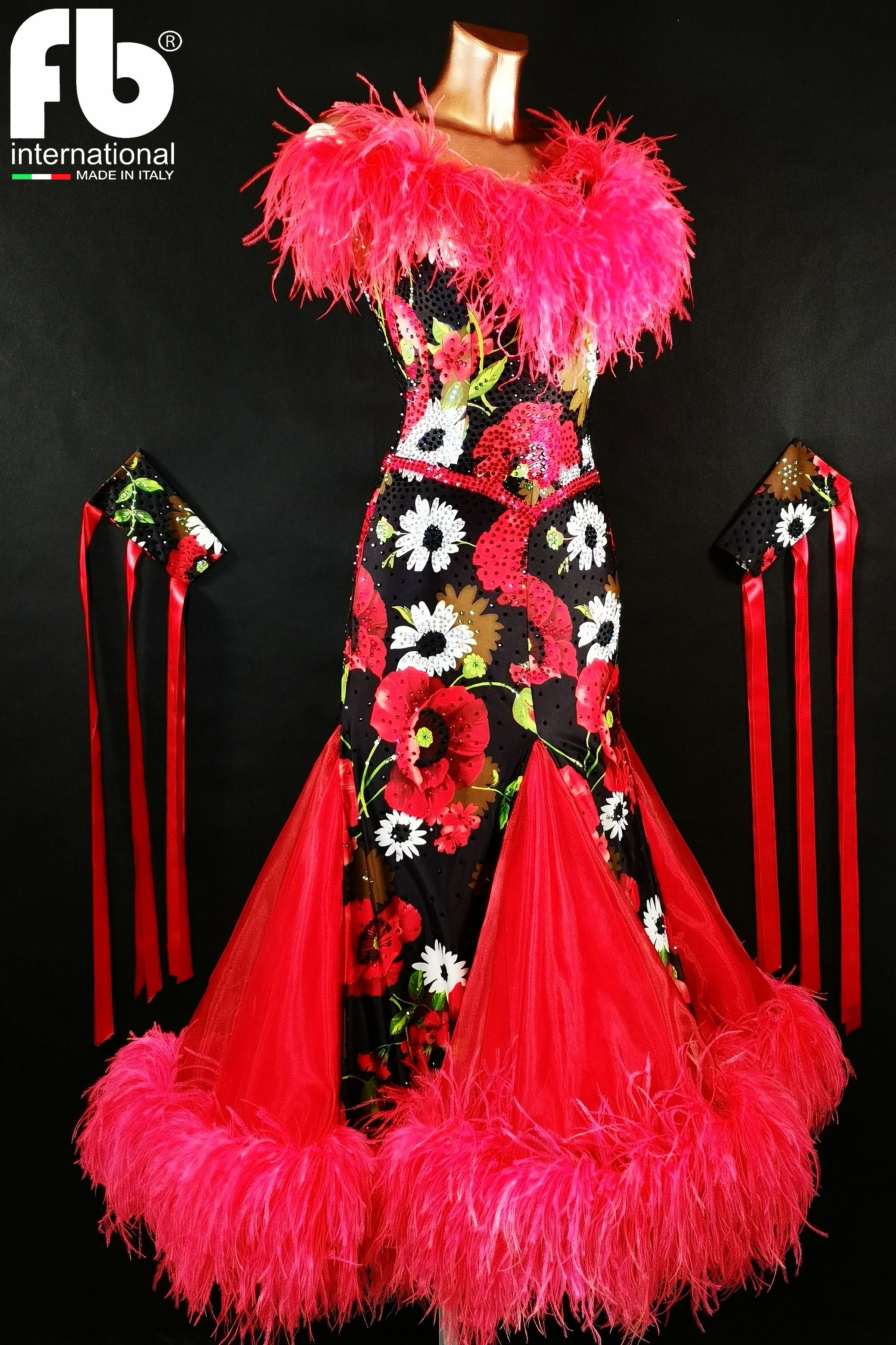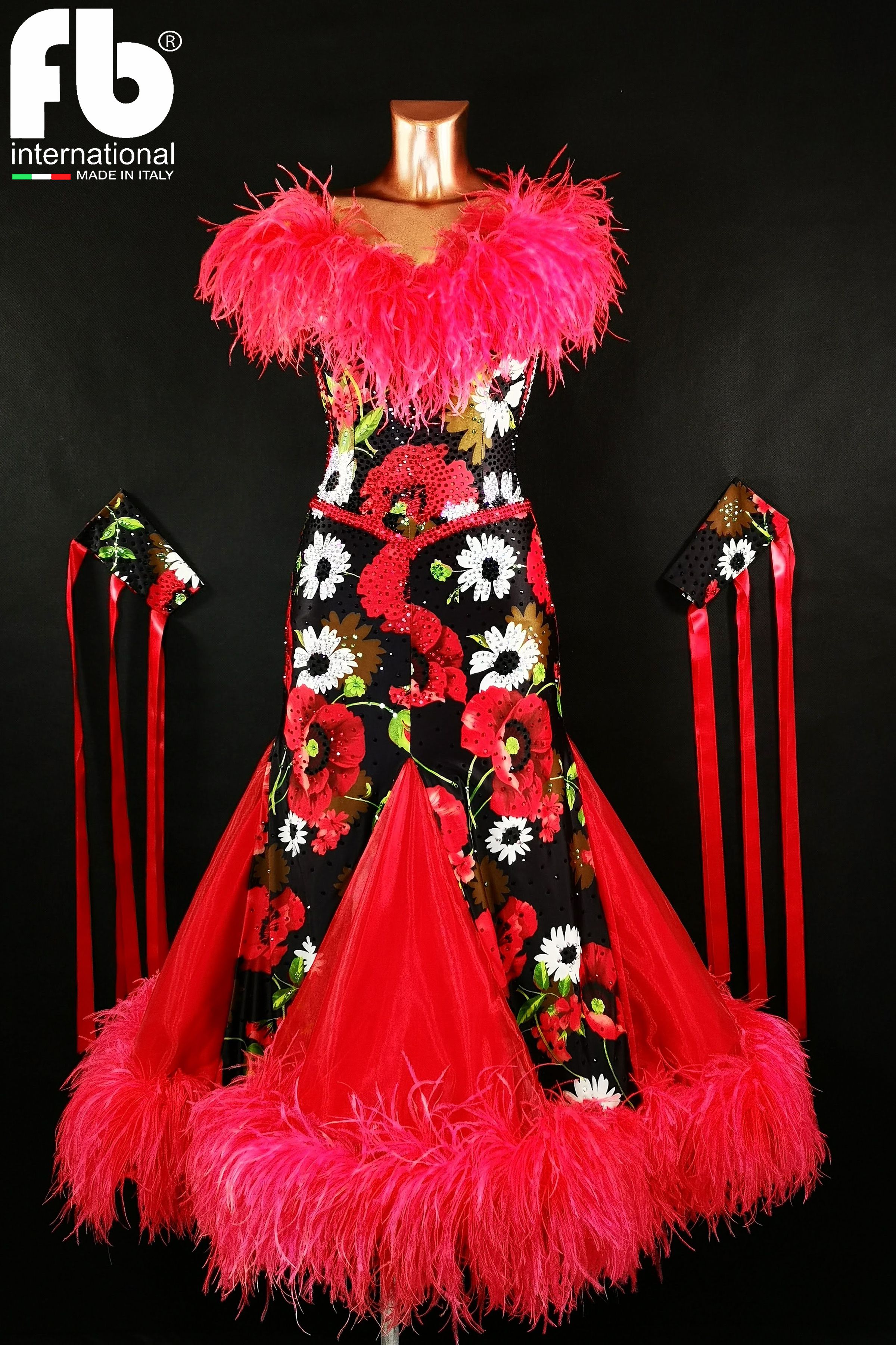 Standard dress for smooth dance, made of floreal print enriched by rhinestone embroidery, wide skirt with red feathers boa at the bottom and red feathers also on the cleavage.