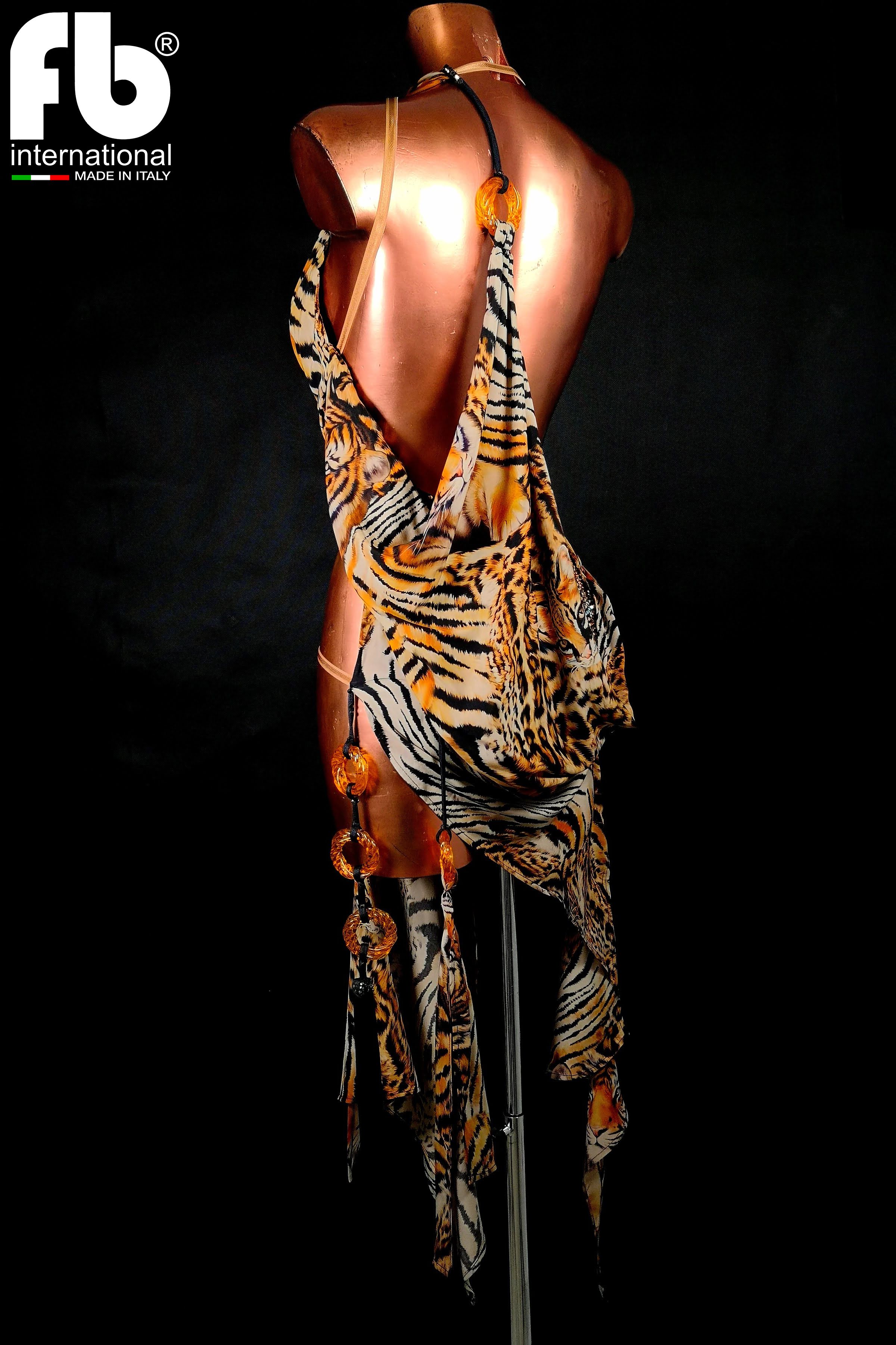 Women's dress for show dance made of black lycra and animal print fabric, light and impalpable, enriched with rhinestones on the bottom of the back and movement ensured by the long tails on the front and back and black threads with amber rings.