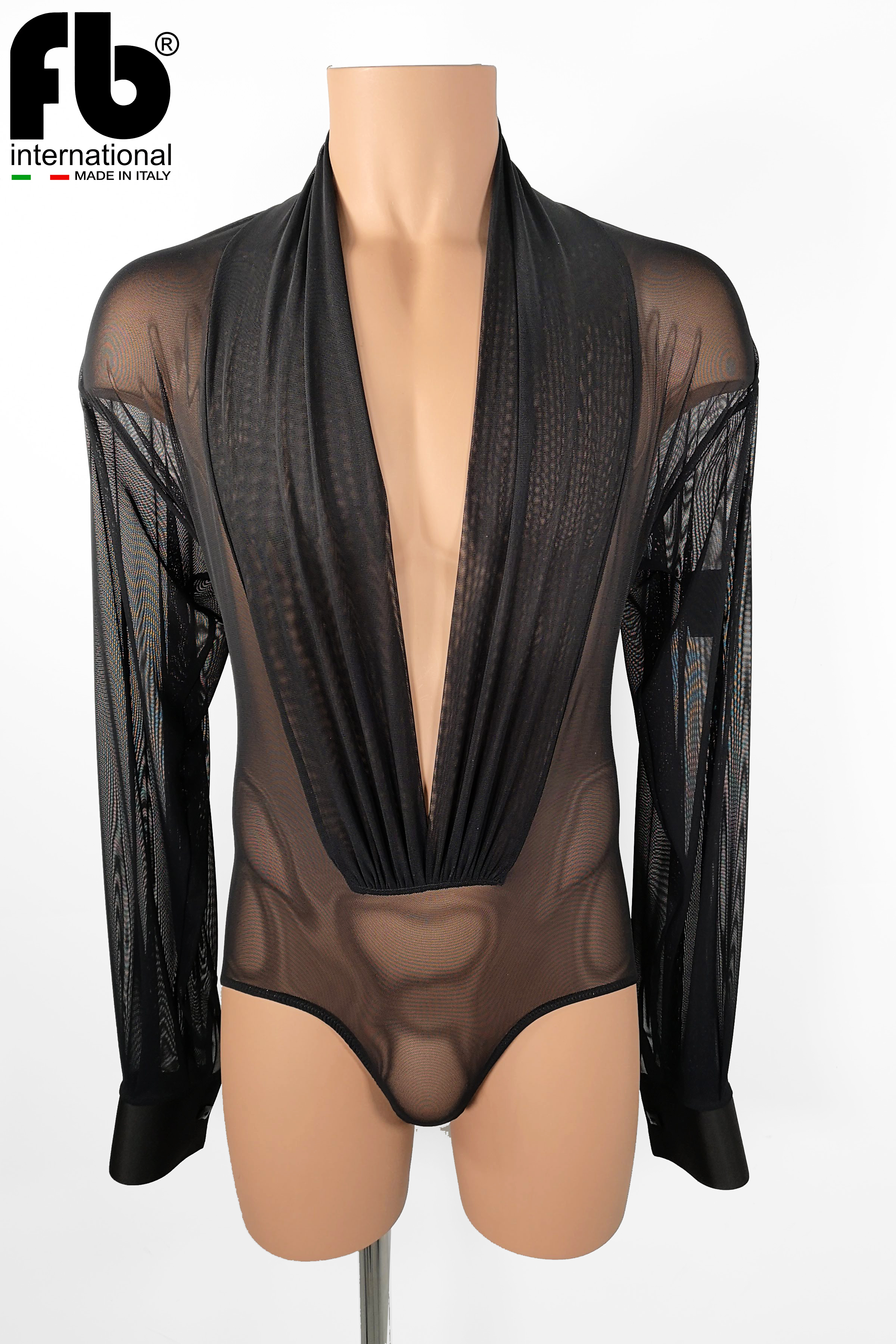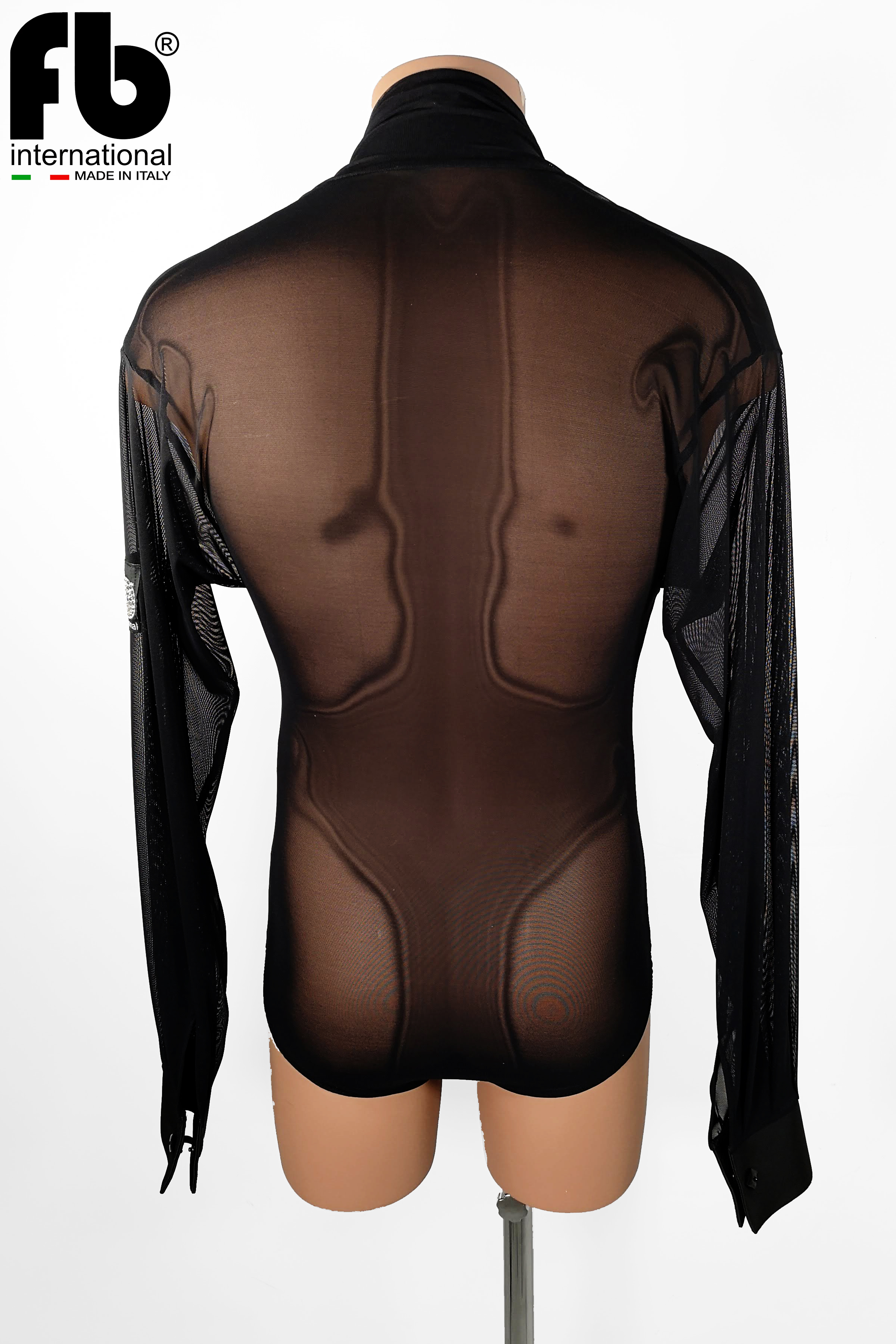 Men's shirt for latin dance made of black mesh, drapery on the sides of the chest and satin cuffs with buttons.