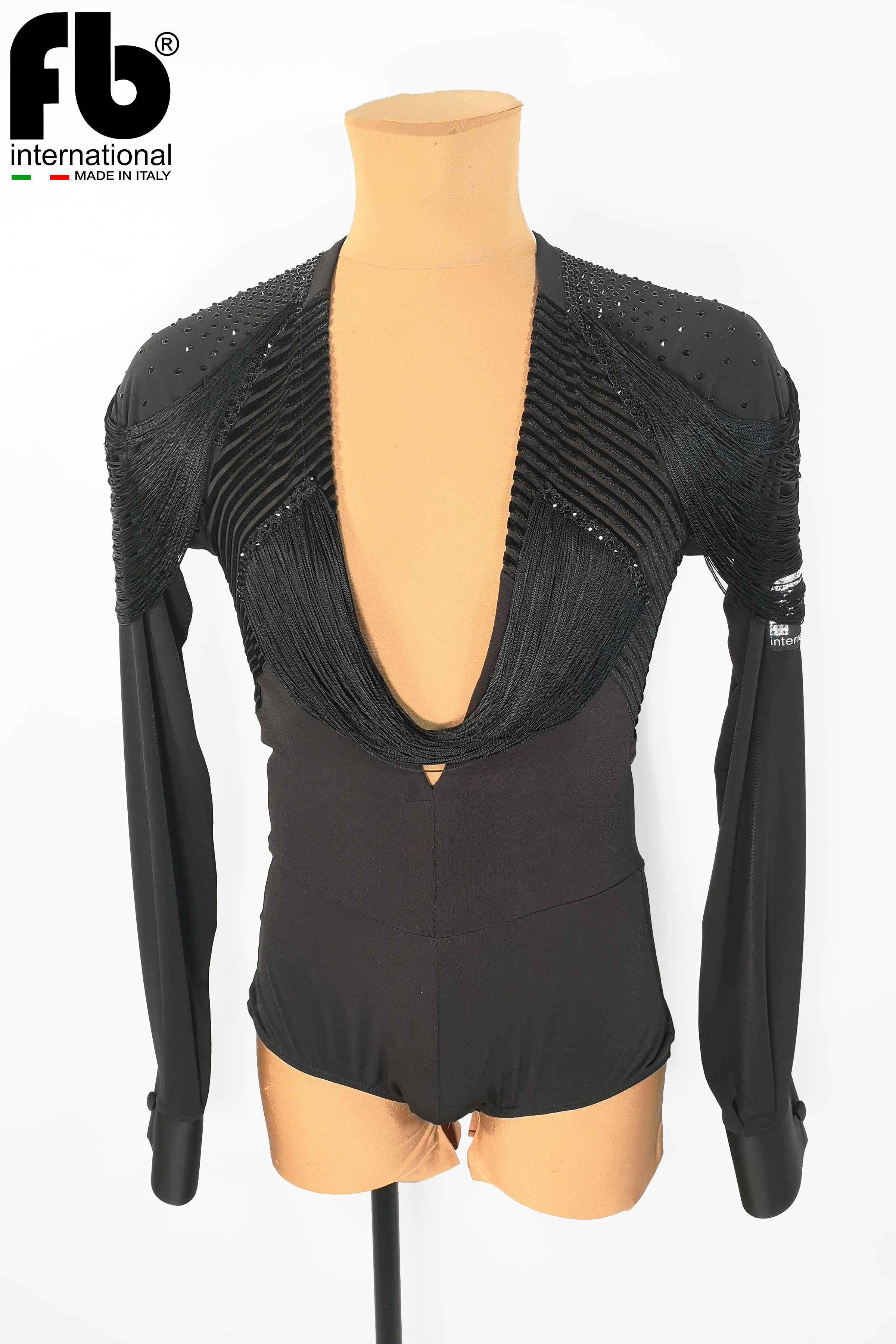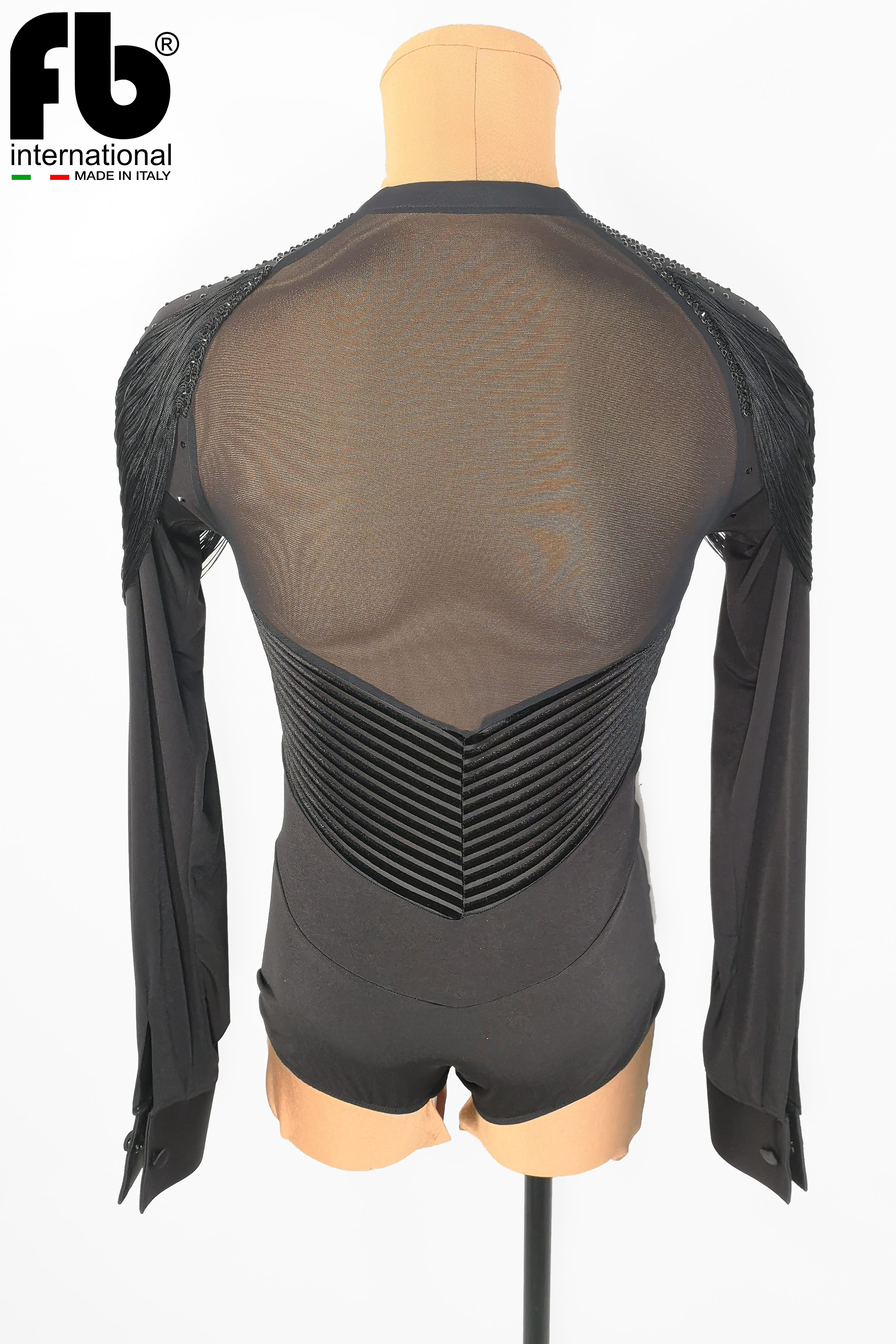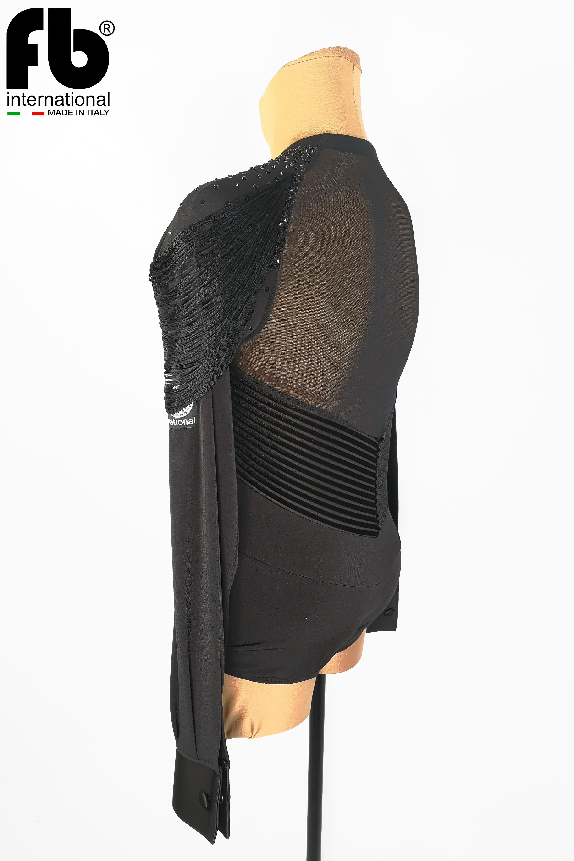 Latin shirt made of black crepe with cuts made of black velvet striped fabric, embroidery with jet hematite rhinestones on shoulders and chest and black fringes to amplify movement.