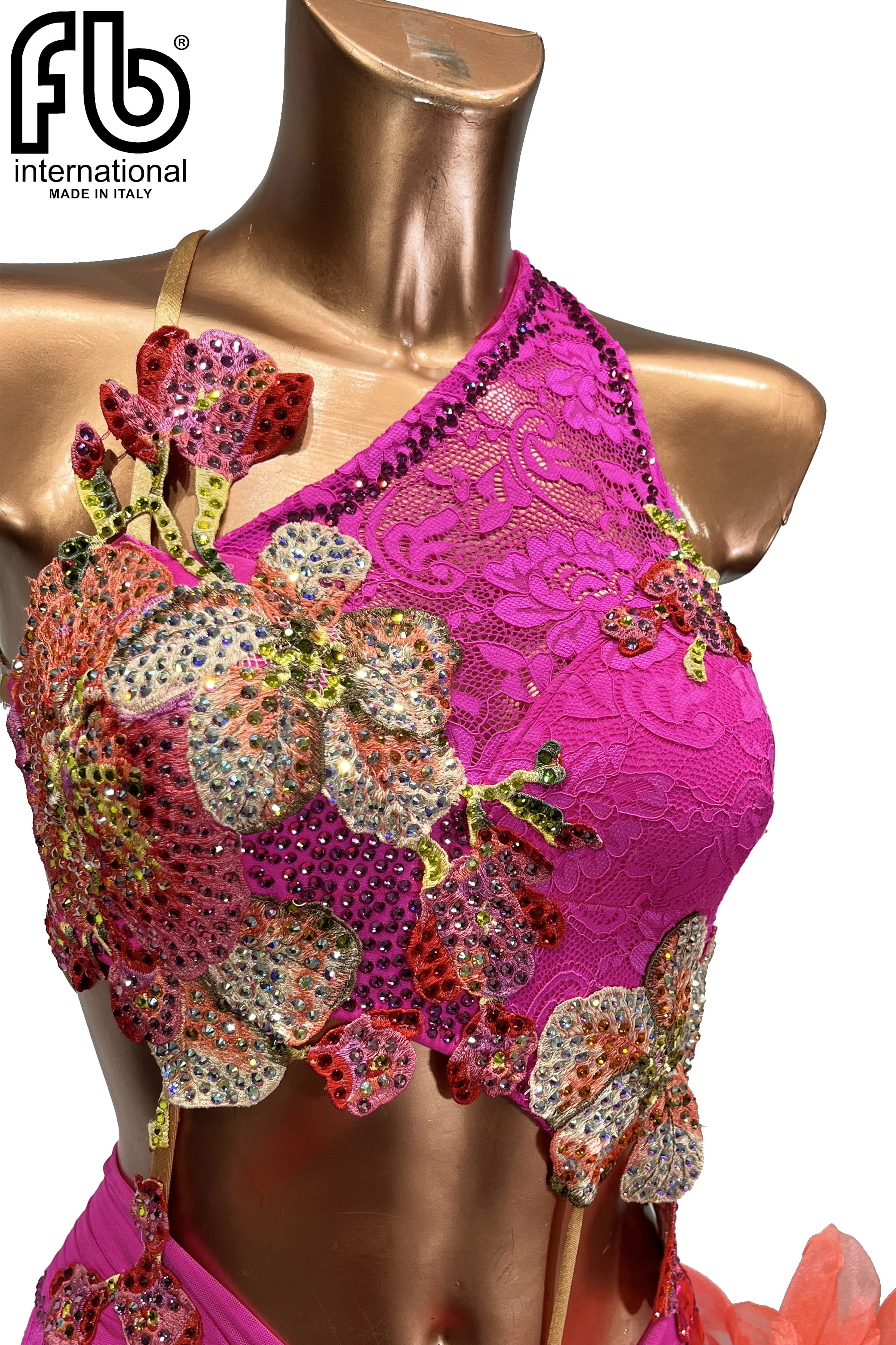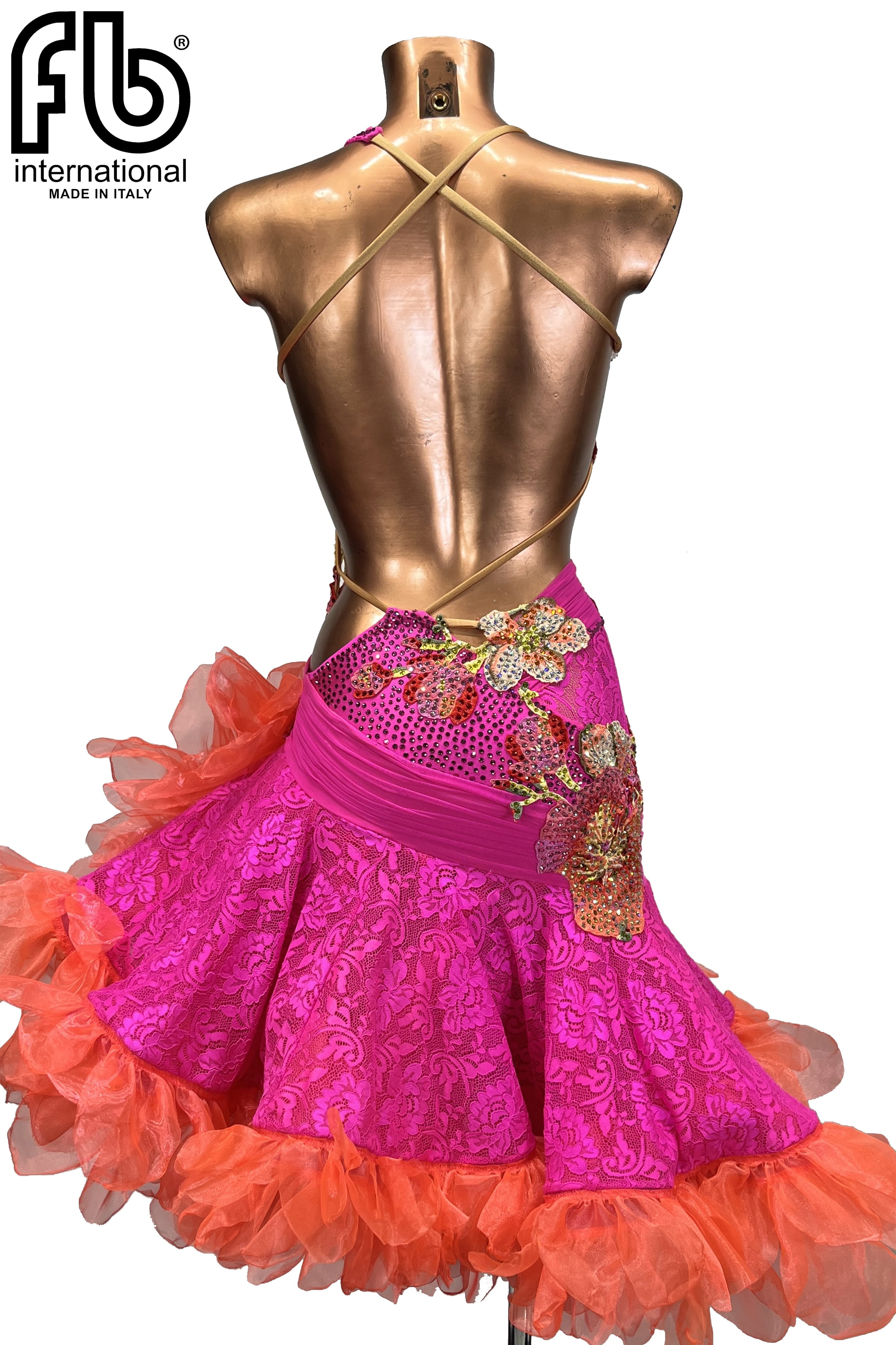 tone-on-tone rhinestones. Featuring mambo skirt with wide left slit and Tango Flare (orange-red) organza ruffles on bottom.