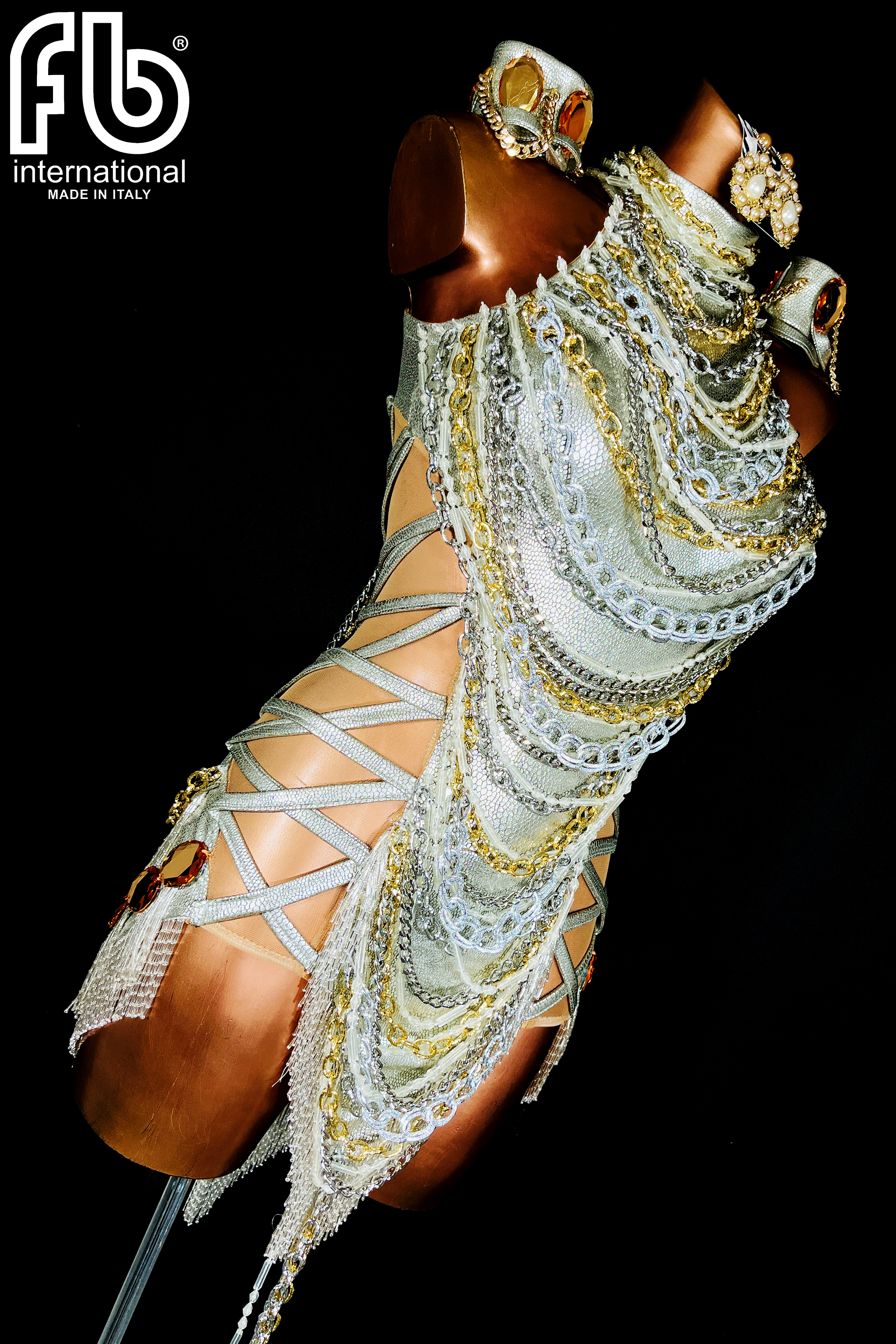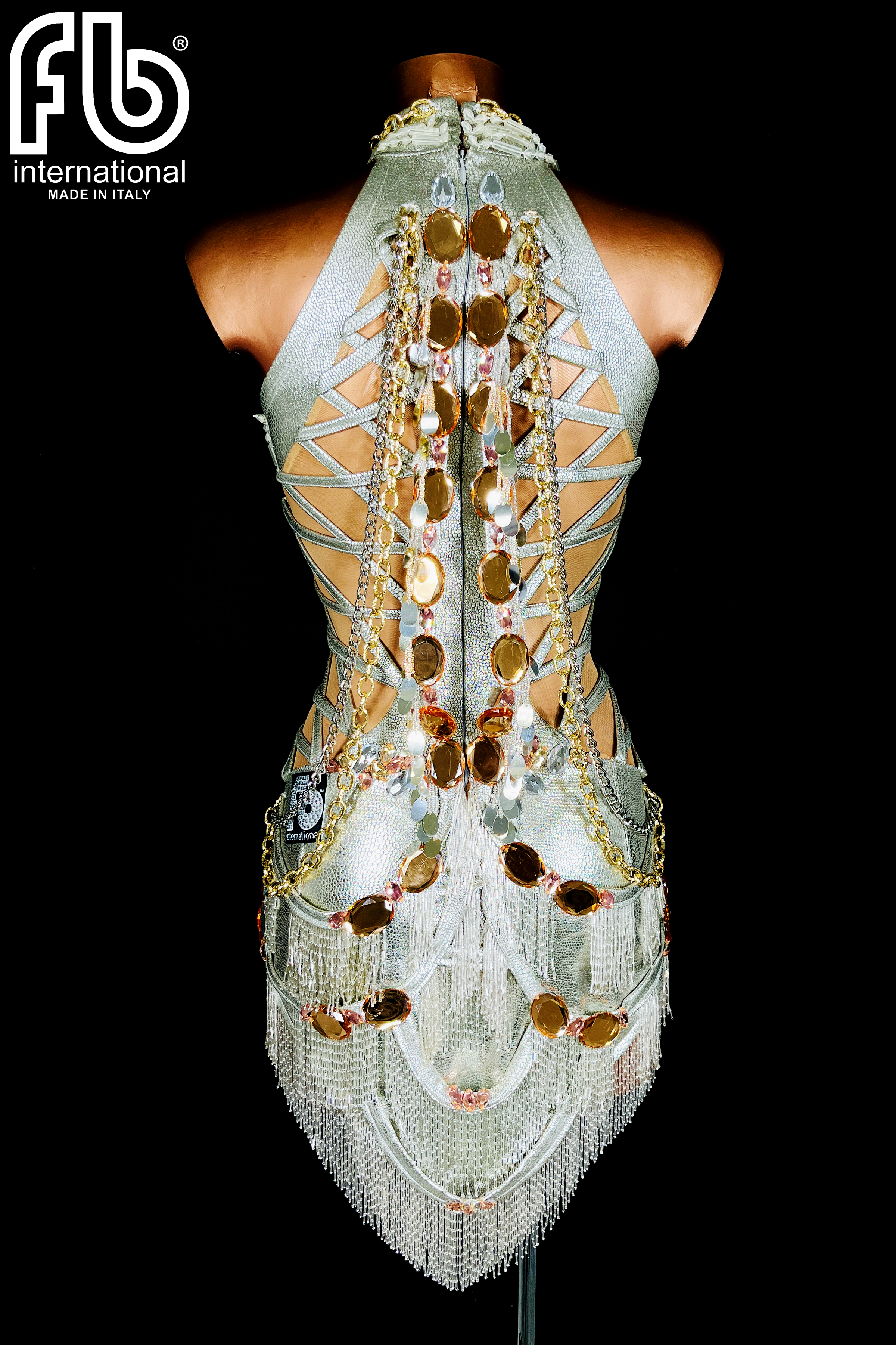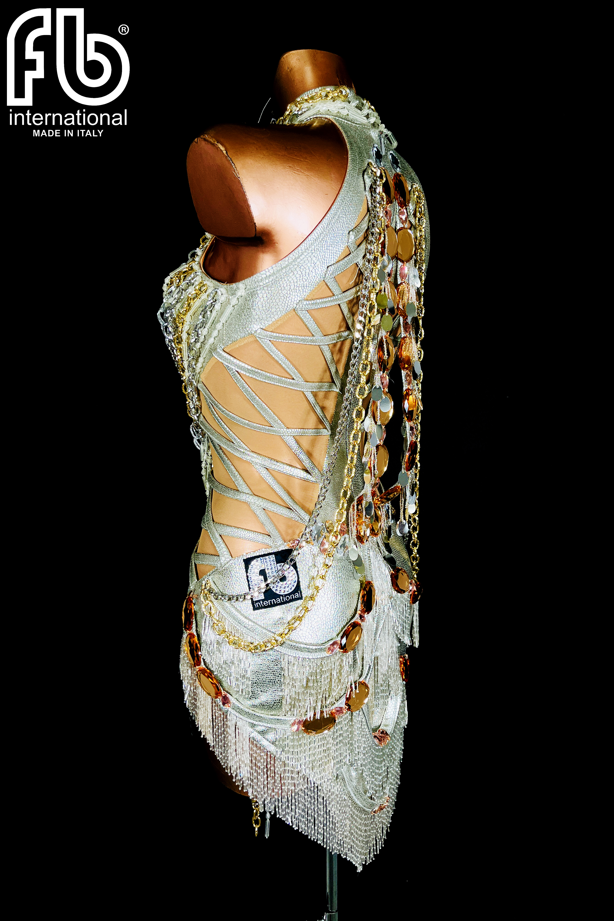 Women's dress for latin dance made of coated fabric with gold and silver chain embroidery, beads on the skirt and gold stones on the back and matching bracelets.
