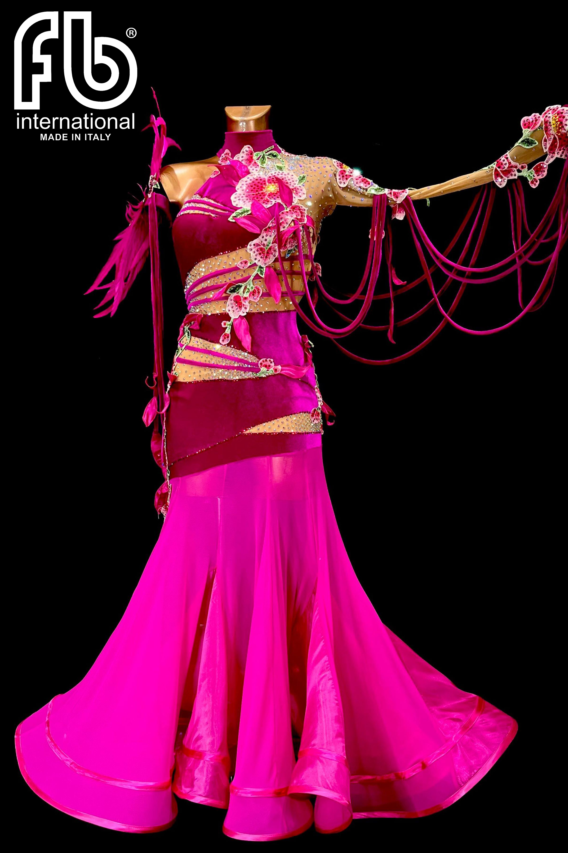 Women's dress for standard/smooth dances made of fuchsia velvet and flesh-colored lycra, floral lace decorations, fuchsia strings and rich rhinestone embroidery.