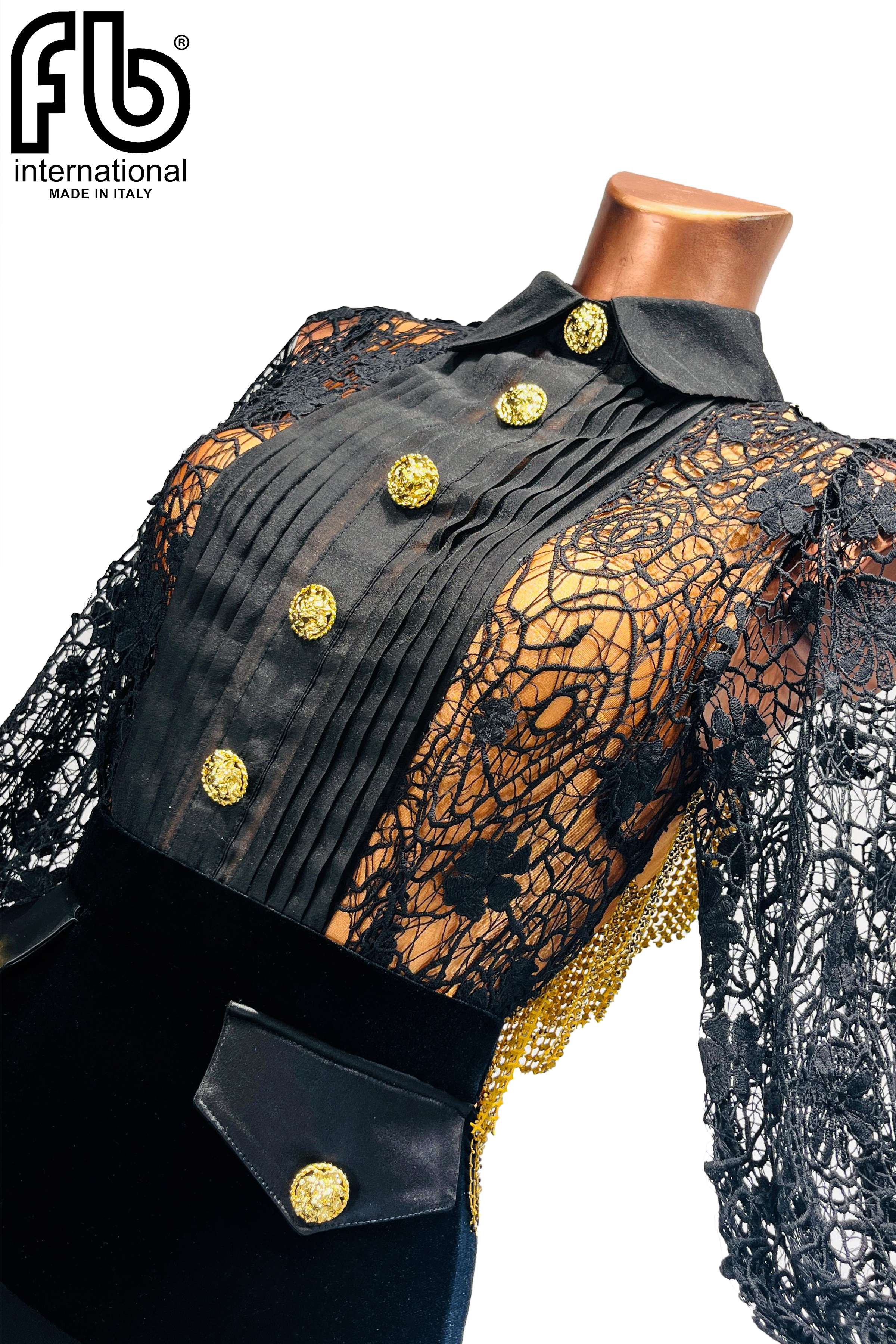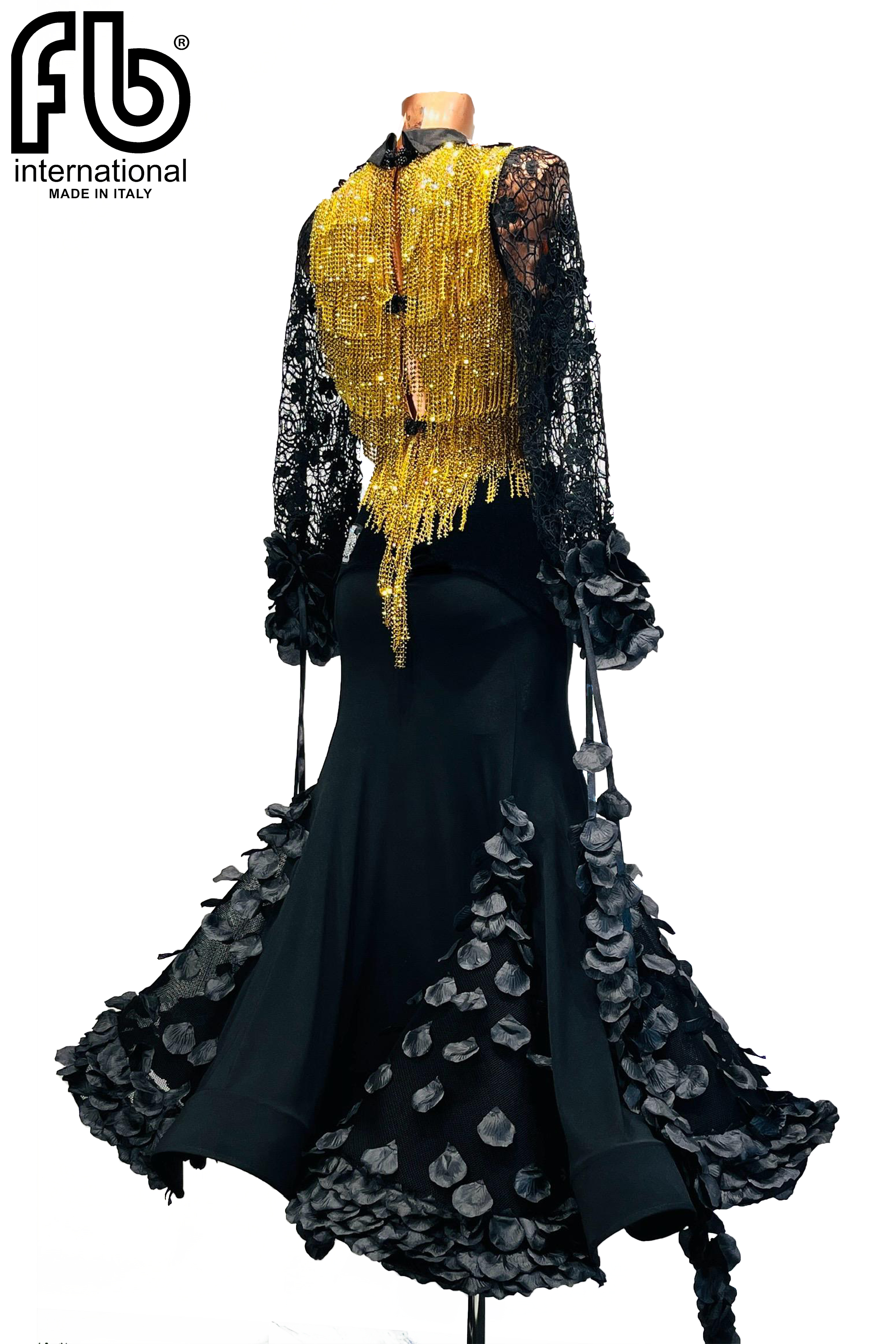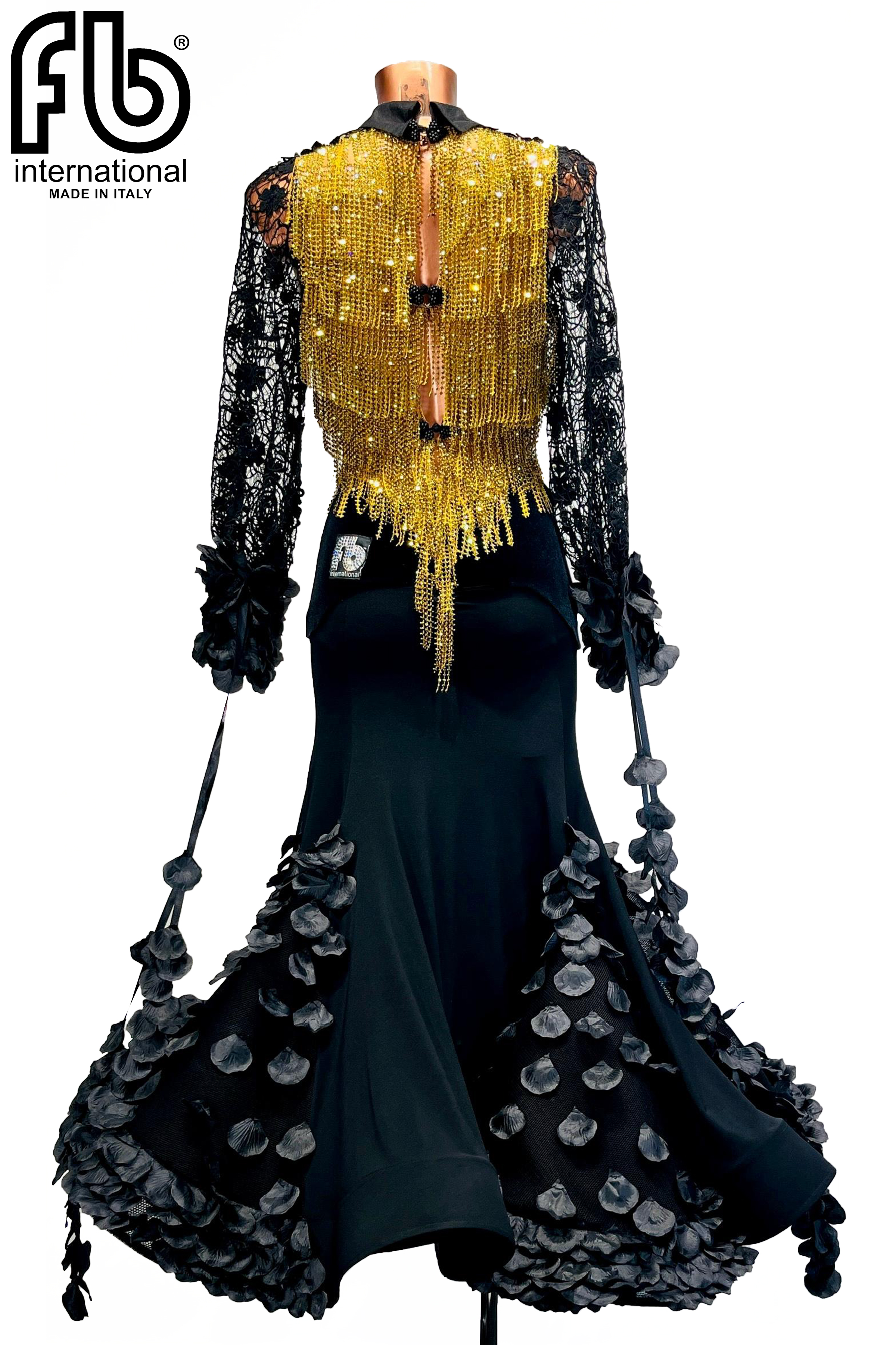 Women's dress for standard/smooth dances made of velvet, lycra and lace, with long black lace sleeves, gold buttons and faux pockets, all decorated with black petals.