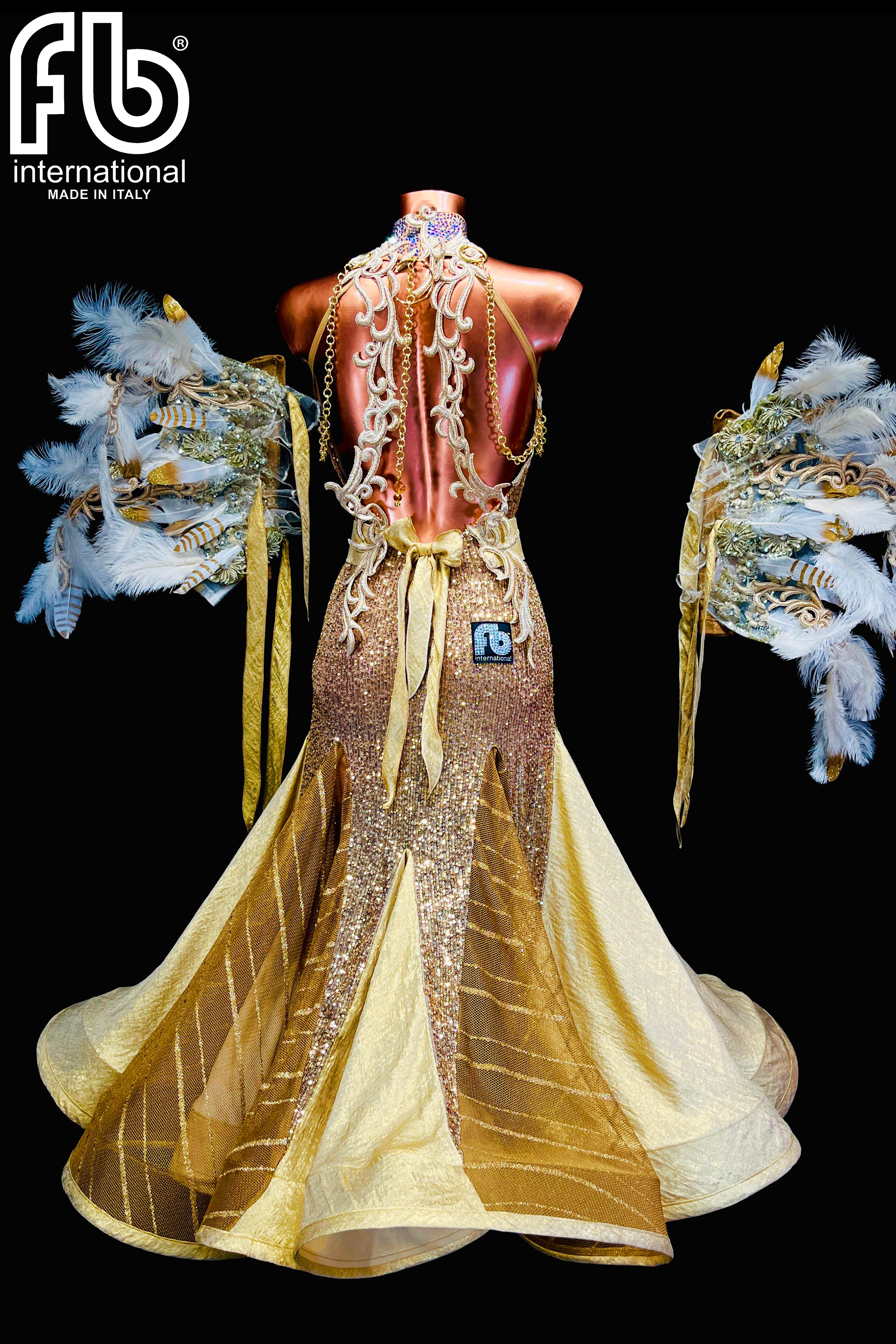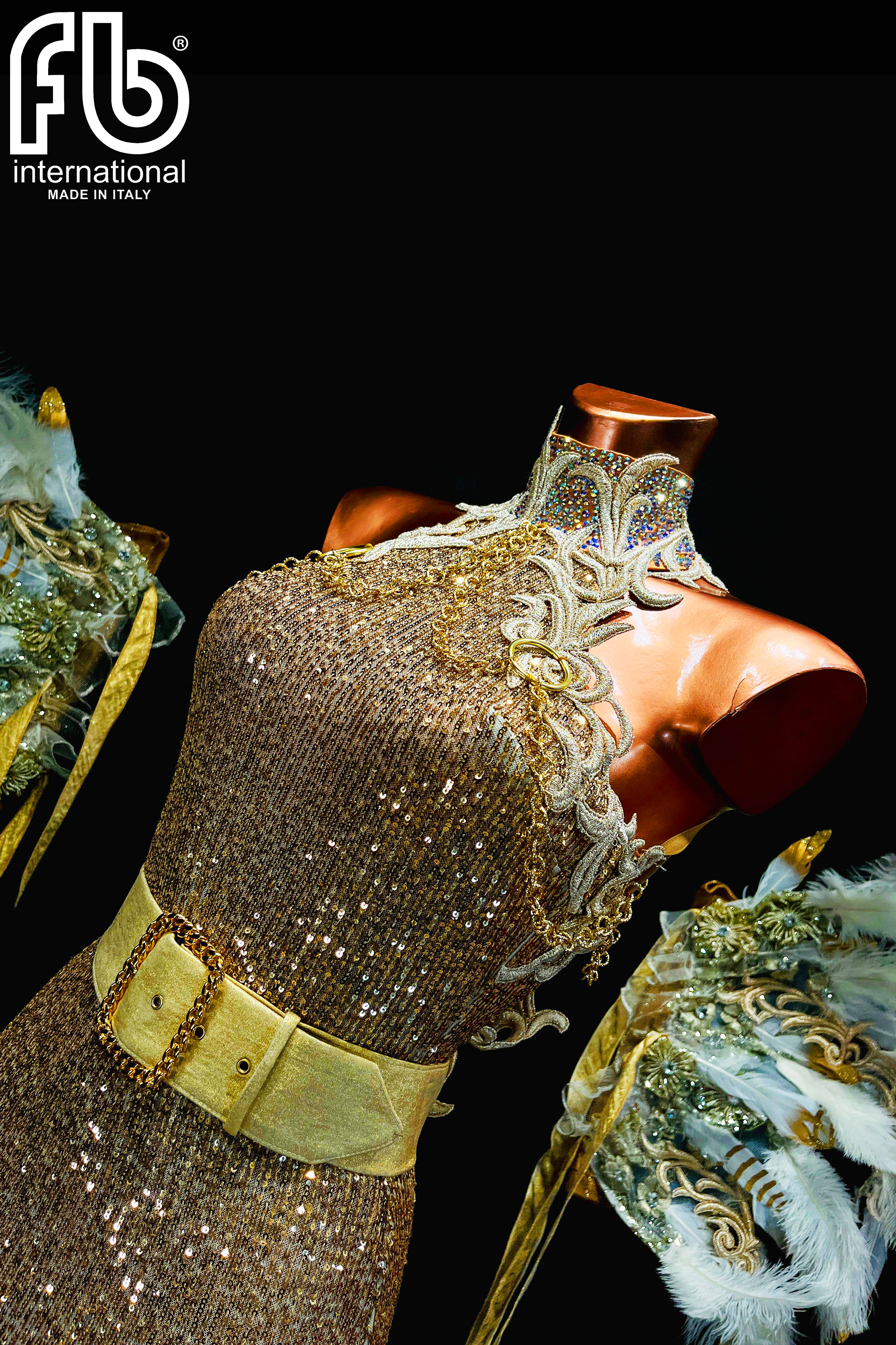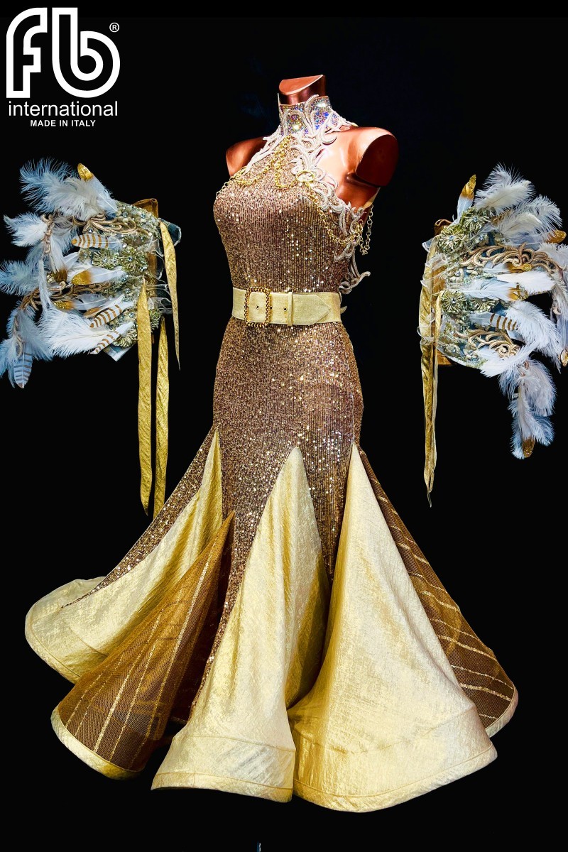 Standard/smooth dress, made of gold pailletted fabric, tightenable with belt and embellished with lace and chains.