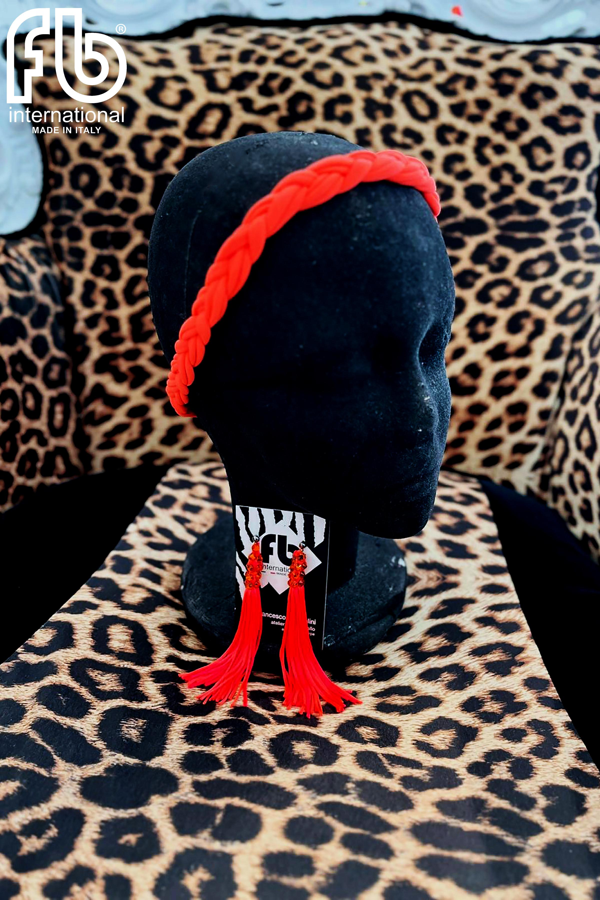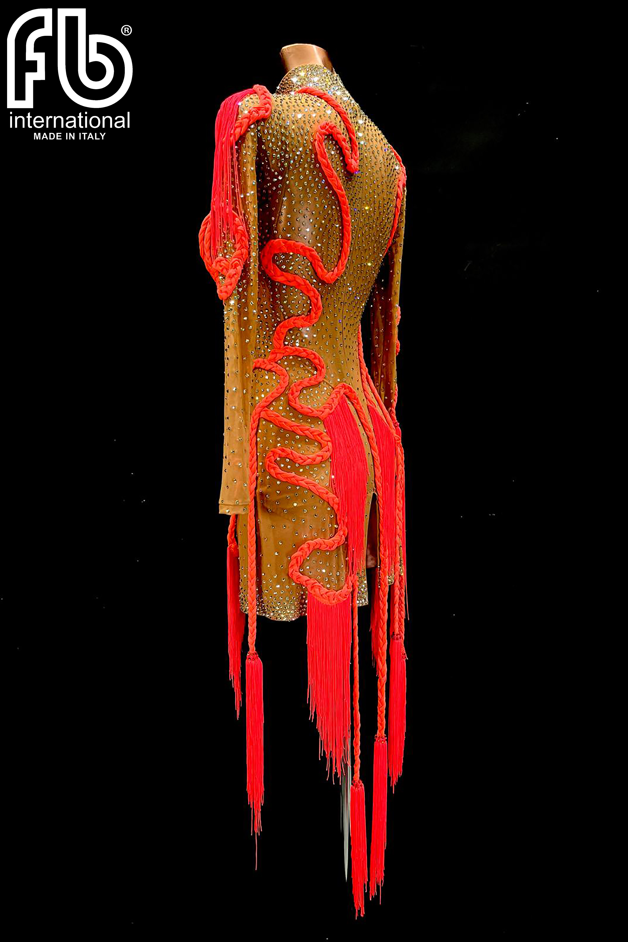 Latin dress made of mesh. Handmade neon orange braids wrap around the dress, highlighting curves. Fluorescent orange fringes provide