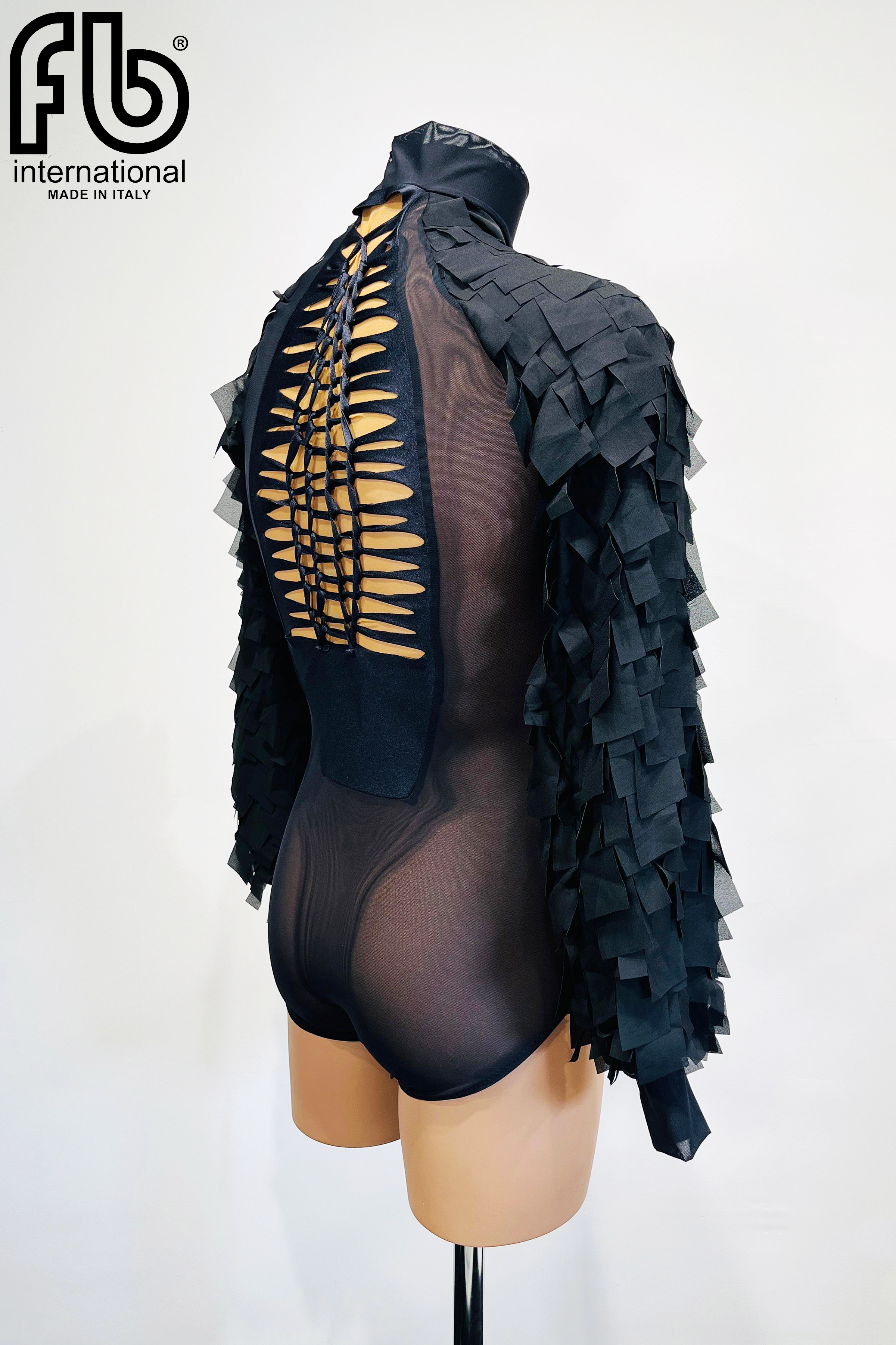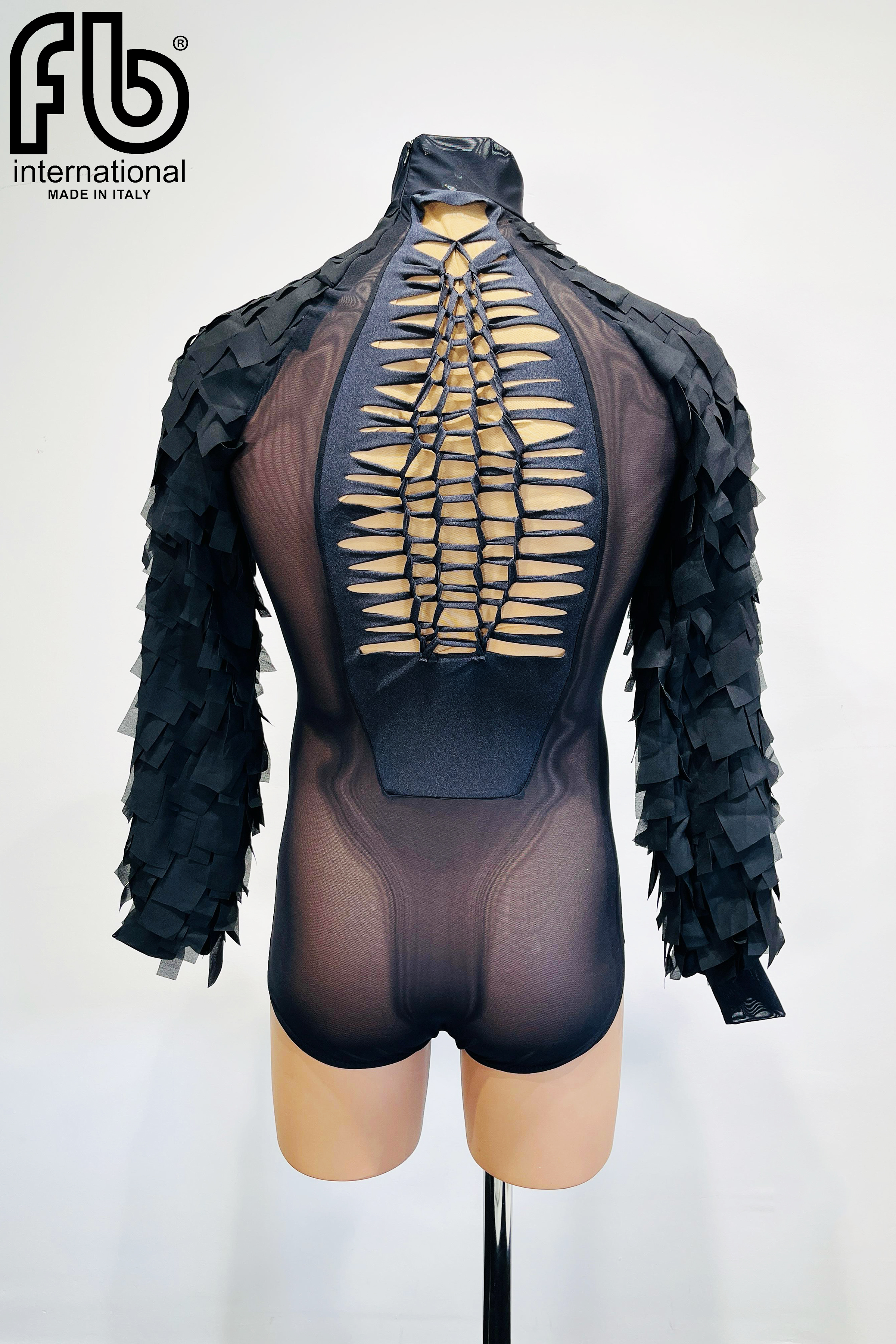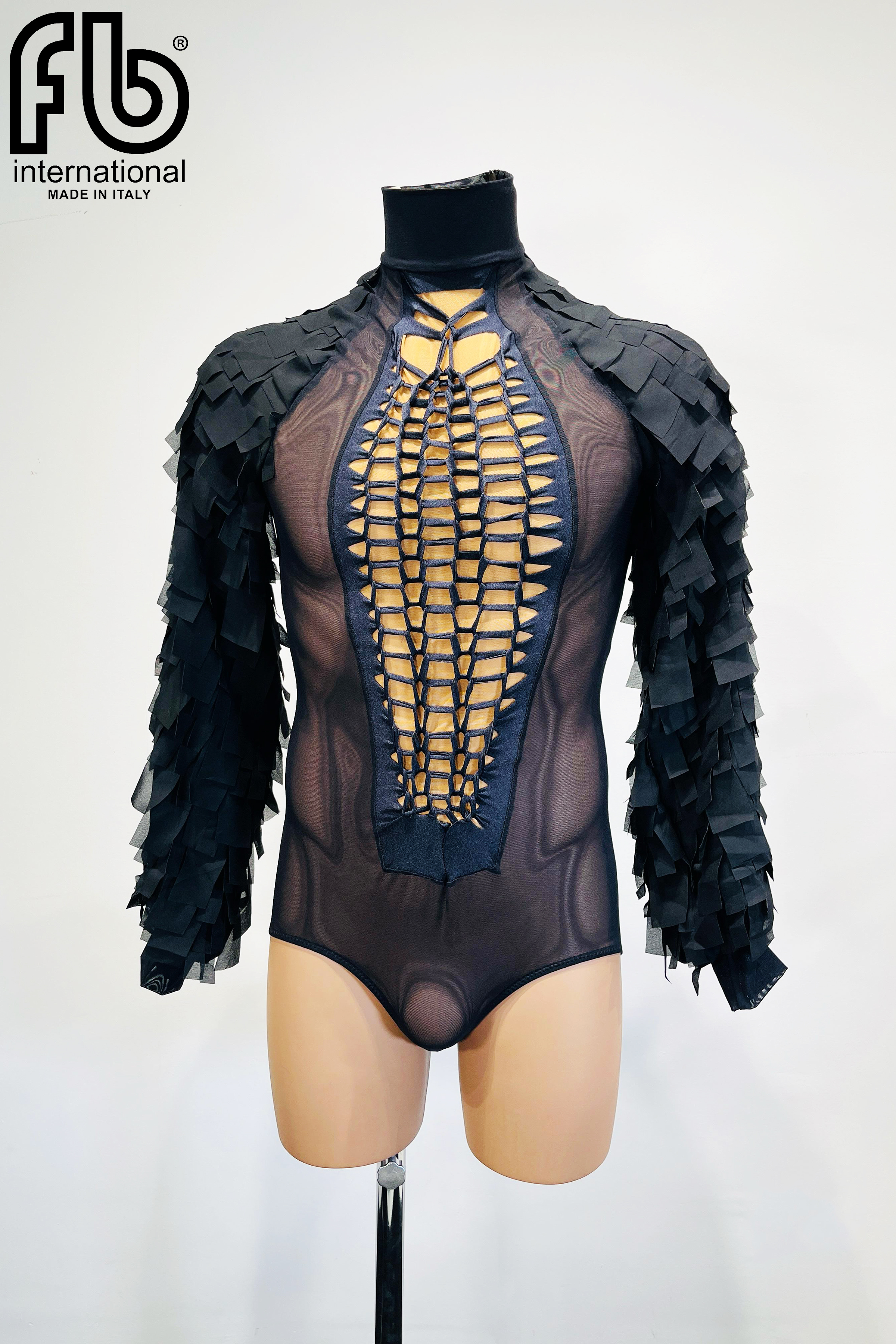 Men's Latin dance shirt made of mesh and lycra with handmade braids on chest and back, wide and voluminous sleeve made of 3D fabric.