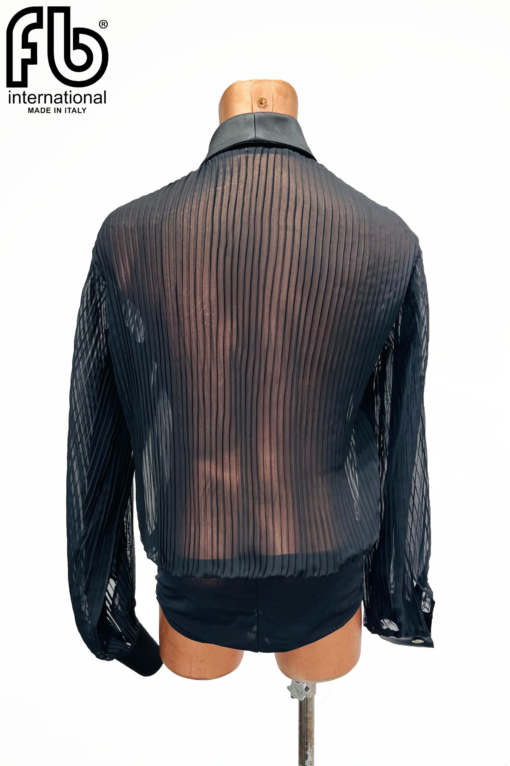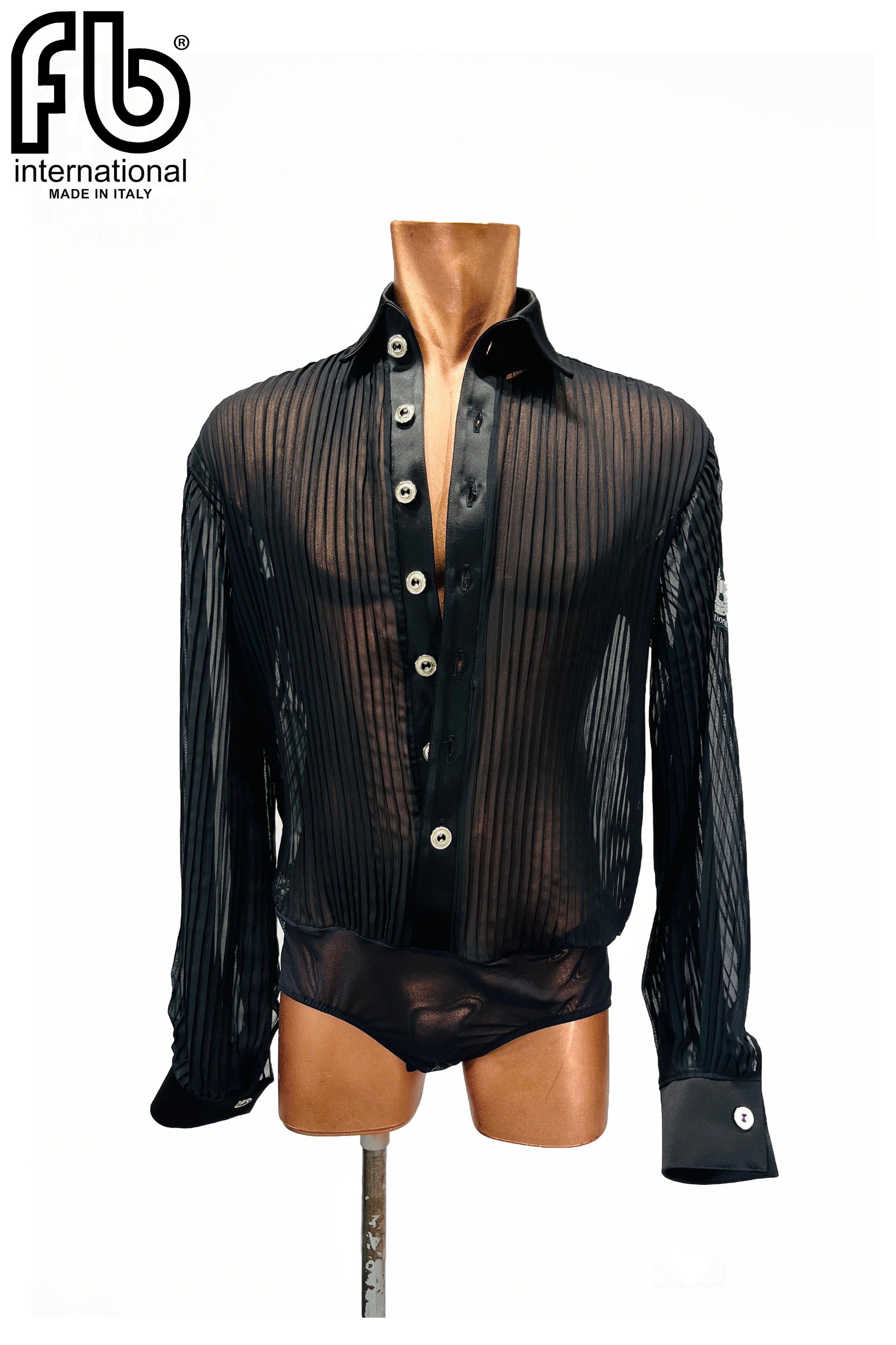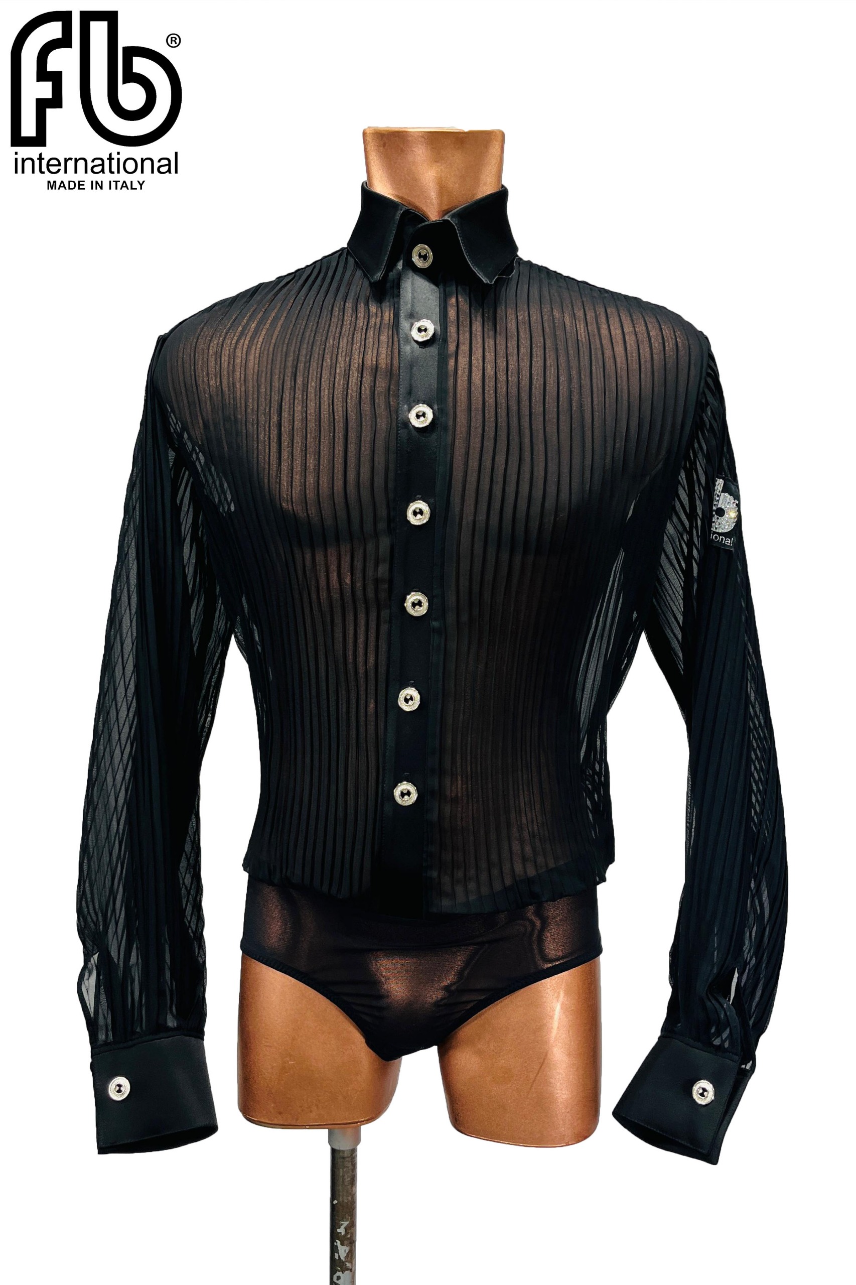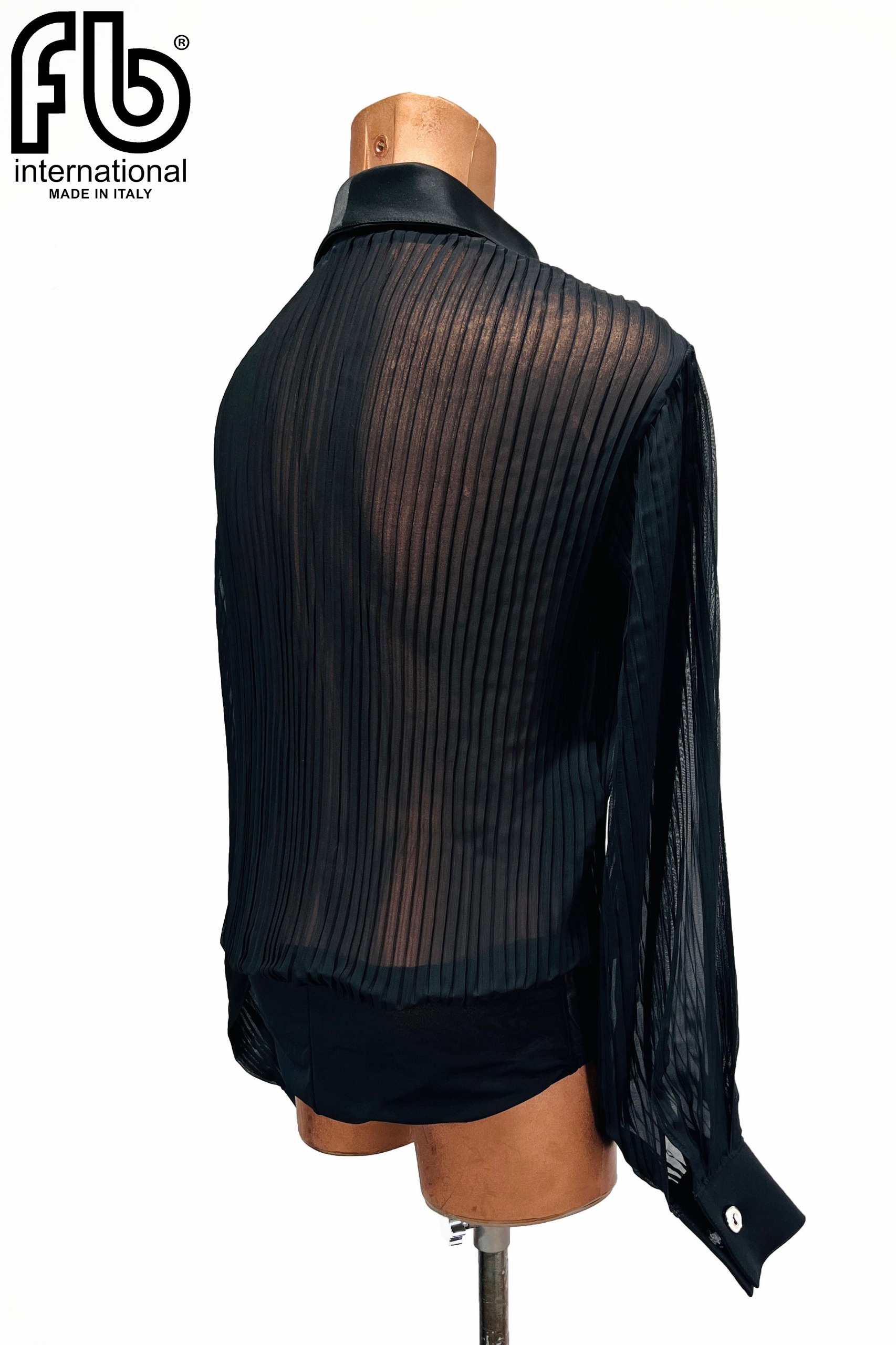 Men's shirt for latin dance made of made of pleated georgette with satin shirt collar and cuffs and gold buttons.