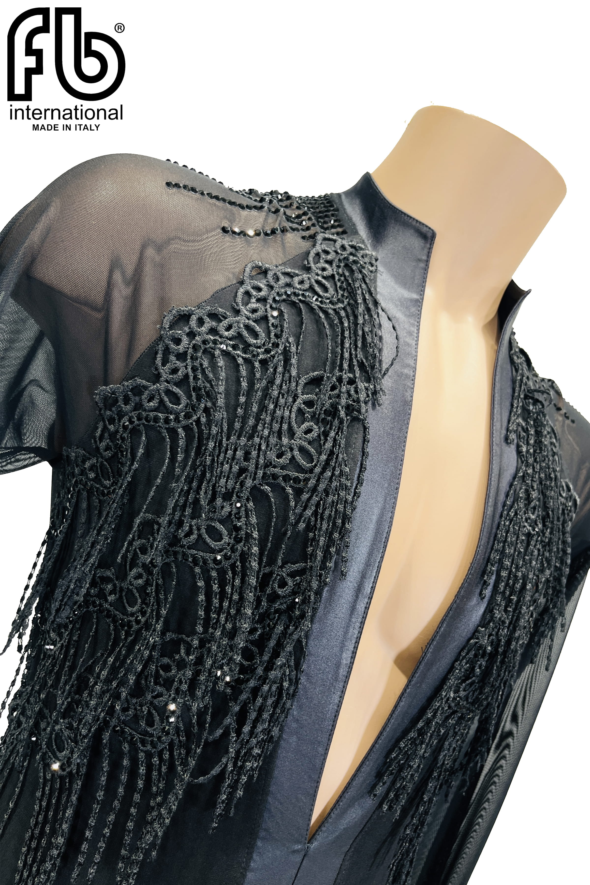 Men's shirt for Latin dances made of mesh, satin and lace with fringes that create quick and snappy movements, decorated with jet rhinestones.