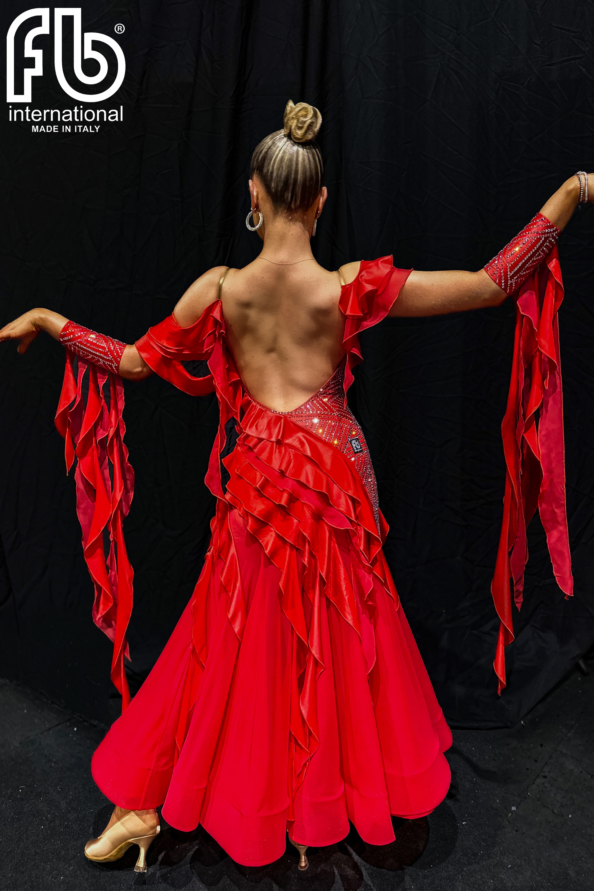Women's dress for standard/smooth dances made of shiny red fabric and mesh skirt with wings included. Decorated with crystal rhinestones. SIZE: This dress fits well an S/M size.