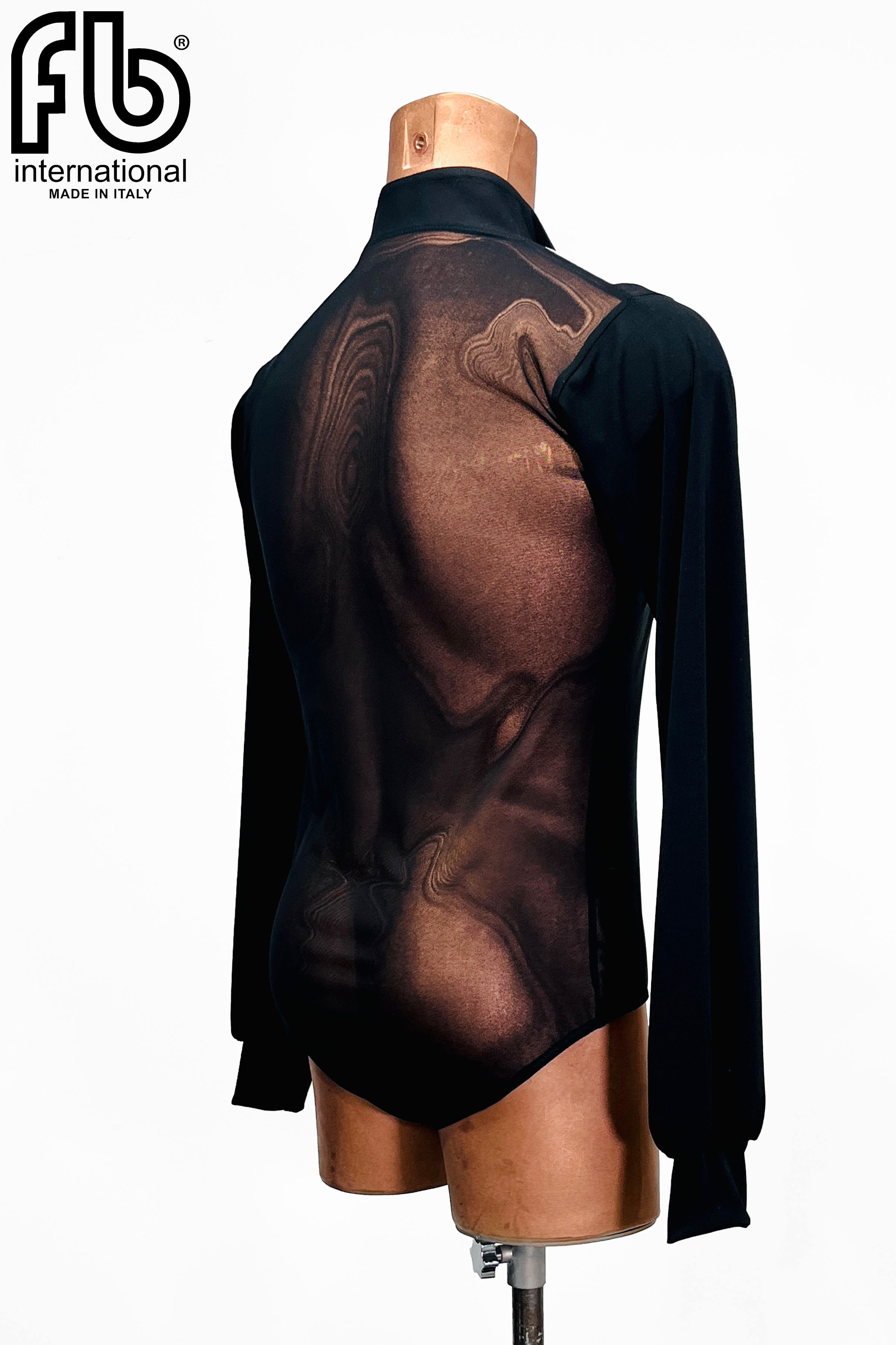 Camicia da uomo per danze latine realizzata in retina nera e tessuto bianco damascato, a maniche lunghe con strass jet hematite sul colletto.