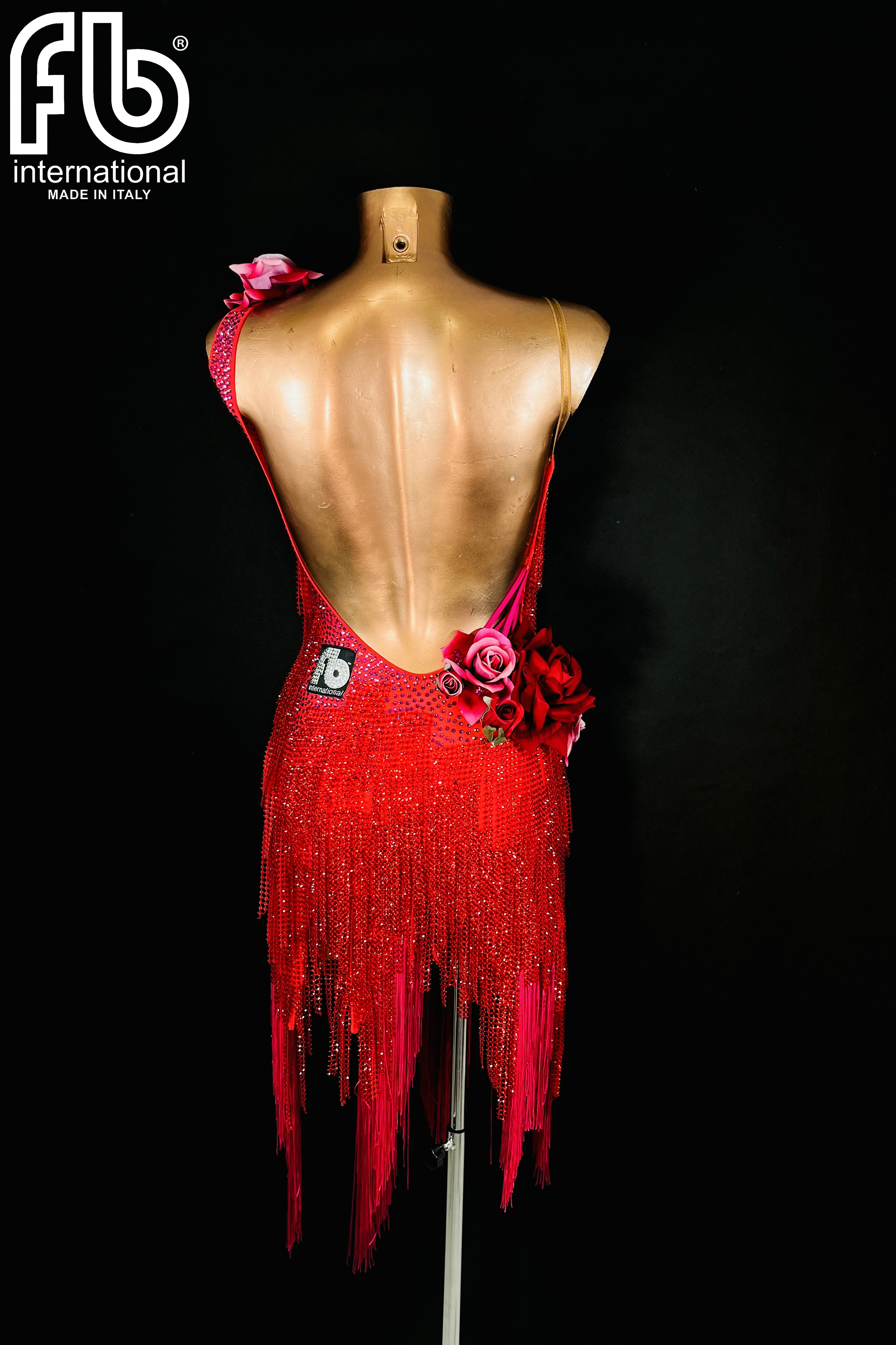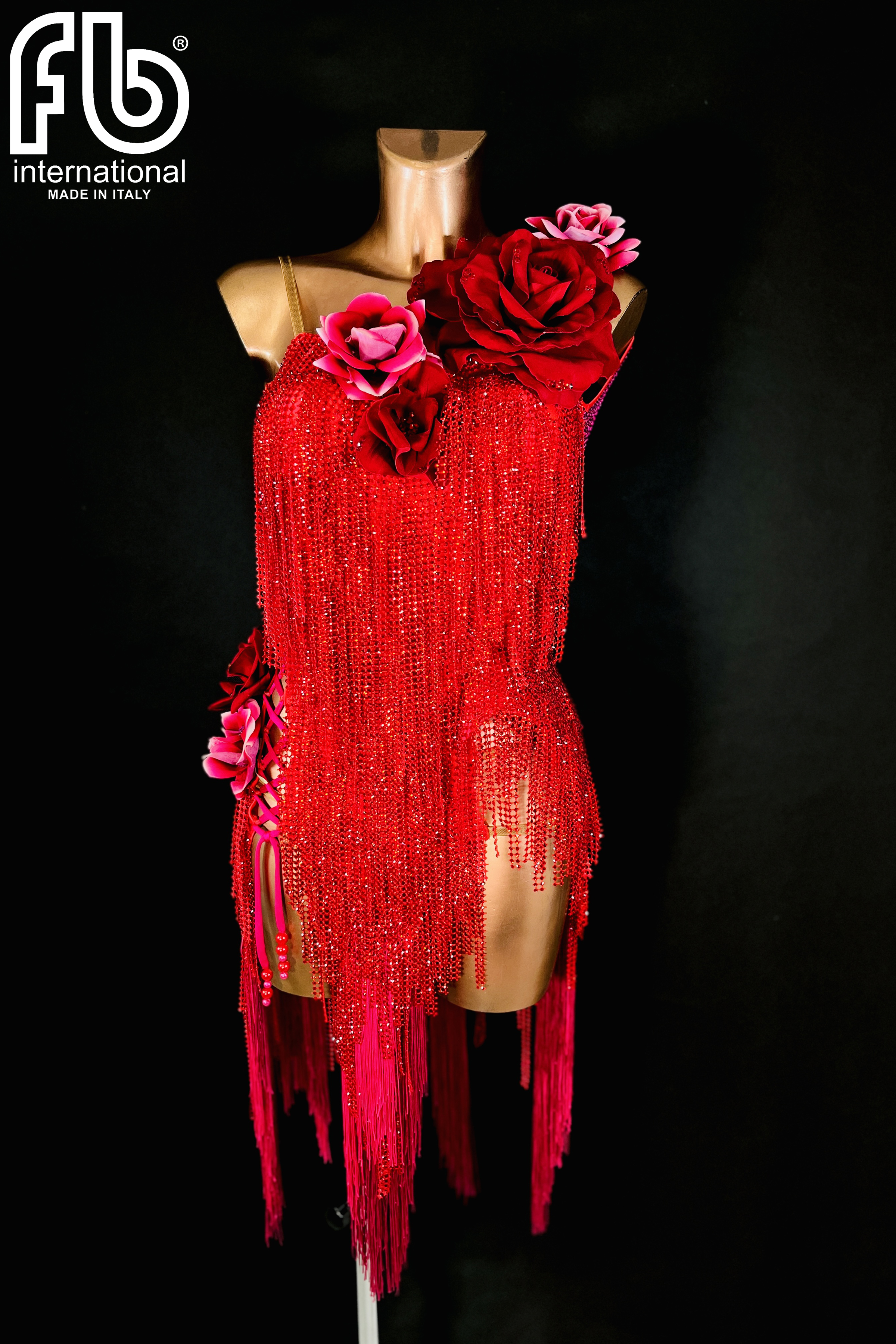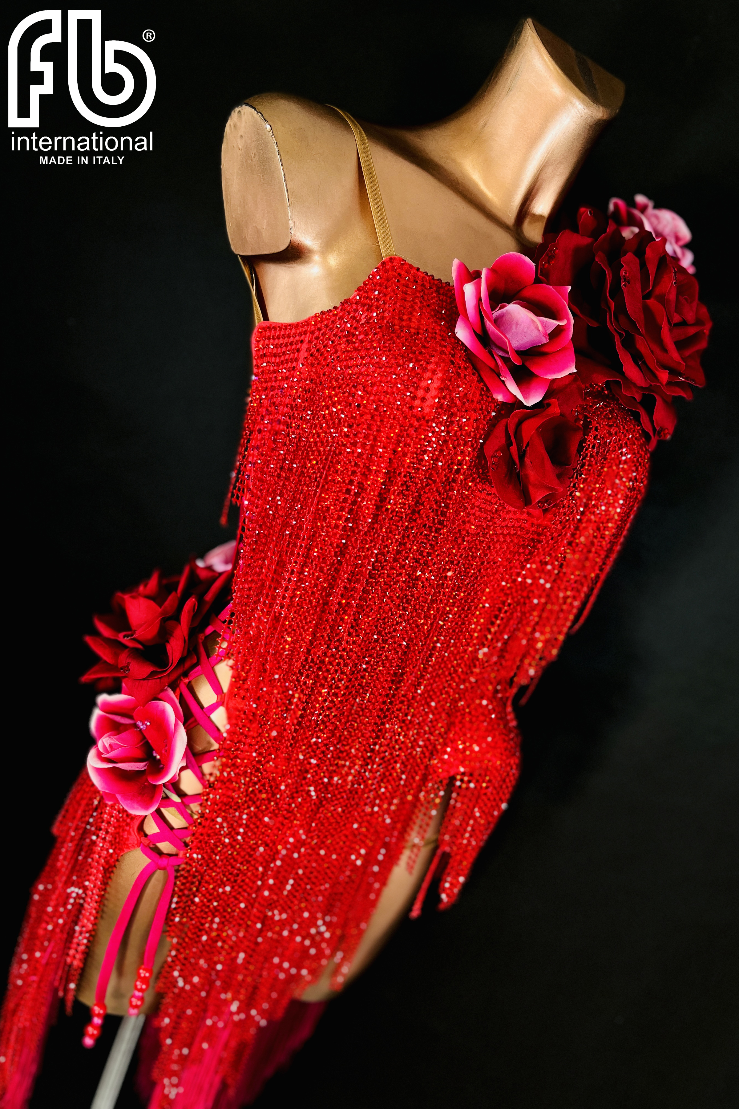 Abito da donna per danze latine realizzato in una luminosa rete di strass rossa con vistose decorazioni floreali e frange sulla gonna per creare movimento.