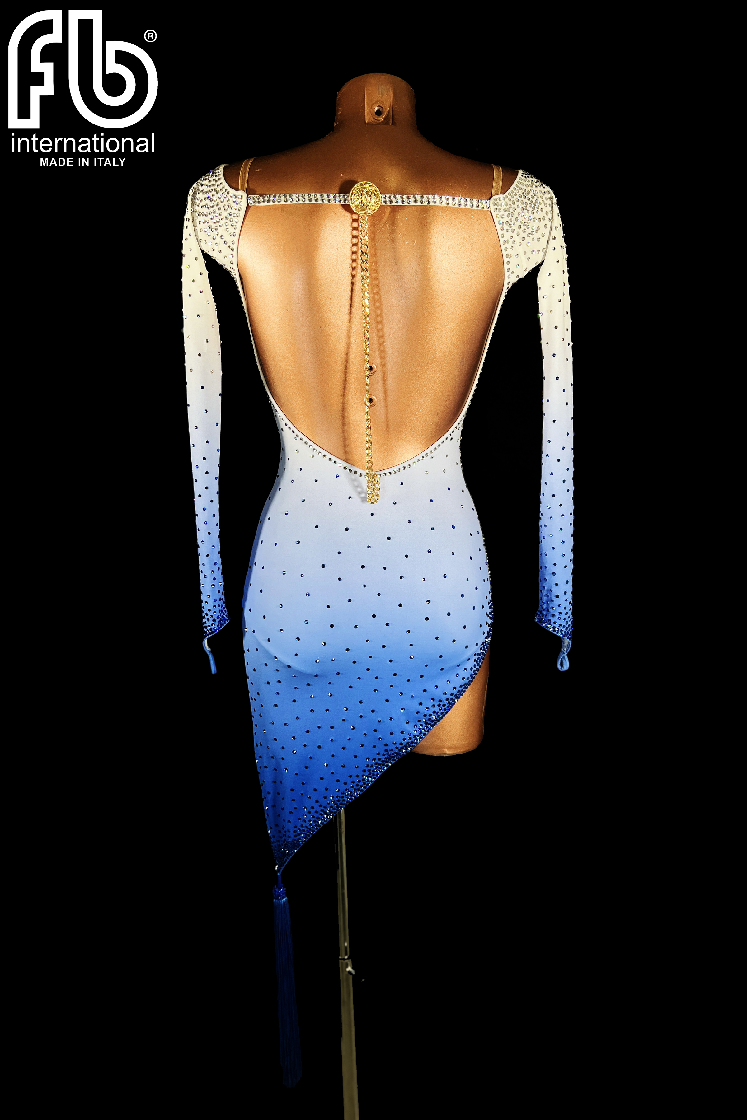 Abito latino realizzato in preziosa lycra sfumata dal bianco al blu e tempestata di strass crystal e blu, manica lunga a punta sulla mano, gonna asimmetrica con nappo di frange blu e schiena scoperta con catena e sigillo oro.