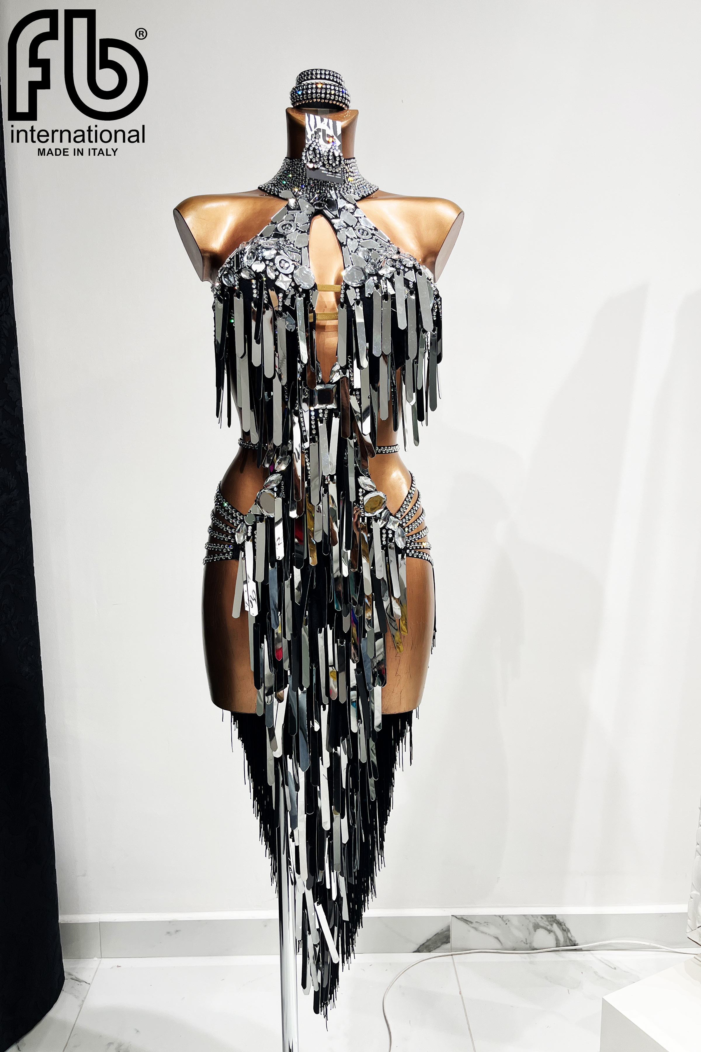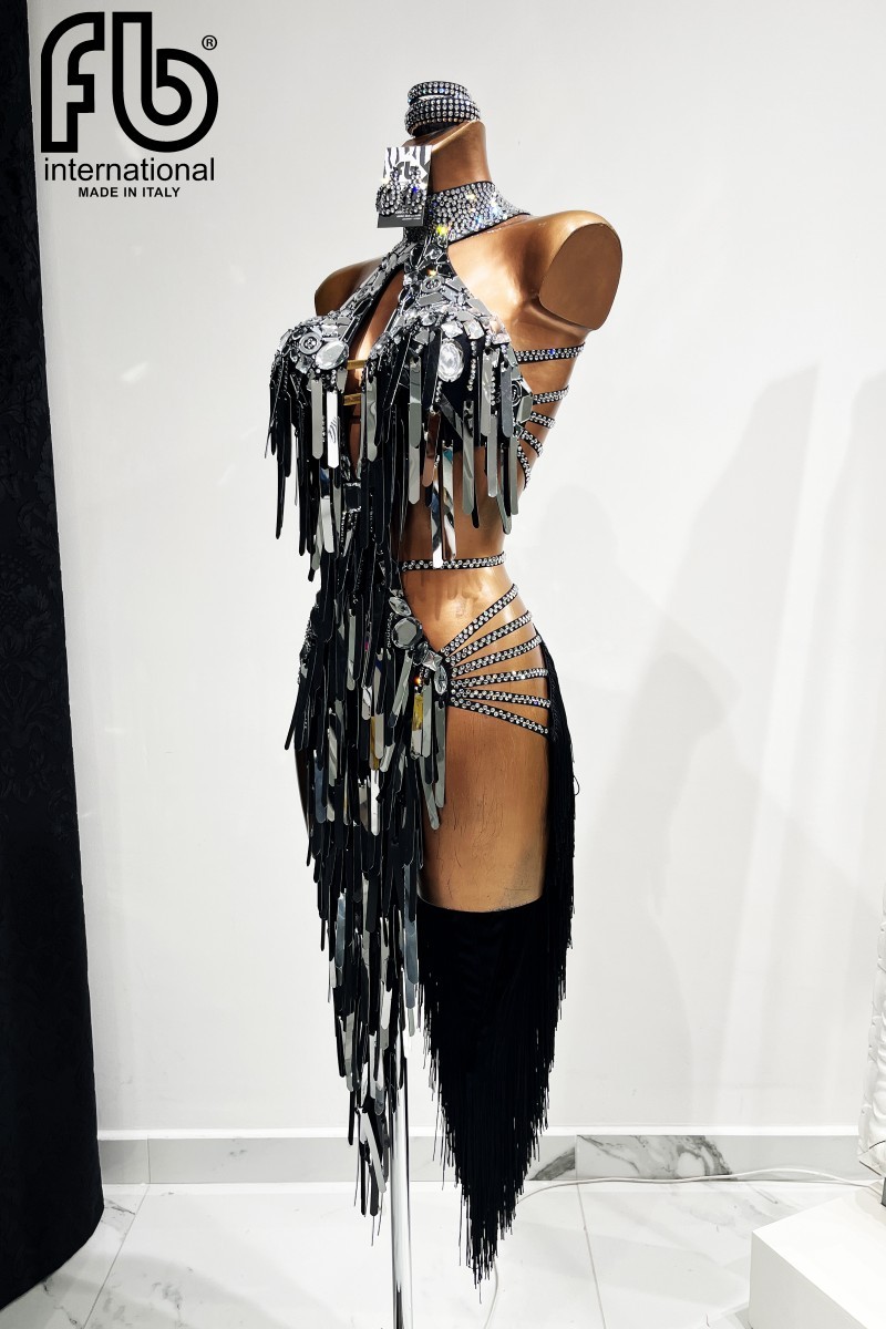 Luminoso abito latino per danza sportiva, gonna a punta di frange, collo alto, corpetto con ricco ricamo di strass crystal, specchietti argento e frange con specchietti. Aperture sui fianchi e gonna con ampio movimento. Look completato dagli accessori abbinati.