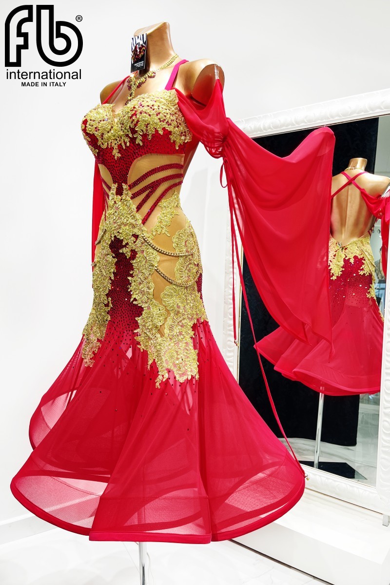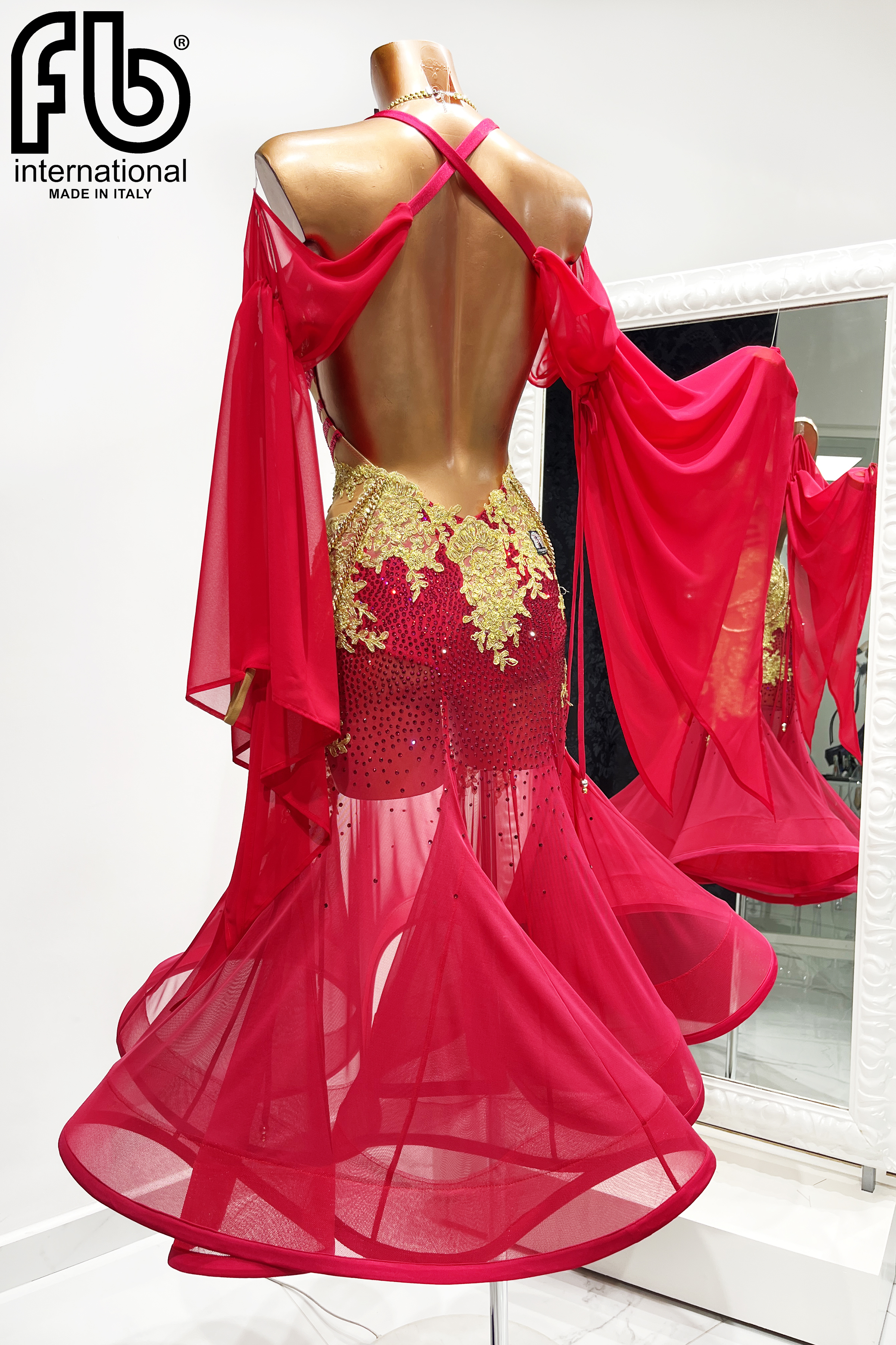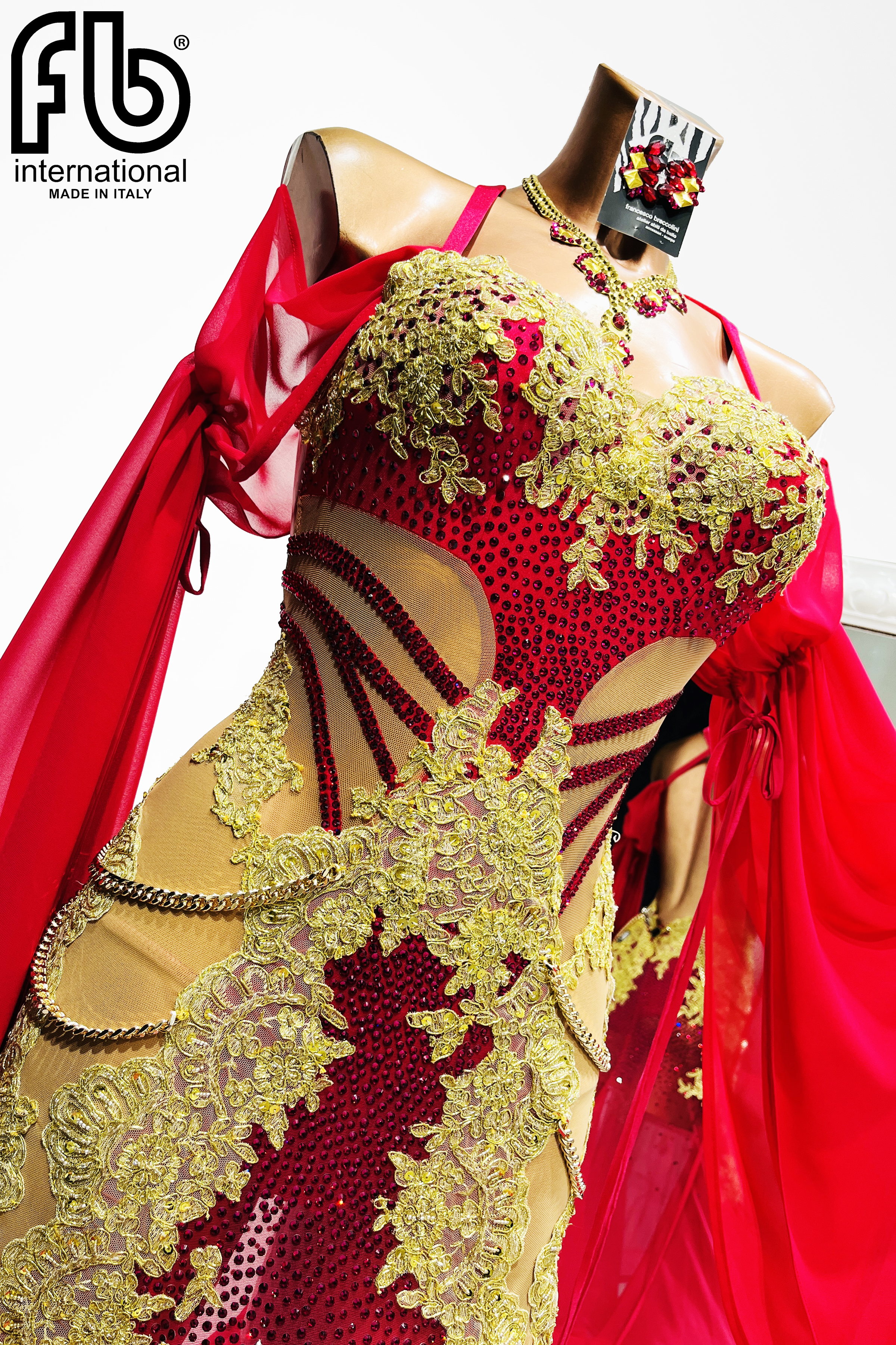 Abito da donna per danze standard realizzato in gerorgette rosso scuro, ricco ricamo con strass dorato e strass tono su tono, maniche leggere e accessori abbinati.