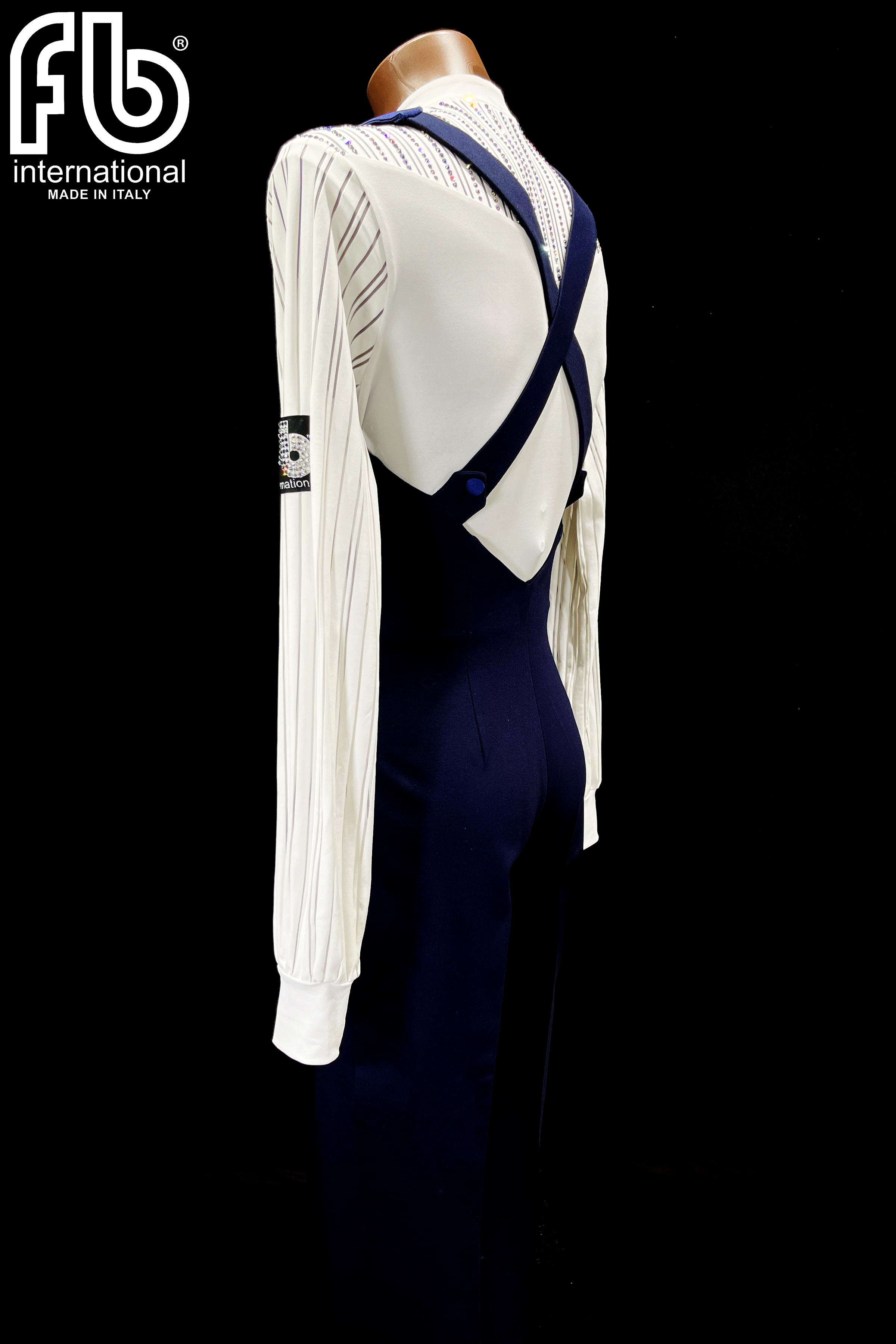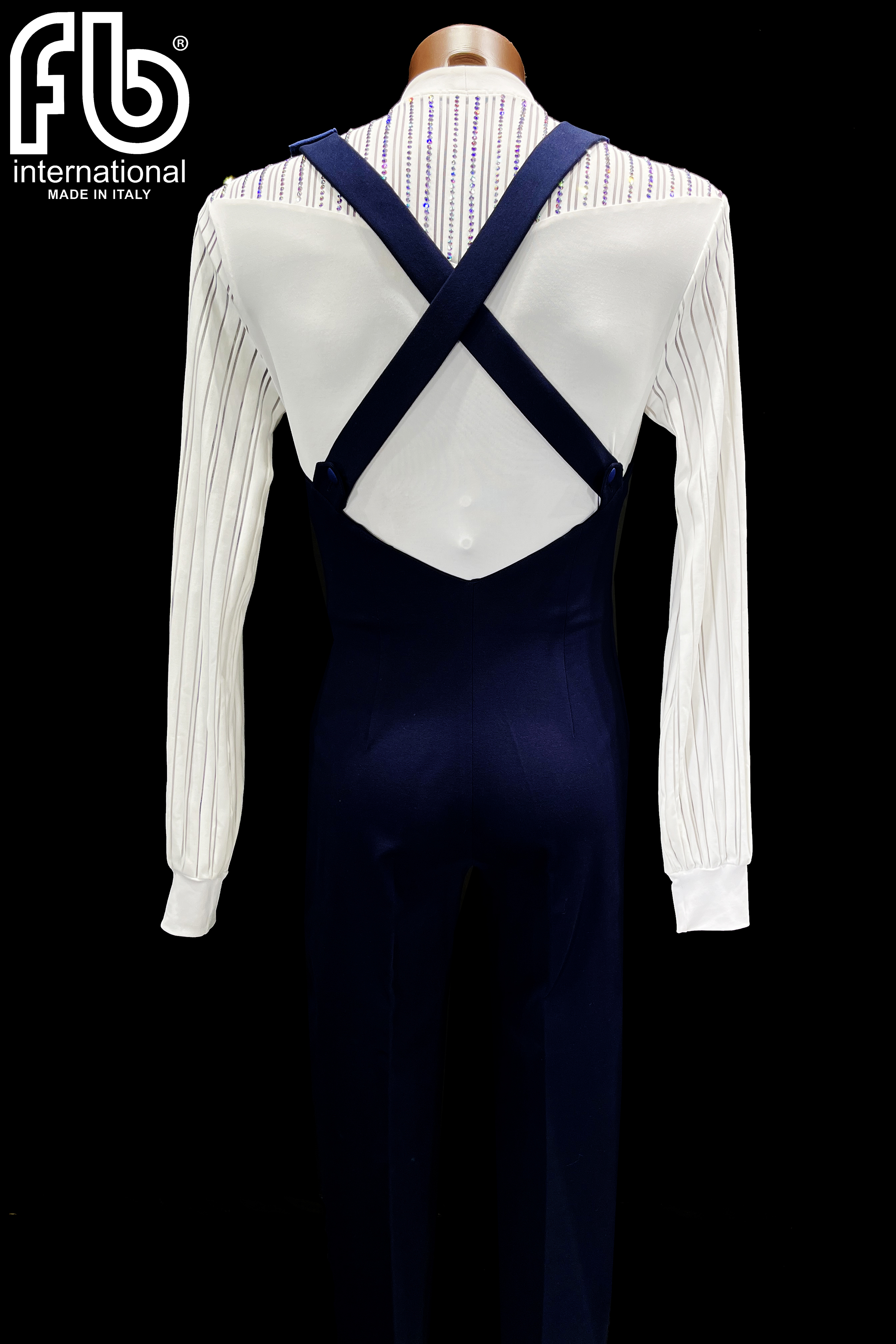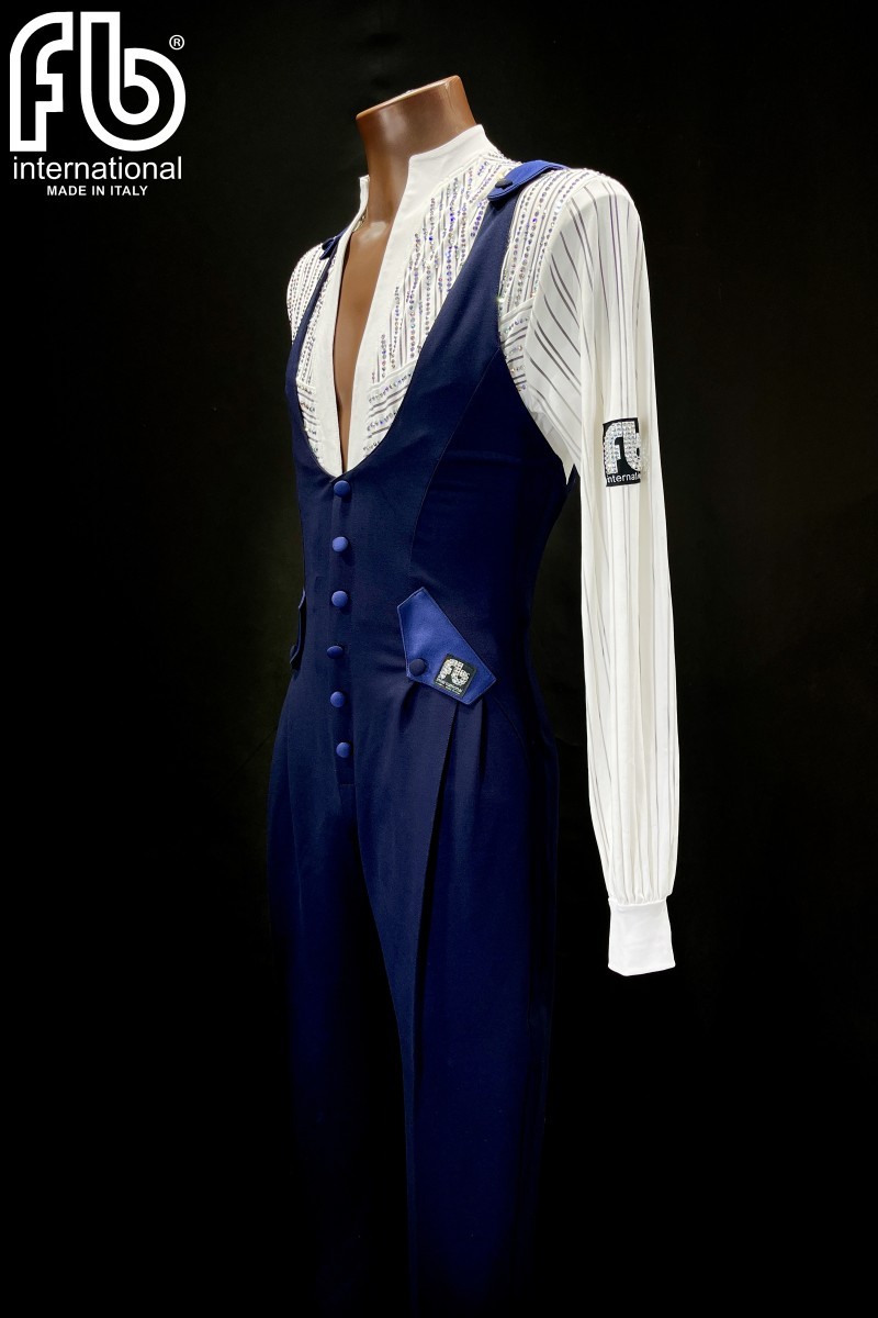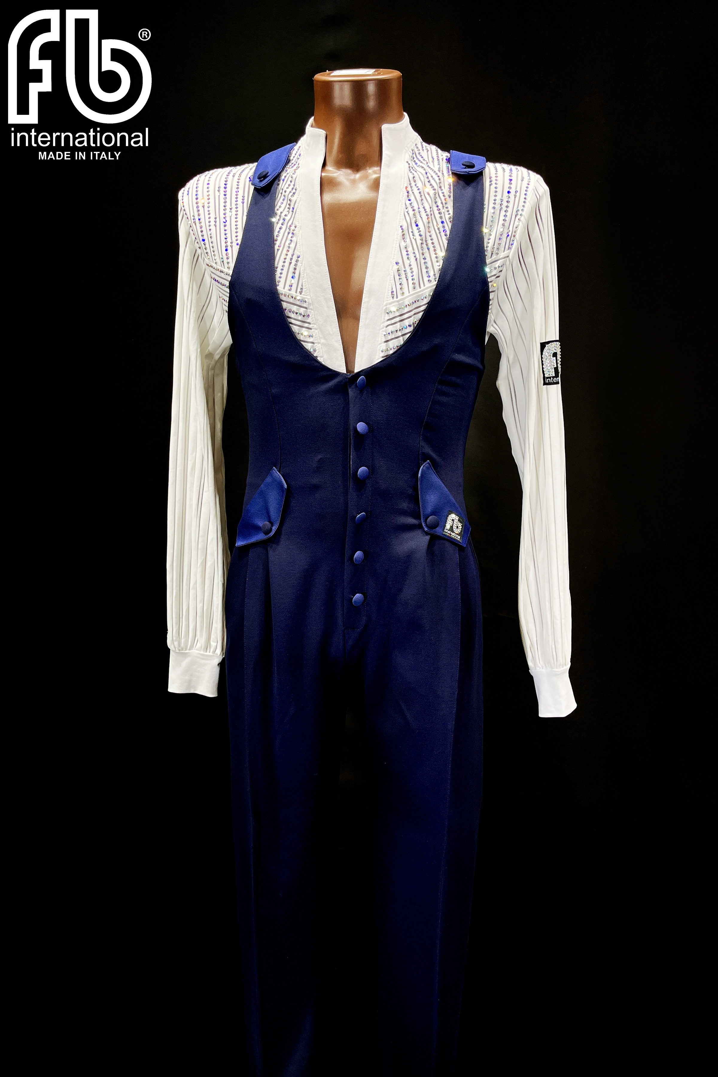 Tuta da uomo per danze latine composta da un pezzo unico gilet e pantaloni blu scuro con taschini e bottoni blu.TAGLIA:Questo completo veste bene una S/M, scrivici le tue misure di torace, vita, fianchi, controlleremo la taglia per te!