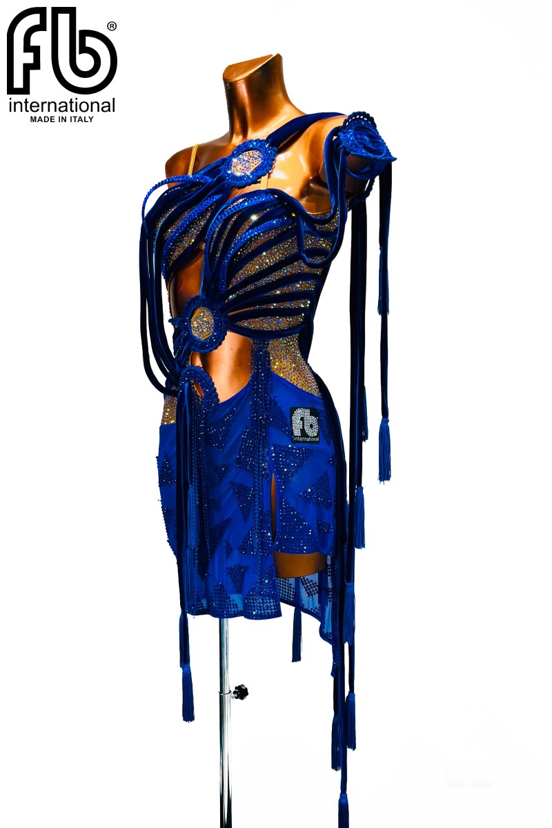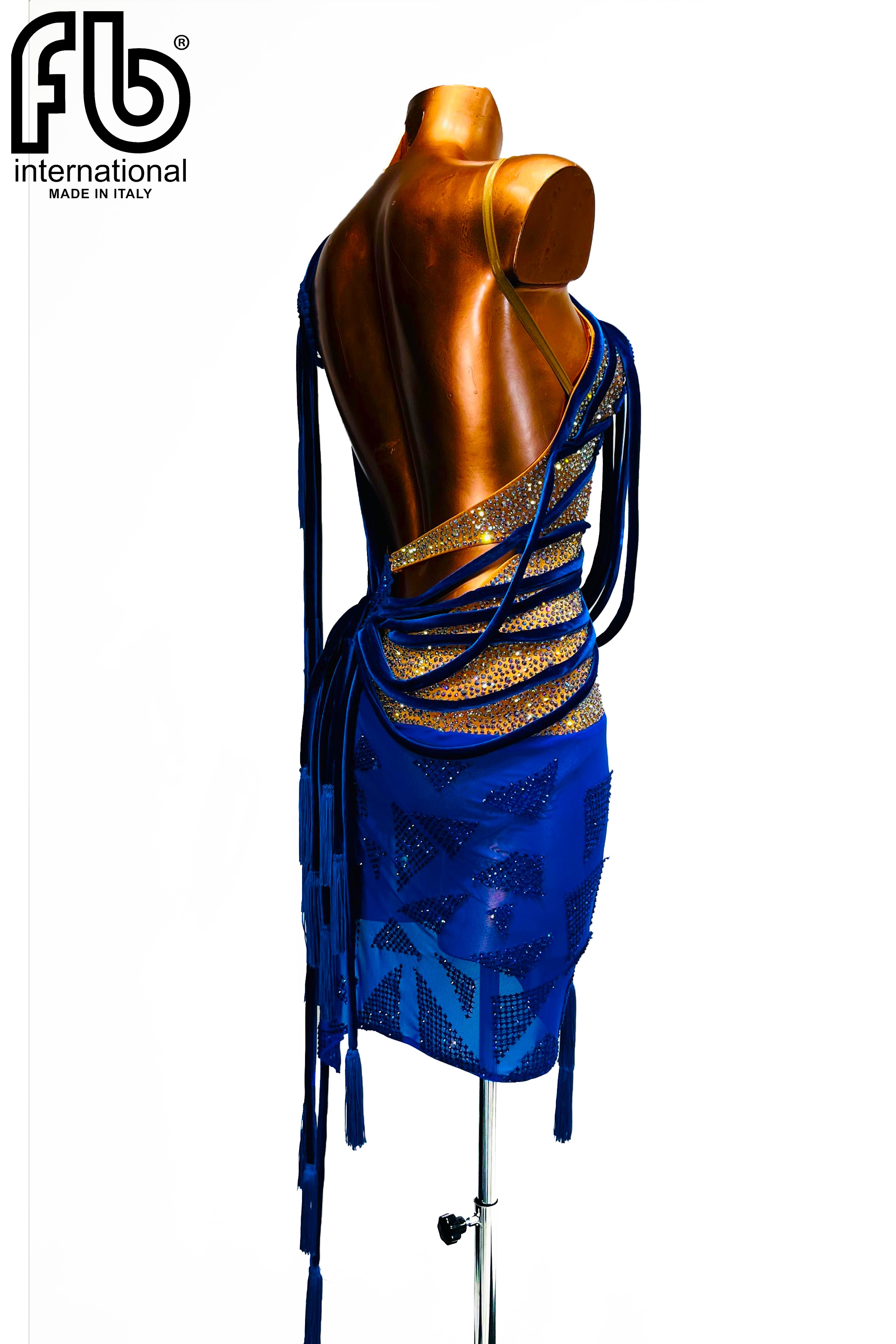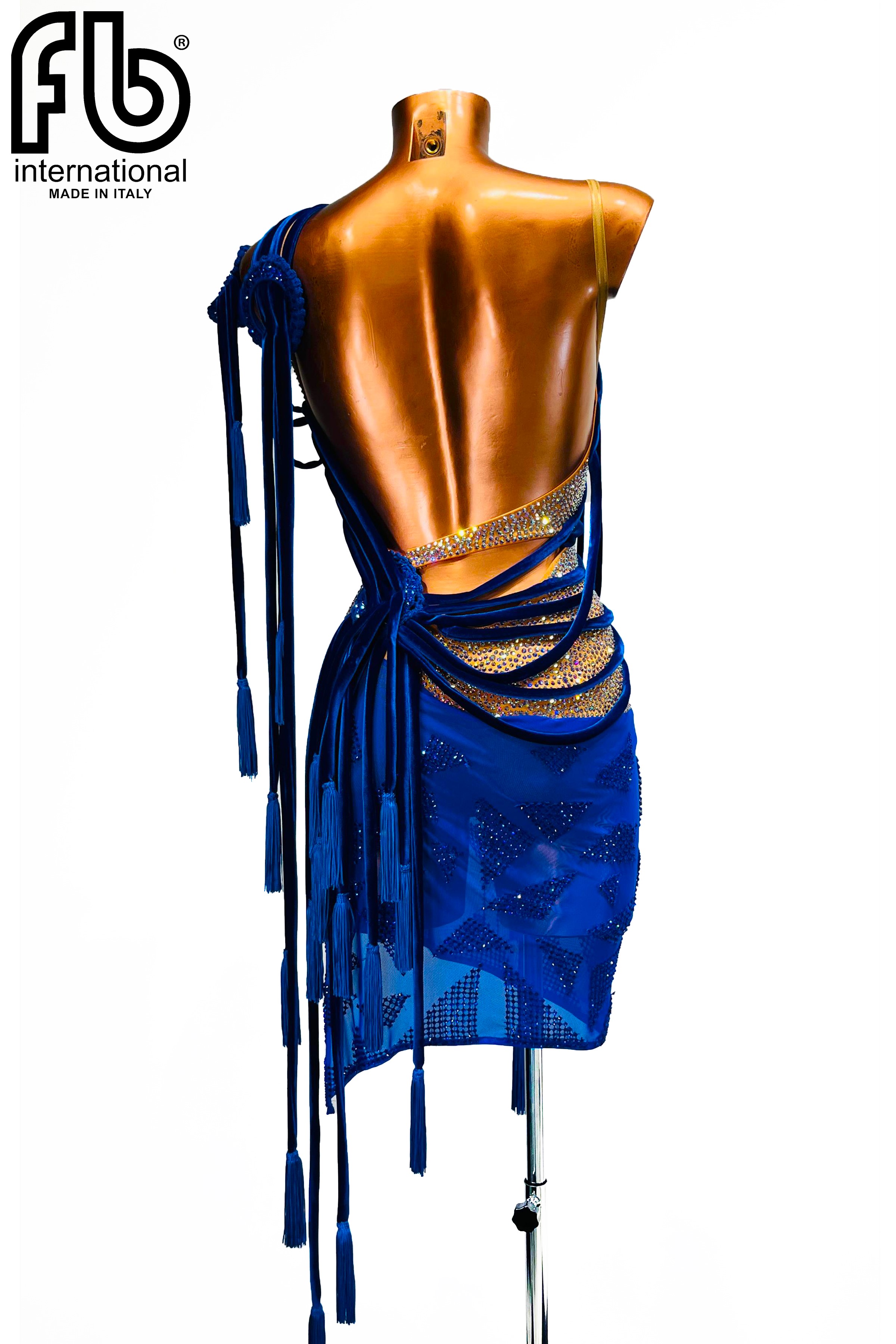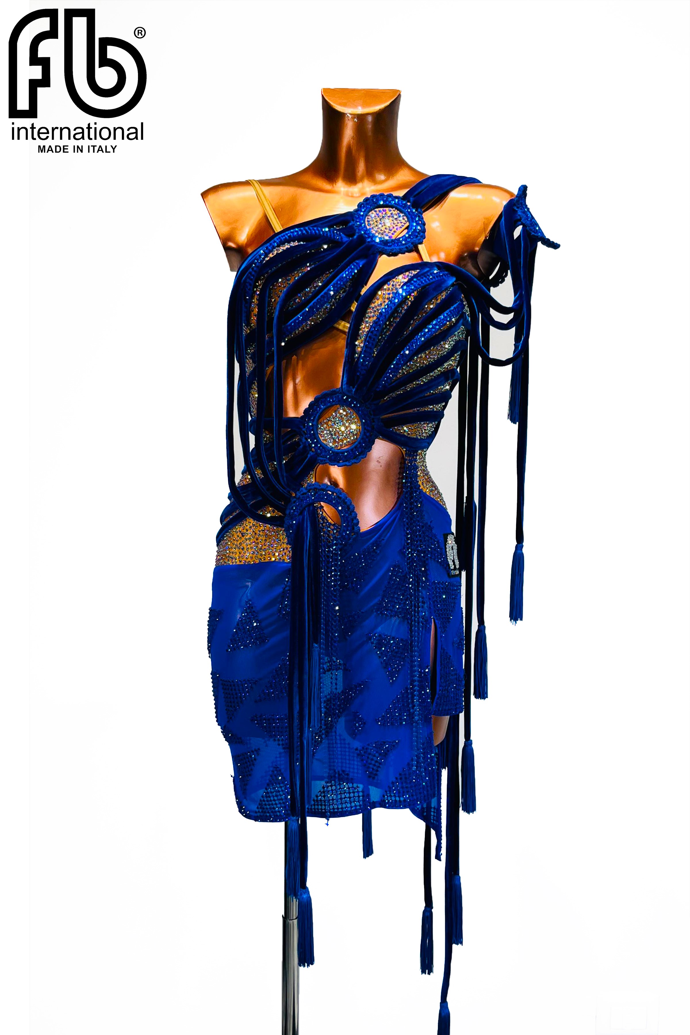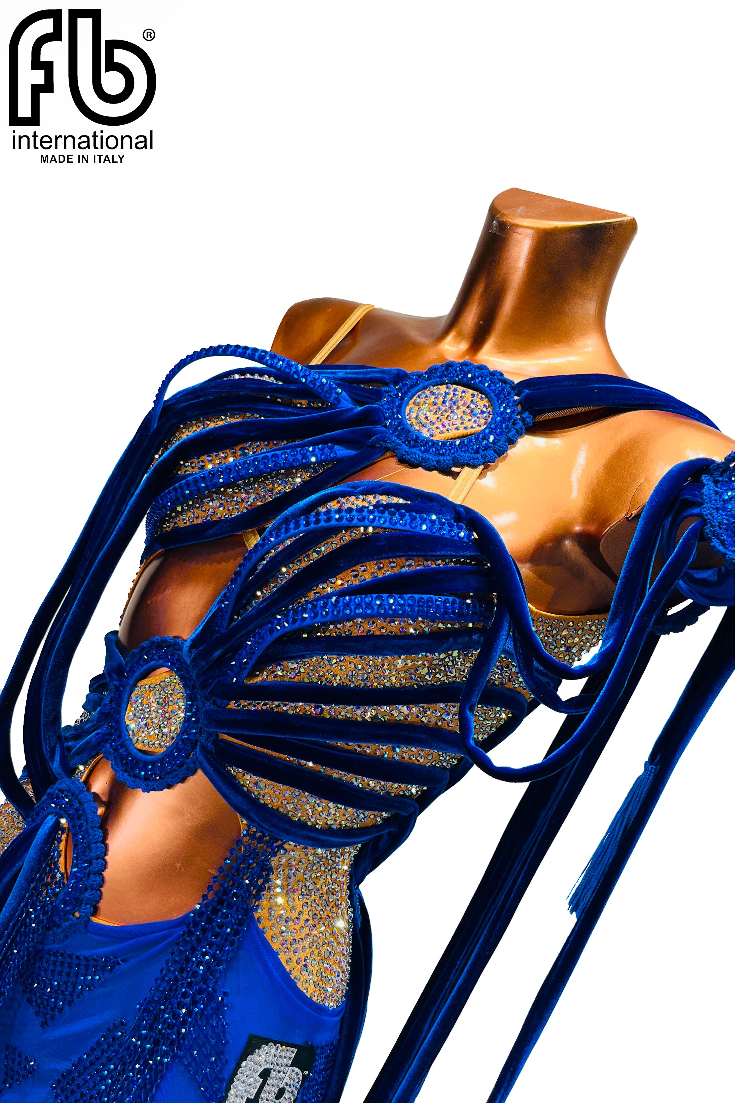 Abito da donna per danze latine in rete color carne e velluto blu con strass AB.