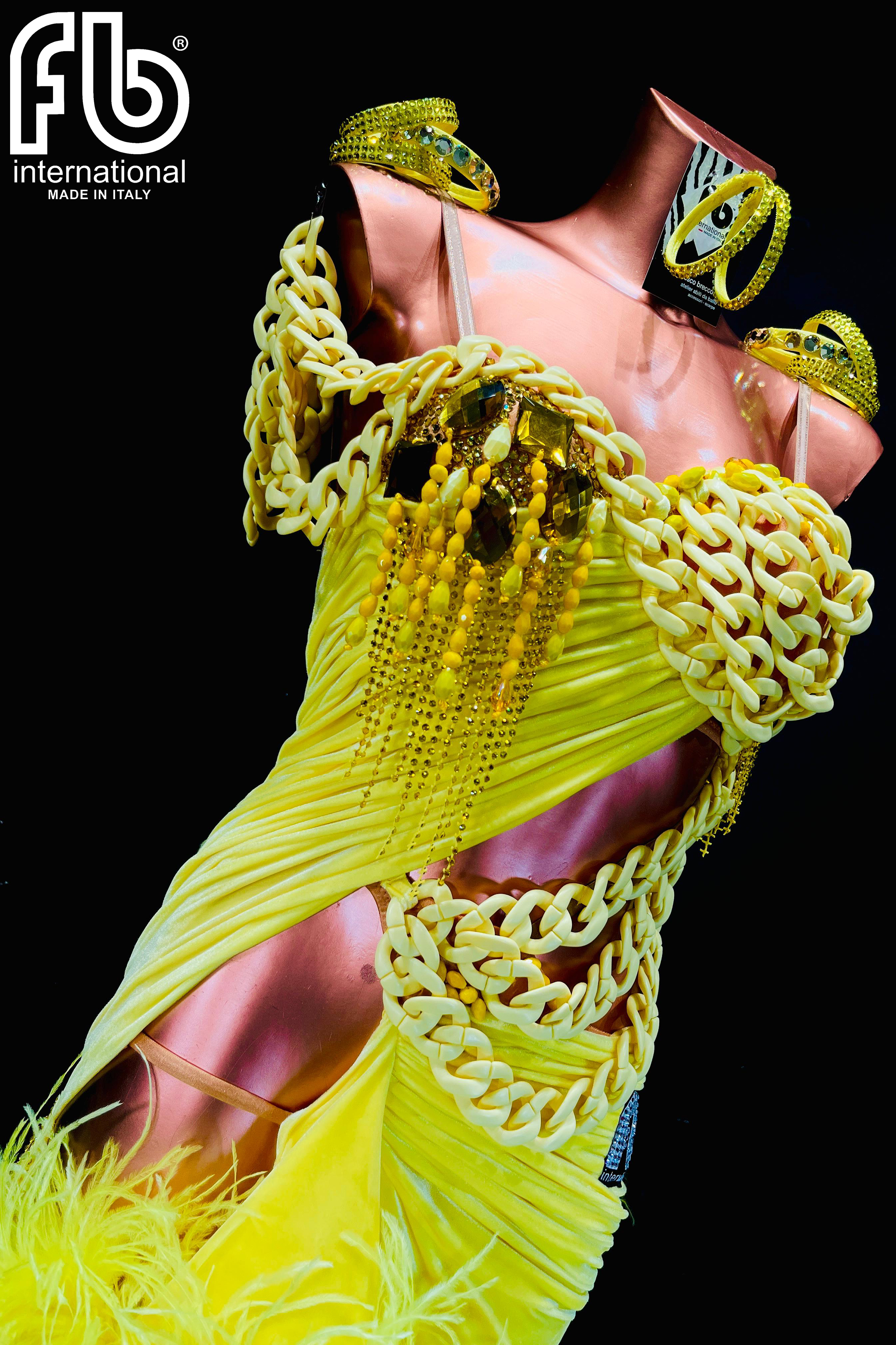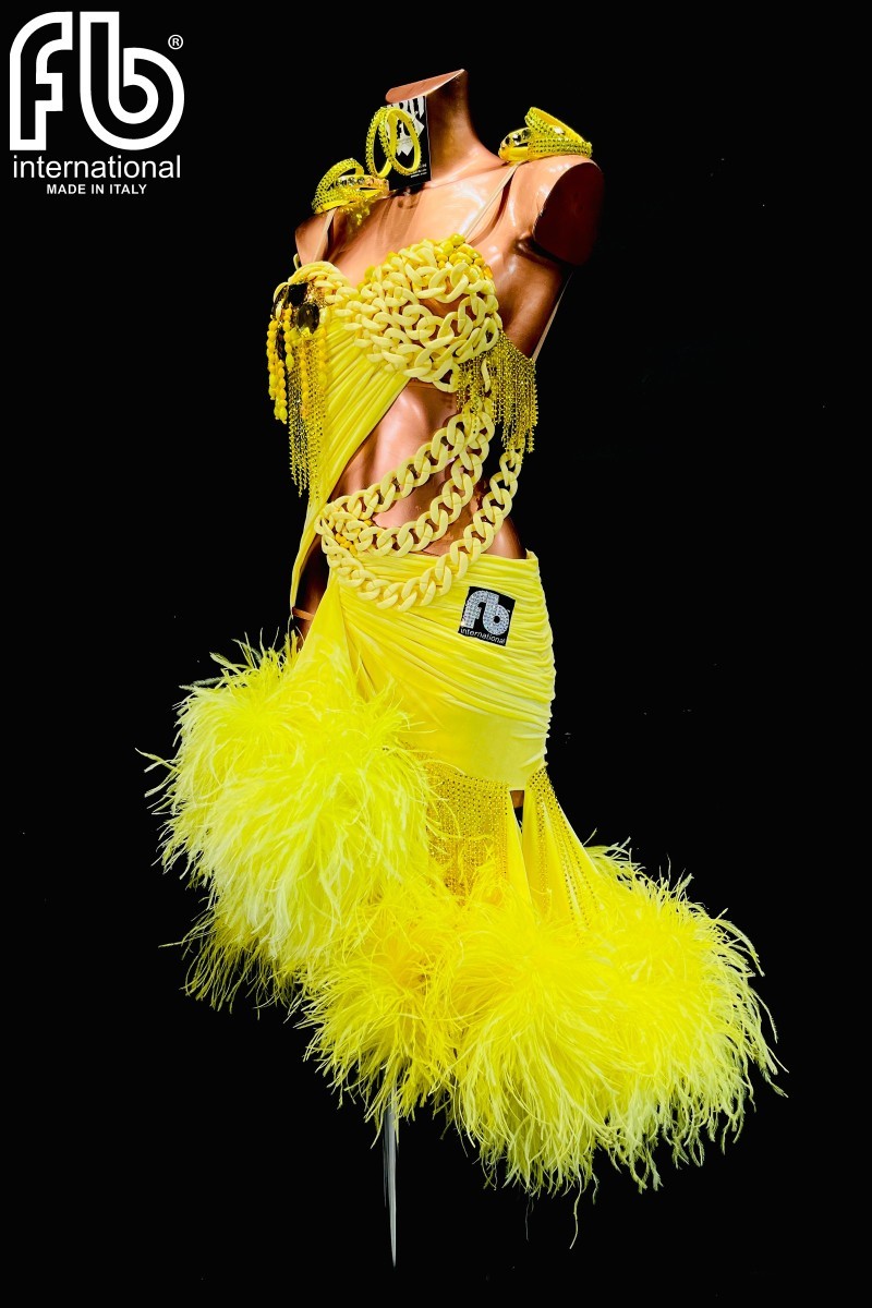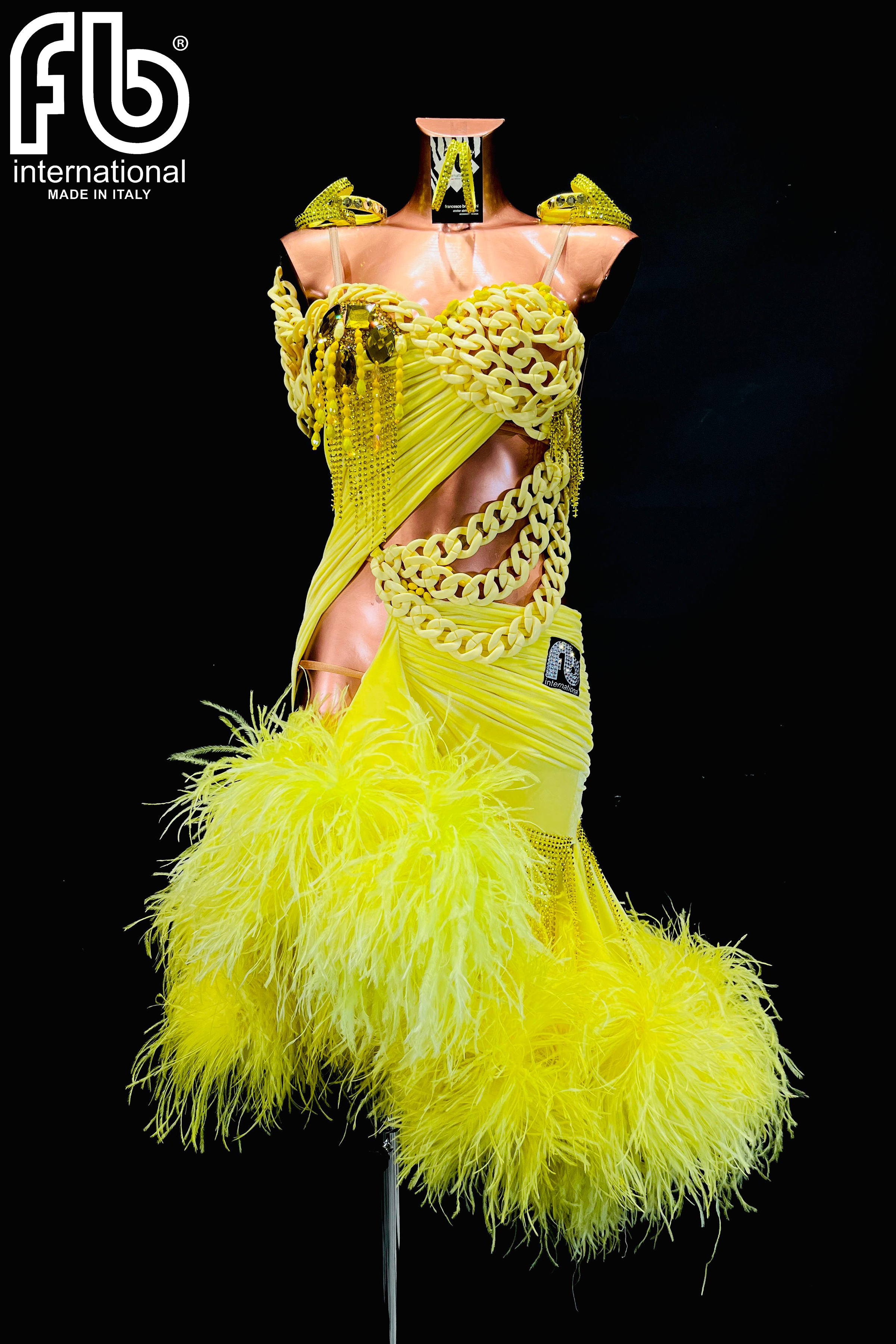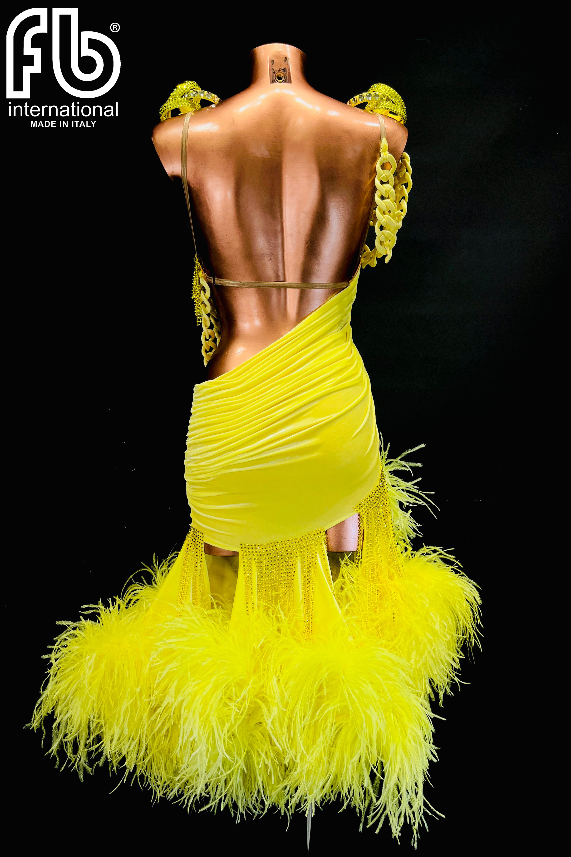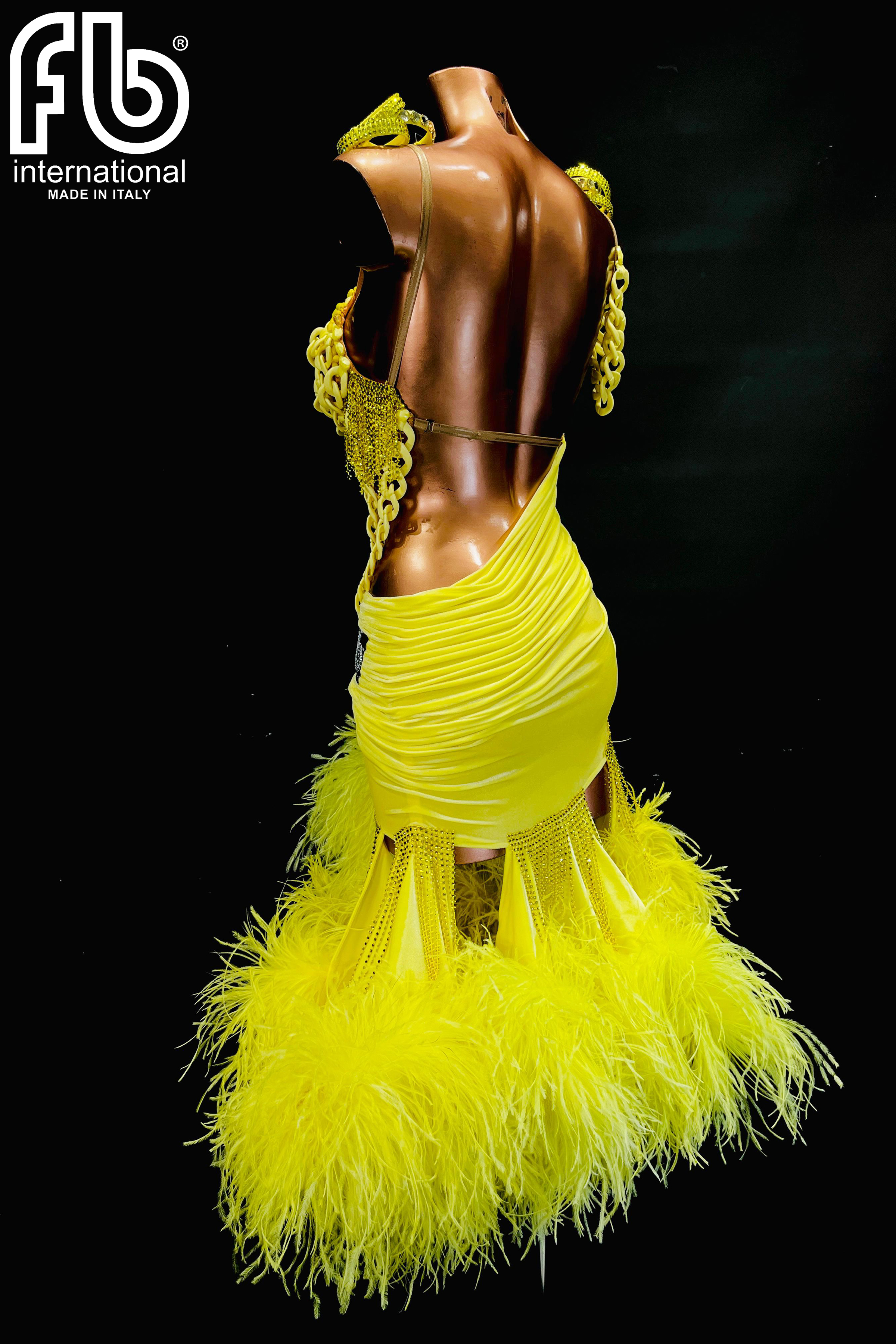 Abito per danze latine in velluto giallo drappeggiato su seno e fianco sinistro per dare volume. Gonna con boa di piume di struzzo e rete di strass color Citrine che danno movimento, rifinita con crine. Diverse catene leggere sono cucite a mano per un look moderno e movimento, mentre le aperture lo rendono più sexy. Un ricamo di pietre e fili di perline, la rete di strass ed il colore giallo sgargiante illuminano l'abito, rendendolo molto visibile in pista.