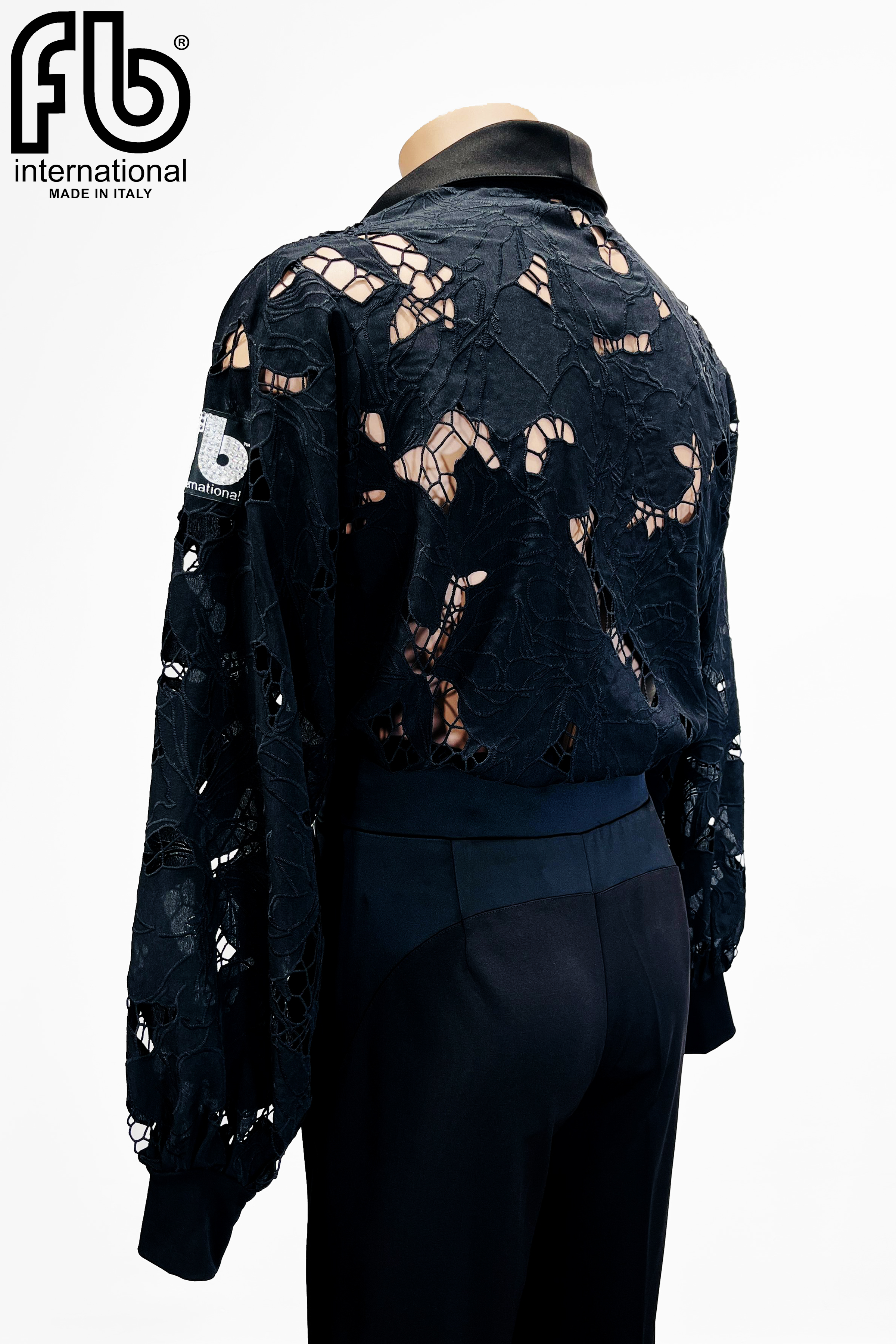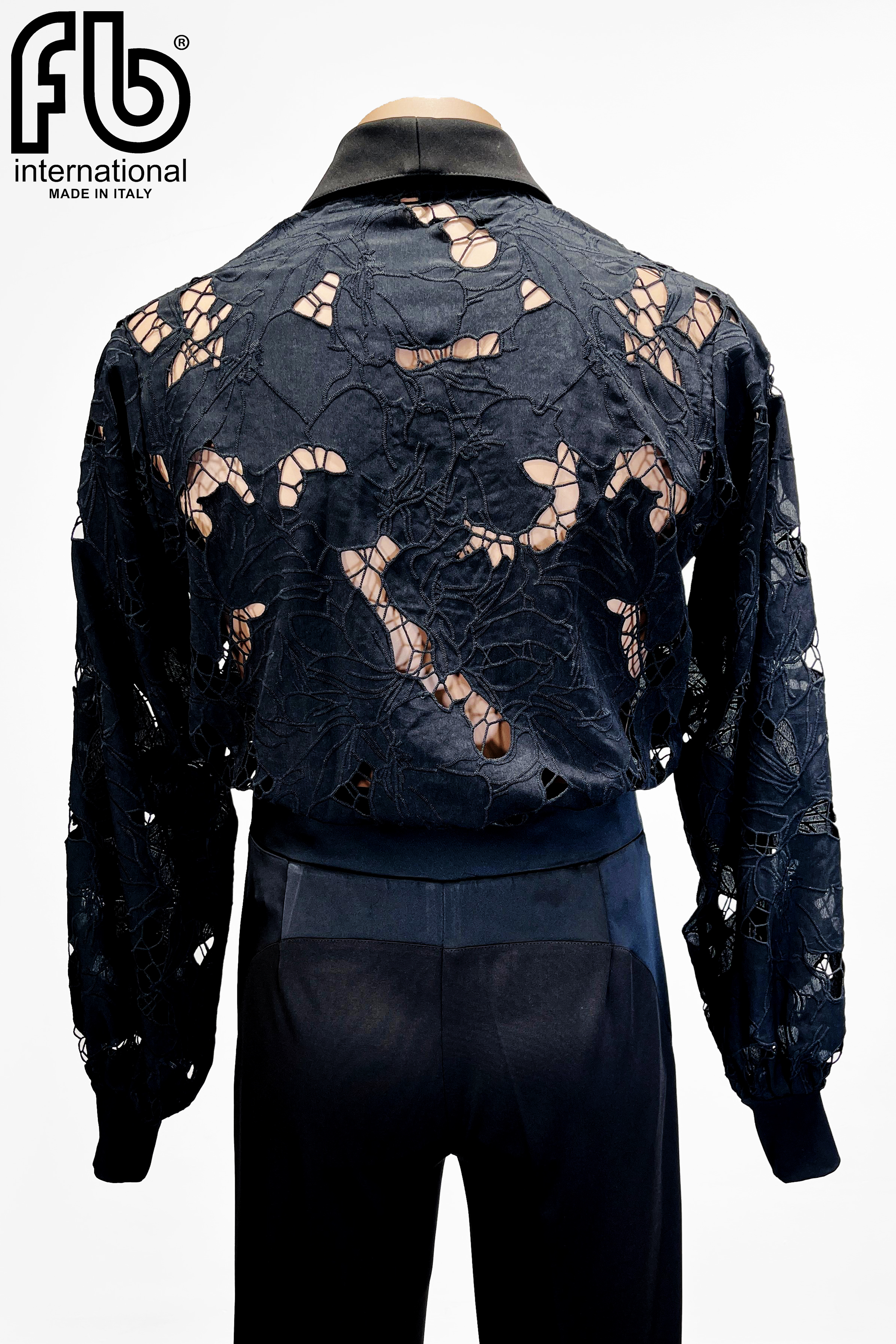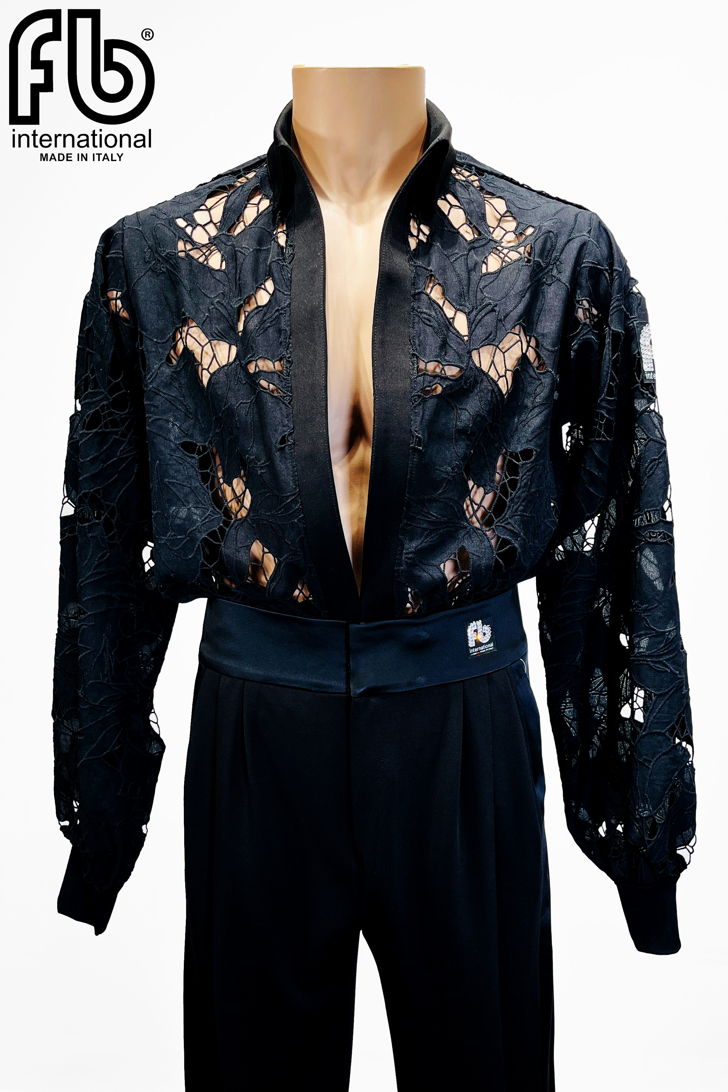 Camicia da uomo per danze latine realizzata in pizzo nero con vestibilità morbida.
