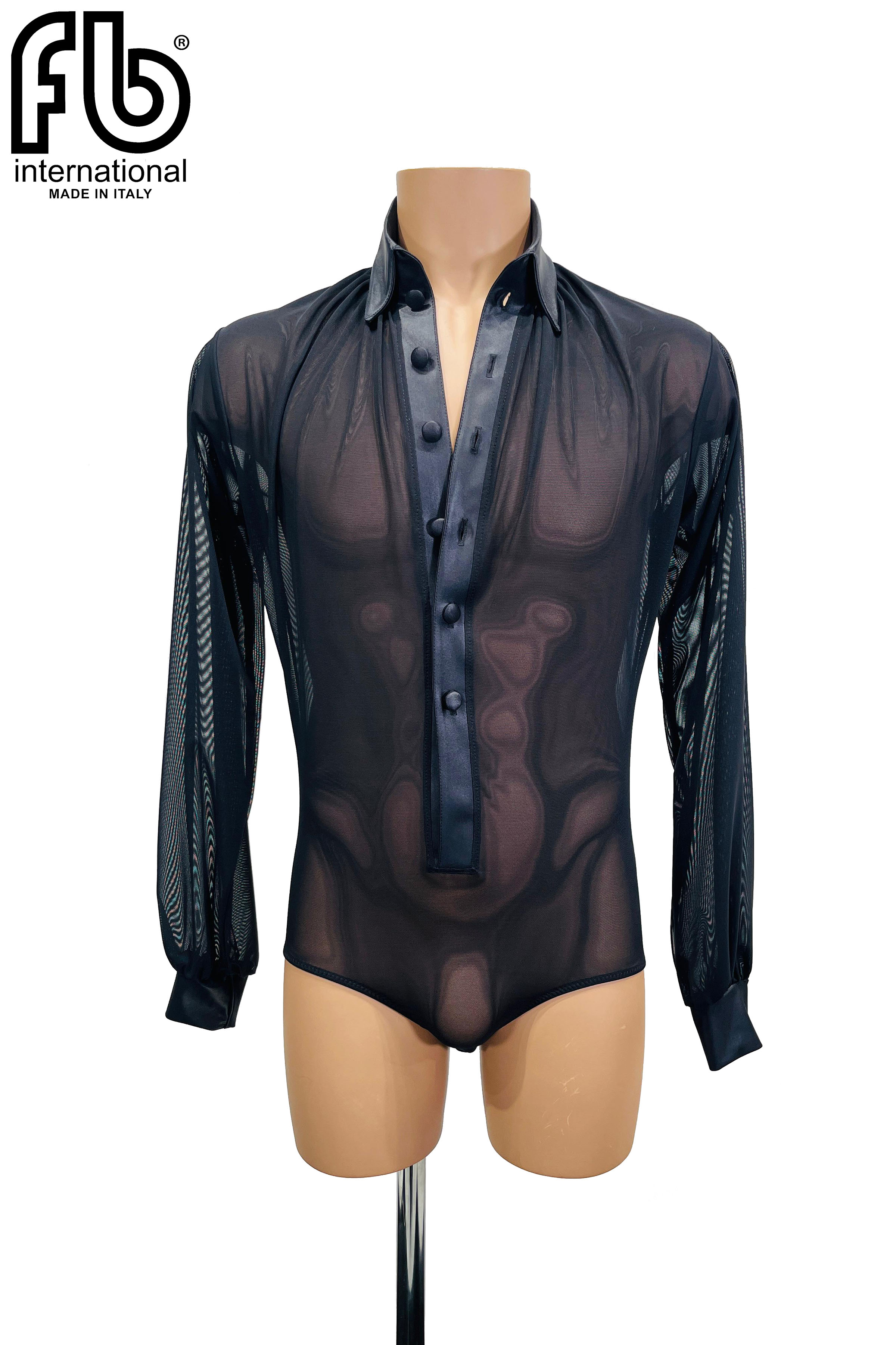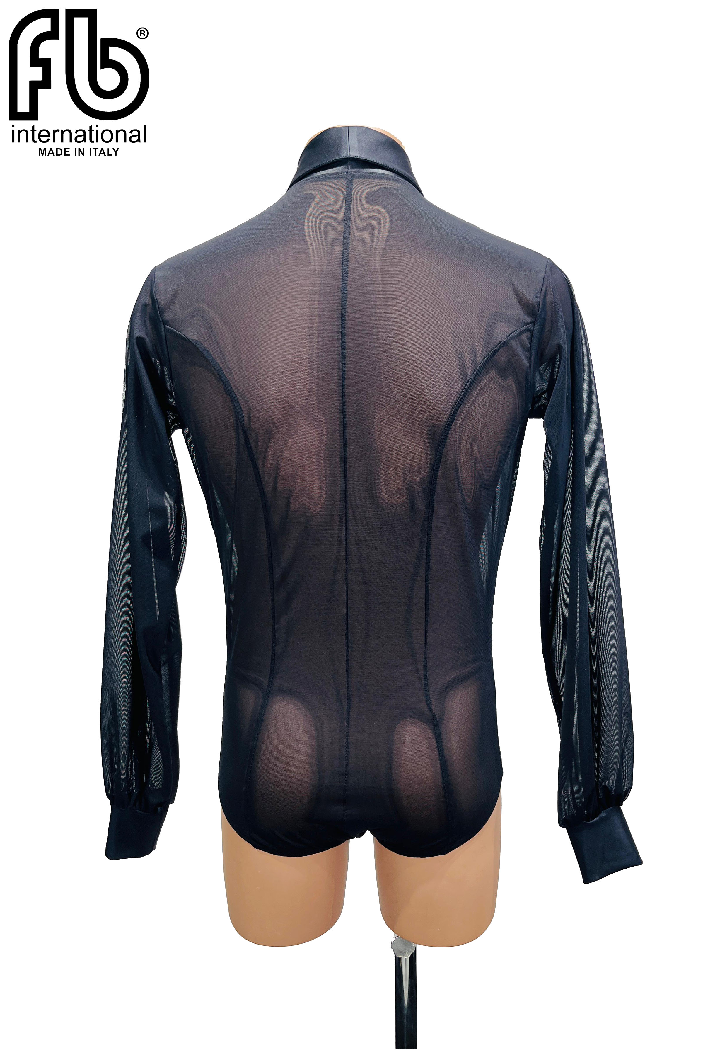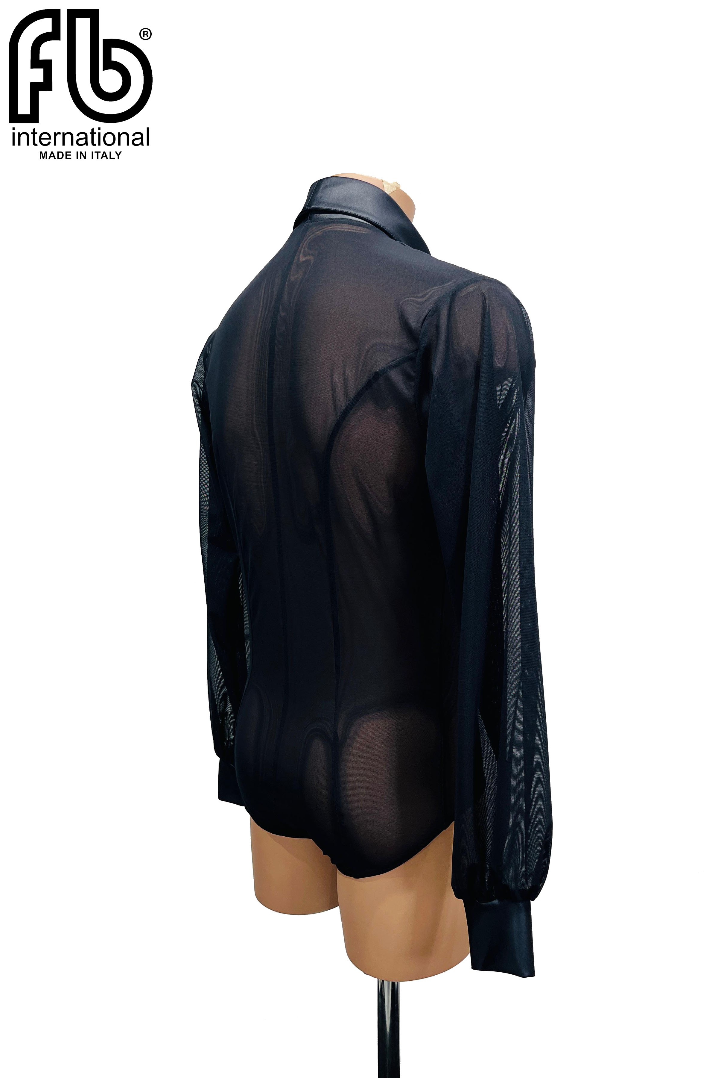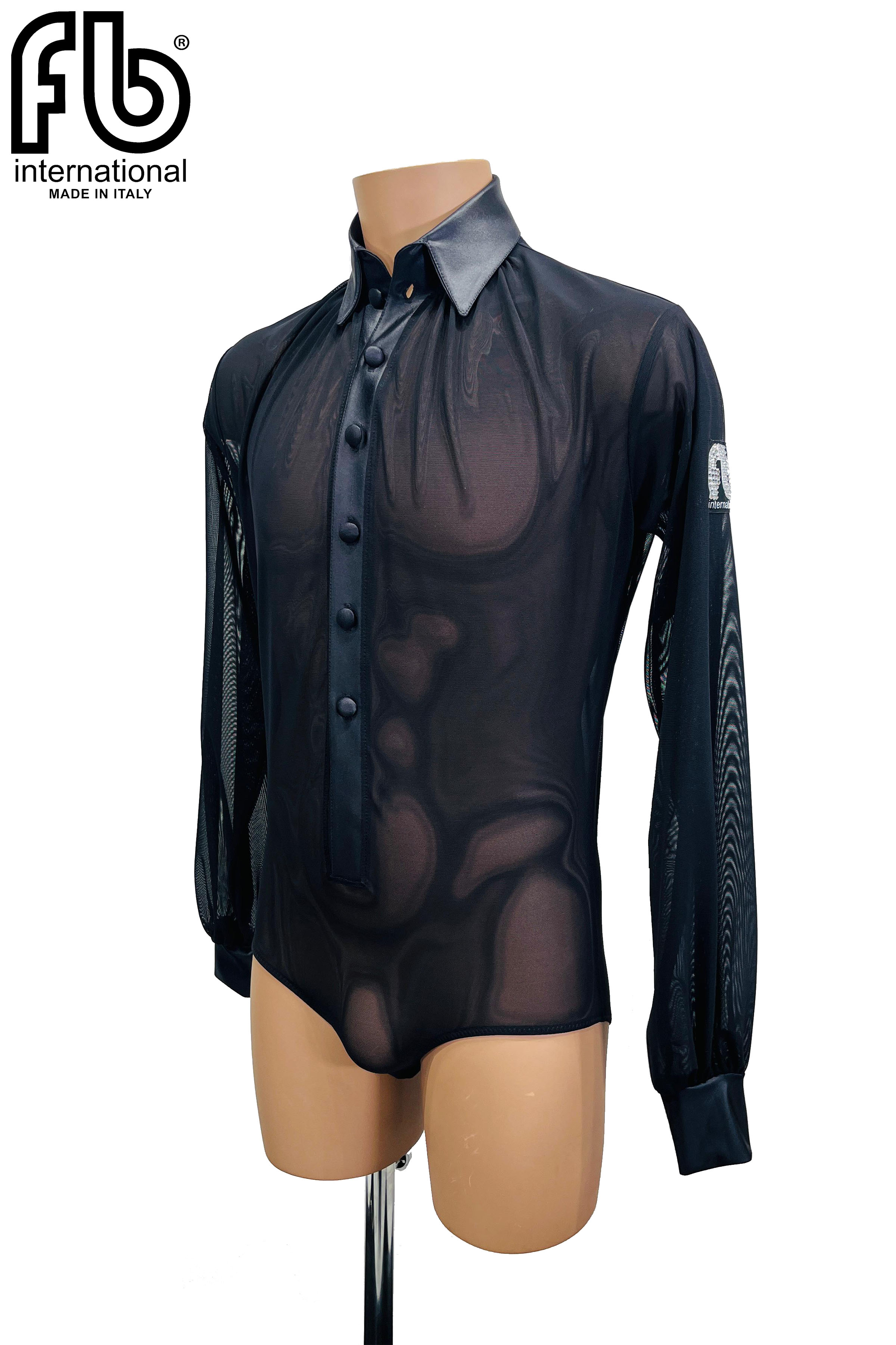 Camicia da uomo per danze latine realizzata in retina nera e raso con bottoni in raso.
