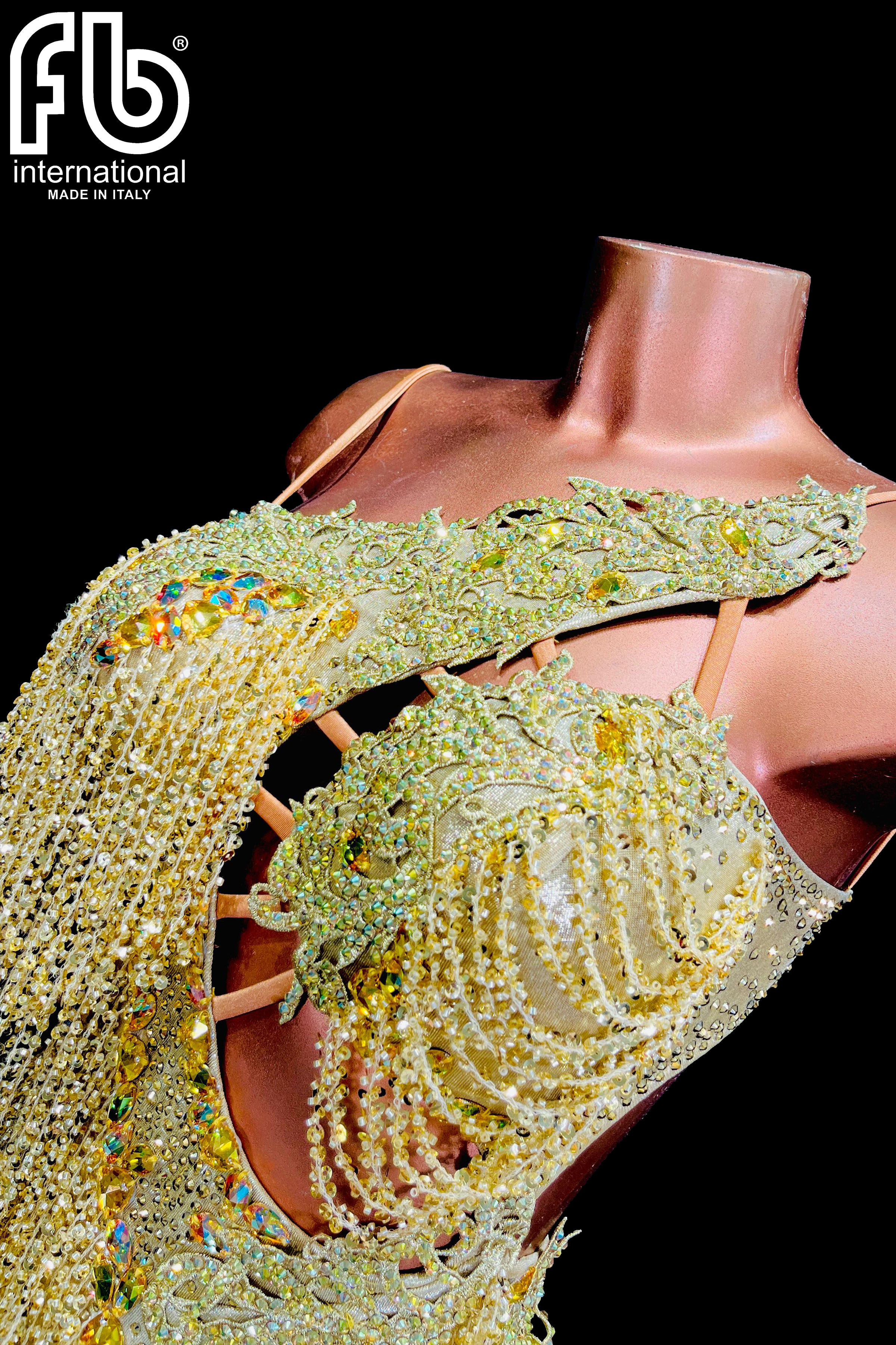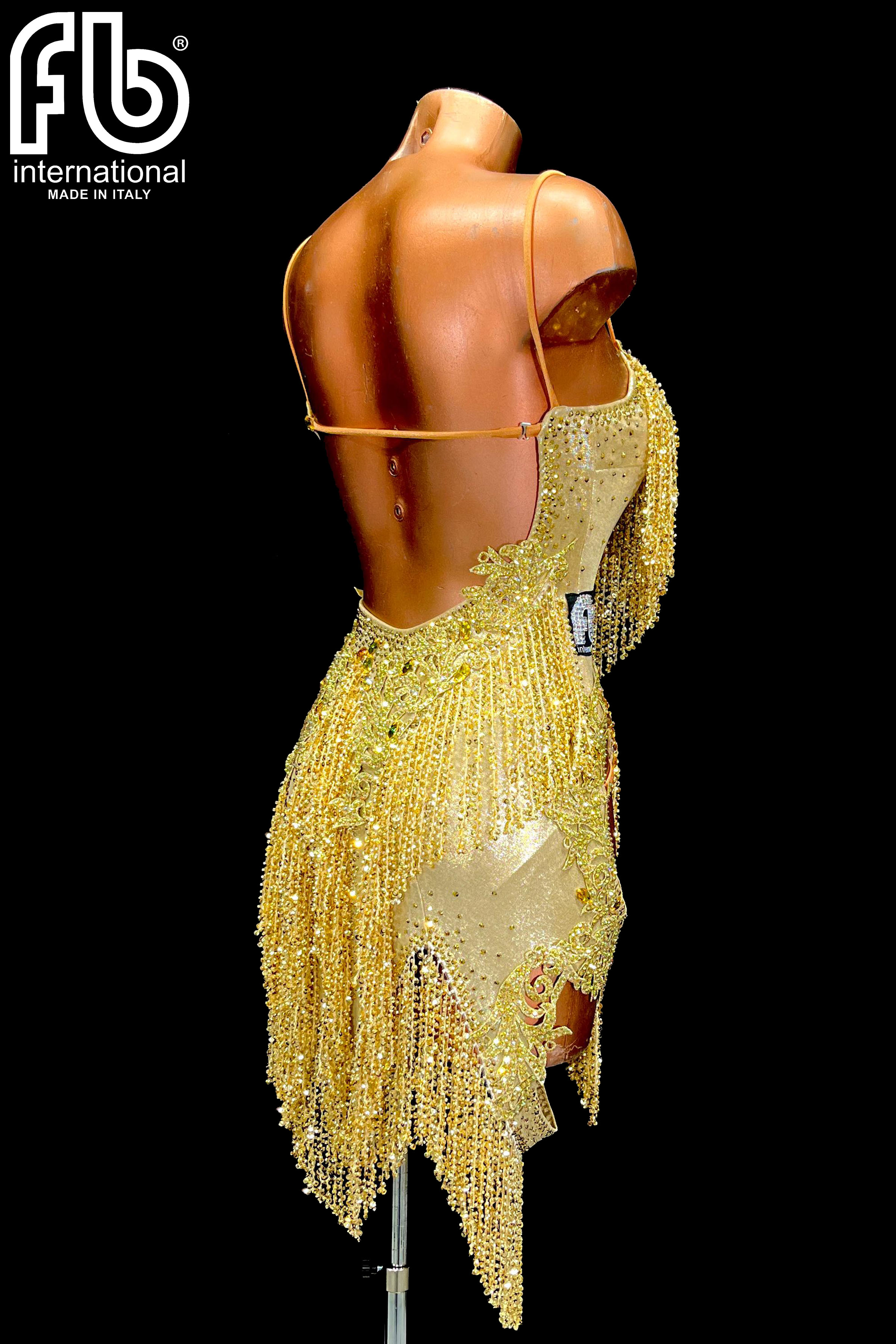 Abito da donna per danze latine realizzato in lycra oro con applicazioni in pizzo rifinite da strass, il tutto è adornato da crine di paillettes che rendono il vestito spumeggiante e divertente.