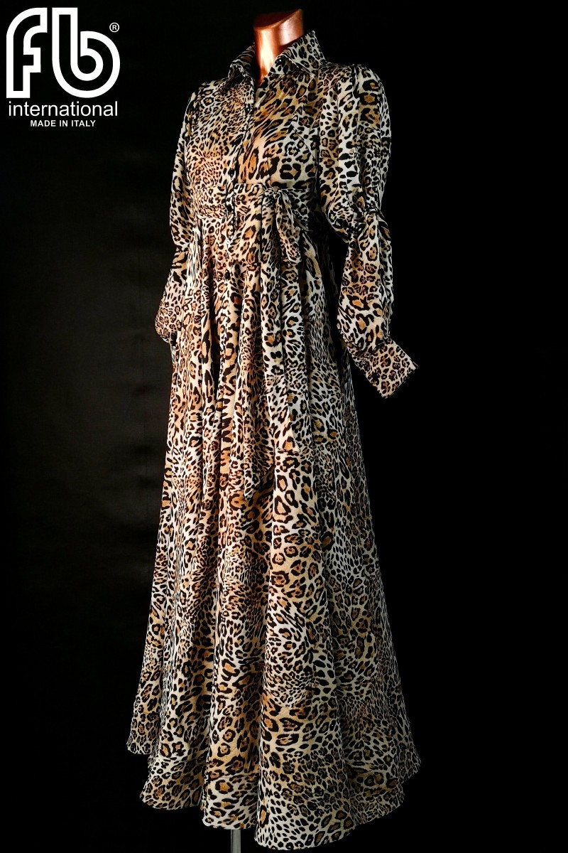 Abito da sera/cerimonia/cocktail realizzato in stoffa leopardata, dalle linee morbide ed eleganti, design con cinta in vita, polsini e scollo a camicia con bottoni neri gioiello.