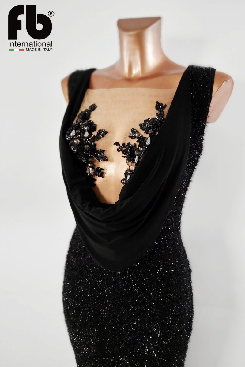 Abito da sera/cerimonia/cocktail realizzato in tessuto nero elasticizzato effetto glitter. Modello lungo smanicato, con scollo in retina e ricamo di pietre e perline.