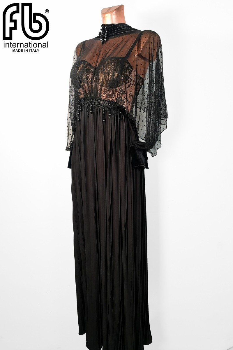 Abito da sera/cerimonia/cocktail con gonna lunga in plissato nero elasticizzato, top velato a pois con bustino color carne e pizzo nero, linee morbide ma eleganti con delicato ricamo di perline.