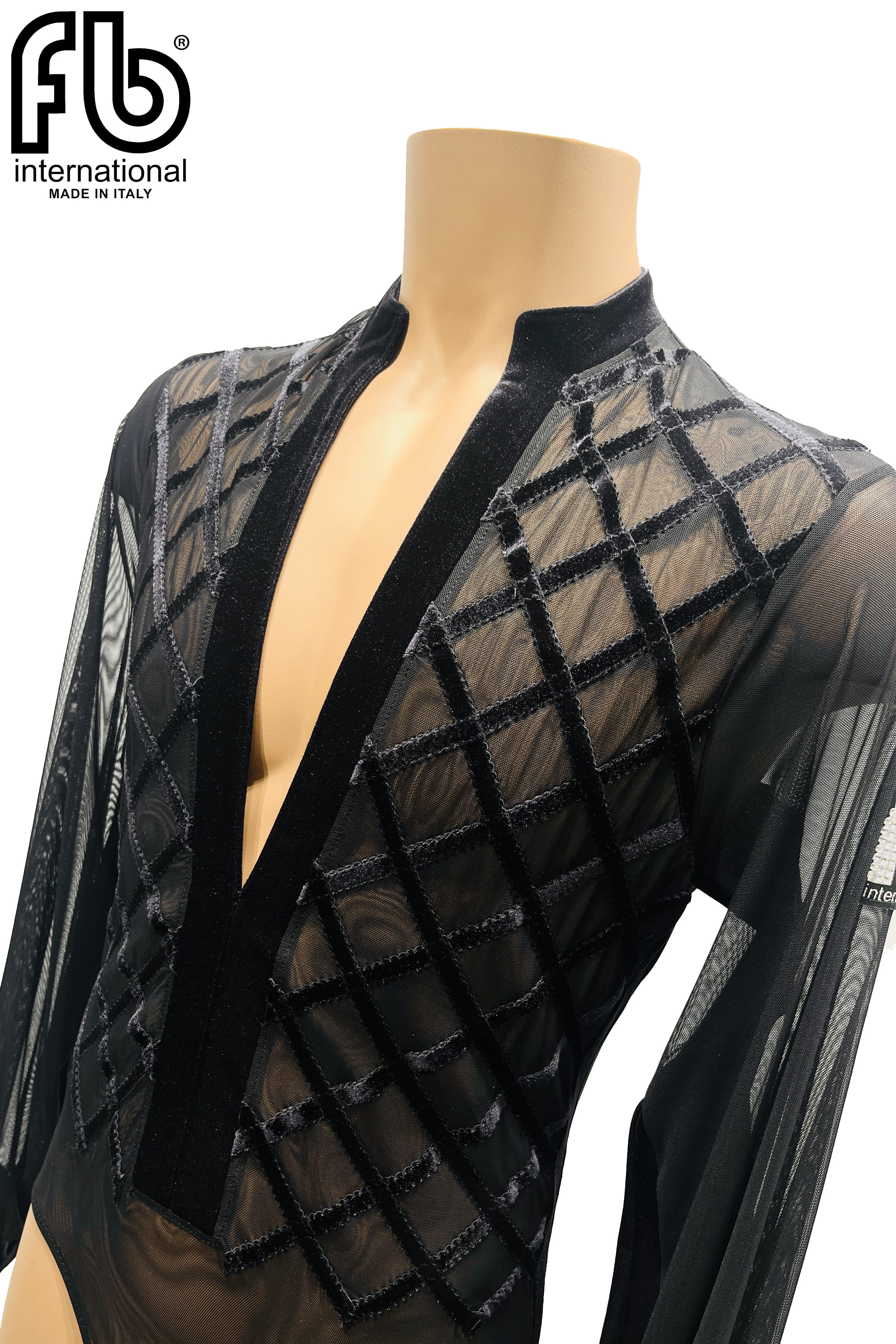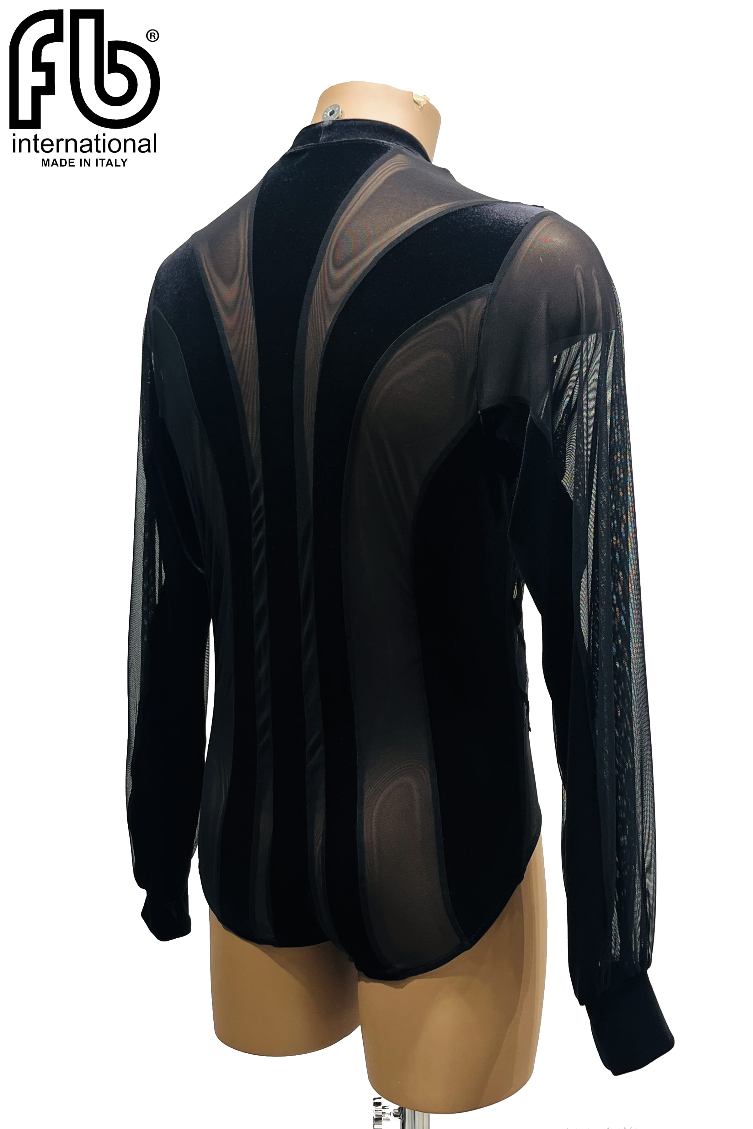 Camicia per danze latine, FB INTERNATIONAL, in retina e strisce di velluto nero intrecciate, scollo alla coreana.